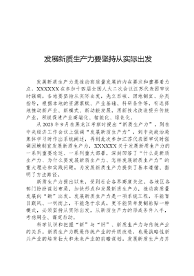 发展新质生产力要坚持从实际出发发展新质生产力是推动高质量发展的内在要求和重要着力点。XXXXXX在参加十四届全国人大二次会议江苏代表团审议时强调,各地要坚持从实际出发,先立后破、因地制宜、分类指导,根据本地的资源禀赋、产业基础、科研条件等,有选择地推动新产业、新模式、新动能发展,用新技术改造提升传统产业,积极促进产业高端化、智能化、绿色化。 从2023年9月在黑龙江考察时提出新质生产力,到在中央经济工作会议上强调发展新质生产力,到中央政治局集体学习时作出系统阐述,再到此次参加江苏代表团审议时强调因地制宜发展新质生产力,XXXXXX关于发展新质生产力的一系列重要论述、一系列重大部署,深刻回答了什么是新质生产力、为什么要发展新质生产力、怎样发展新质生产力的重大理论和实践问题,为发展新质生产力提供了基本遵循、指明了方法路径。 新质生产力提出以来,受到社会各界高度关注。各地区各部门纷纷谋划布局,加快形成和发展新质生产力,推动高质量发展向新出发。发展新质生产力是一项系统工程,不能盲目跟风、一哄而上,不能急于求成,更不能简单复制粘贴一种模式,必须坚持从实际出发,从新质生产力的形成条件入手,考虑周全、谋定后动。 科学认识和把握新与旧、新质生产力与传统产业的关系。新质生产力既是传统产业的升级改造,也是战略性新兴产业的培育壮大和未来产业的前瞻谋划。发展新质生产力并非忽视或放弃传统产业,而是用新技术改造提升传统产业,积极促进产业高端化、智能化、绿色化,统筹推进传统产业升级、新兴产业壮大、未来产业培育。否则,不仅会把手里吃饭的家伙先扔了,还会什么热门就投什么或毫无重点地撒胡椒面,造成资源浪费和新的过剩产能。在新的经济增长模式尚未完全建立的情况下,不能脱离实际、急功近利,也不能因循守旧、故步自封,而是要在稳定经济增长的同时,积极推进新质生产力的发展。只有确保新旧动能有序转换,才能避免经济出现大的波动,实现平稳健康发展。 制定符合自身特点的发展策略,充分激发内生动力。各地资源禀赋、产业基础、科研条件千差万别,发展过程中不能一刀切、齐步走,要立足差异化创新能力和产业需求,统筹推进科技创新和产业创新。科研基础雄厚、创新能力强的地区,应紧跟全球科技发展趋势,聚焦人工智能、大数据、云计算、生物技术等前沿领域,加大研发投入,突破核心技术。以传统产业为主导的地区,要注重改造提升,加快汇聚产学研用资源,推动创新链、产业链共融共舞。同时,加强区域合作,实现资源共享、优势互补,共同打造具有国际竞争力的产业集群。 针对不同地区、不同行业、不同企业进行分类指导,实现精准施策。不同地方的发展阶段不同,新质生产力发展也会呈现不同的区域特征。实现加快形成和发展新质生产力的目标,要根据实际情况和具体问题,因地制宜地采取相应的措施和方法,科学选择发展新质生产力的路径和方式。东部地区经济基础较好,应鼓励其发挥示范引领作用,加大科技创新力度,发展高端制造业和现代服务业。注重提升传统产业,推动传统产业升级改造,实现新旧动能有序转换。中西部地区资源禀赋各异,产业基础相对薄弱,应鼓励其立足自身实际,发挥比较优势,发展特色产业和优势产业。注重引进先进技术和管理经验,提升产业层次和竞争力,实现跨越式发展。文可居文库——海量学习资料,手机电脑均可下载www.wenkeju.com文可居文库——海量学习资料,手机电脑均可下载www.wenkeju.com
