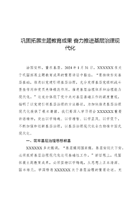 巩固拓展主题教育成果 奋力推进基层治理现代化治国安邦,重在基层。2024年1月31日,XXXXXX在关于巩固拓展主题教育成果的重要讲话中指出,要持续夯实基层基础,推进以党建引领基层治理,充分发挥基层党组织战斗堡垒作用和党员先锋模范作用,推进基层治理体系和治理能力现代化。这充分体现了党中央对基层基础工作的高度重视,指明了以党建引领基层治理的方法路径,为加快推进基层治理现代化提供了根本遵循。我们要深入学习领会XXXXXX重要讲话精神,突出以学铸魂、以学增智、以学正风、以学促干,不断加强和创新基层治理,以基层治理现代化全力助推中国式现代化。一、筑牢基层治理思想根基XXXXXX多次强调,基层强则国家强,基层安则天下安,必须抓好基层治理现代化这项基础性工作。新征程上,巩固拓展主题教育成果,必须坚持以学铸魂,从思想上正本清源、固本培元,学深悟透XXXXXX关于基层治理的重要论述,充分认识抓好基层治理的重大意义,切实增强推进基层治理现代化的思想自觉、政治自觉和行动自觉。推进基层治理现代化是厚植党的执政根基的必然要求。基础不牢,地动山摇。XXXXXX指出,基层是党的执政之基、力量之源巩固党的执政基础,必须把基层基础夯实,并强调如果社会治理跟不上经济发展步伐,各种社会矛盾和问题得不到有效解决,不仅经济发展难以为继,整个社会也可能陷入动荡。XXXXXX的这些重要论述,站在治国安邦、管党兴党的高度,深刻昭示了基层治理的有效性不仅事关国家治理的有效性,也事关党执政的稳定性。我们要学深悟透其中的核心要义,坚持把抓基层打基础作为长远之计和固本之策,切实加强党对基层治理的全面领导,凝心聚力、强基固本,将矛盾纠纷化解在基层,将和谐稳定创建在基层,确保党的执政根基坚如磐石、坚不可摧。推进基层治理现代化是满足人民对美好生活向往的现实需要。天下顺治在民富,天下和静在民乐。XXXXXX深刻指出,民心是最大的政治要把服务群众、造福群众作为基层治理的出发点和落脚点。特别是围绕开展好这次主题教育XXXXXX多次强调,要践行宗旨为民造福,把惠民生、暖民心、顺民意的工作做到群众心坎上。XXXXXX的这些重要论述,充文可居文库——海量学习资料,手机电脑均可下载www.wenkeju.com分彰显了深厚的为民情怀、坚定的宗旨意识,为加强和推进基层治理提供了行动指南。我们要学深悟透其中的精神实质,继续走好新时代群众路线,全力办好惠民好事,破解民生难题,化解社会矛盾,更好满足群众多层次、差异化、个性化需求,让群众的获得感、幸福感、安全感更加充实、更有保障、更可持续。推进基层治理现代化是实现国家治理体系和治理能力现代化的必然选择。XXXXXX指出,一个国家治理体系和治理能力的现代化水平很大程度上体现在基层,要不断夯实基层社会治理这个根基。当前,随着经济社会快速发展,社会结构日趋多样、价值取向日趋多元、利益诉求日趋多变,基层治理中的风险因素明显增加,传统治理手段与精细化治理要求不相匹配,给基层治理甚至国家治理带来了许多新的挑战。对此,XXXXXX强调,要以共建共享为基本原则,在体制机制、政策制度上系统谋划。XXXXXX的这些重要论述,着眼推进国家治理体系和治理能力现代化,对破解基层治理难题提供了方向指引。我们要学深悟透其中的丰富内涵和实践要求,不断创新思路理念,优化完善体制机制,积极探寻方法路径,切实补齐基层治理短板弱项,以基层善治为大国之治做好强力支撑。文可居文库——海量学习资料,手机电脑均可下载www.wenkeju.com二、创新基层治理思路举措XXXXXX强调,着力完善城乡基层治理体系,构建党组织领导的共建共治共享的基层治理格局。新征程上,巩固拓展主题教育成果,推进基层治理现代化,必须坚持以学增智,不断从党的创新理论中悟规律、明方向、学方法、增智慧,进一步创新基层治理思路举措,深化以党建引领基层治理,推动多元主体共建共治,全面提升基层治理的系统性、整体性和协同性。加强党对基层治理的全面领导。XXXXXX指出,把加强基层党的建设、巩固党的执政基础作为贯穿社会治理和基层建设的一条红线推进以党建引领基层治理。党的十八大以来,中央先后出台《关于加强基层治理体系和治理能力现代化建设的意见》等政策文件,强力部署推进以党建引领基层治理,有力提升了治理的整体效能。但也要看到,目前党建引领基层治理组织领导体系尚不够健全,实际工作运行缺乏有效的平台抓手,党建引领存在被泛化、虚化的倾向。巩固拓展主题教育成果,推进基层治理现代化,要牢牢抓住党领导基层治理这条主线,进一步筑体系,结合各级社会工作部陆续组建运行,整合基层治理资源力量,推动党的组织体系与基层治理体系有机融合;进一步强堡垒,创新党组织设置和活动方式,推动党建向基层治理新领域、新