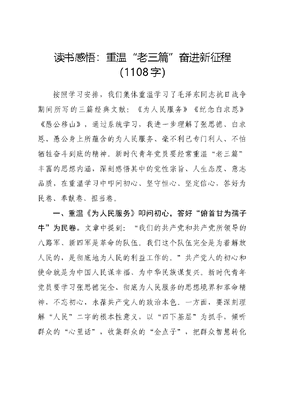 读书感悟:重温老三篇奋进新征程(1108字)按照学习安排,我们集体重温学习了毛泽东同志抗日战争期间所写的三篇经典文献:《为人民服务》《纪念白求恩》《愚公移山》,通过系统学习,我进一步理解了张思德、白求恩、愚公身上所蕴含的为人民服务、毫不利己专门利人、不怕牺牲奋斗到底的精神。新时代青年党员要经常重温老三篇丰富的思想内涵,深刻感悟其中的党性宗旨、人生态度、意志品质,在重温学习中叩问初心、坚守恒心、坚定信心,答好为民卷、奉献卷、担当卷。一、重温《为人民服务》叩问初心,答好俯首甘为孺子牛为民卷。文章中提到:我们的共产党和共产党所领导的八路军、新四军是革命的队伍。我们这个队伍完全是为着解放人民的,是彻底地为人民的利益工作的。共产党人的初心和使命就是为中国人民谋幸福、为中华民族谋复兴。新时代青年党员要学习张思德完全、彻底为人民服务的思想境界和革命精神,不忘初心,永葆共产党人的政治本色。一方面,要深刻理解人民二字的根本性意义,以四下基层为抓手,倾听群众的心里话,收集群众的金点子,把群众智慧转化为高质量发展的强劲动能。另一方面,要强化公仆意识,做到权为民所用,情为民所系,利为民所谋,在实践中擦亮为民坐标,持之以恒为人民群众办实事、解难题。二、重温《纪念白求恩》坚守恒心,答好留取丹心照汗青奉献卷。毛泽东同志呼吁全党同志学习白求恩精神,做一个高尚的人、一个纯粹的人、一个有道德的人。新时代青年党员要自觉从白求恩同志的事迹中汲取精神力量,自觉传承弘扬毫不利己、专门利人、国际主义、精益求精的精神,在工作中兢兢业业、脚踏实地,追求卓越、臻于至善,切实扛稳为X的政治责任。要心怀国之大者,深刻领会把握X储备战略保障、宏观调控、应对急需的核心要义,以极端负责的工作态度、极端热忱的工作作风,重实效、强实干、抓落实,当好大国储备护卫者和接班人,用实际行动确保X、能源资源、重要产业链供应链安全。三、重温《愚公移山》坚定信心,答好重任千钧再出发担当卷。下定决心、不怕牺牲、排除万难,去争取胜利,体现了中华民族知难而进、艰苦奋斗的精神,体现了共产党人坚定信念、勇往直前的品质,回答了共产党人应该怎么做的问题。党的十八大以来,XXXXXX多次强调要弘扬愚公移山精神,新时代青年党员要牢记谆谆教诲,传承愚公坚韧不文可居文库——海量学习资料,手机电脑均可下载www.wenkeju.com拔的精神品质,在实现中华民族伟大复兴、X事业高质量发展的进程中,实干笃行、挺膺担当,迎难而上、奋力攀登,跨越雪山和草地、征服娄山关和腊子口。要敢于担当、善于担当,遇到问题不逃避、面对困难不退缩,以持之以恒的毅力、突破自我的勇气书写新时代愚公传奇。文可居文库——海量学习资料,手机电脑均可下载www.wenkeju.com