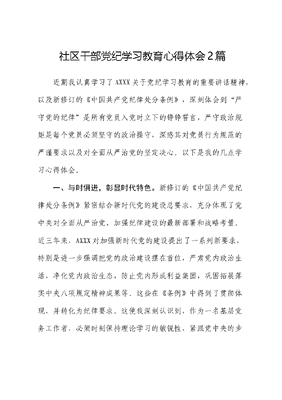 社区干部党纪学习教育心得体会2篇近期我认真学习了AXXX关于党纪学习教育的重要讲话精神,以及新修订的《中国共产党纪律处分条例》,深刻体会到严守党的纪律是所有党员入党时立下的铮铮誓言,严守政治规矩是每个党员必须坚守的政治操守,深感其对党员行为规范的严谨要求以及对全面从严治党的坚定决心。以下是我的几点学习心得体会。一、与时俱进,彰显时代特色。新修订的《中国共产党纪律处分条例》紧密结合新时代党的建设总要求,充分体现了党中央对全面从严治党、加强纪律建设的最新部署和战略考量。近三年来,AXXX对加强新时代党的建设提出了一系列新要求,特别是进一步强调把党的政治建设摆在首位,严肃党内政治生活,净化党内政治生态,防止党内形成利益集团,巩固拓展落实中央八项规定精神成果等。这些在《条例》中得到了贯彻体现,并转化为纪律要求。这使我深刻认识到,作为一名基层党务工作者,必须时刻保持理论学习的敏锐性,紧跟党中央的步伐,以适应不断变化的形势任务,确保党务工作与时代发展同频共振。二、严明纪律,强化规矩意识。新修订的《条例》进一步明确了党的纪律红线,细化了各类违纪行为及其处分规定,使纪律的高压线更加清晰可见。例如,《条例》对违反中央八项规定精神的行为处分规定进行了深化与扩展,强化了对包括违规接待、过度发放福利、未按规定程序租用或借用办公场所、违反会议活动管理制度在内的各类违规行为的处罚措施。这为全体党员划定了行为边界。在实际工作中,我将以此为指引,强化规矩意识,严格遵守党的各项纪律,同时积极引导中心党员职工树立底线思维,做到心有所畏、言有所戒、行有所止,共同营造风清气正的工作环境。三、聚焦重点,深化标本兼治。AXXX反复强调,政治纪律是最重要、最根本、最关键的纪律,要把严守政治纪律和政治规矩放在首位。新修订的《条例》对各级党组织和全体党员在政治方向、政治立场、政治言论、政治行为方面的纪律规矩进一步做了详细规定,并着重对违反政治纪律的行为加大了惩处文可居文库——海量学习资料,手机电脑均可下载www.wenkeju.com力度。这要求我们在实际工作中,既要引导党员职工坚定理想信念,始终保持正确的政治方向,又要强化政治纪律教育,做到在大是大非面前旗帜鲜明,在风浪考验面前无所畏惧,在各种诱惑面前立场坚定。四、压实责任,推动高效执行。《条例》强调了各级党组织和全体党员的责任担当。党组织必须履行全面从严治党主体责任,按照条例的新部署新要求,全力做好各项工作,确保《条例》精神落地生根、开花结果。党员要发挥表率作用,时刻牢记党员身份,严守党的纪律,主动接受组织教育管理和监督,以实实在在为民服务的工作成效彰显党员本色。党纪学习教育学习心得体会社区两委班子成员作为一名社区党员干部,近期我深入学习了《中国共产党纪律处分条例》和《中国共产党巡视工作条例》。通过系统的学习,我深刻感受到了党纪的庄严和神圣,也更加坚定了自己文可居文库——海量学习资料,手机电脑均可下载www.wenkeju.com廉洁自律、为人民服务的决心。下面,我将结合自己的学习体会,谈一谈党纪学习带给我的深刻启示。一、深学细悟,领悟党纪精髓。在党纪学习教育活动中,我认真学习了《中国共产党纪律处分条例》等相关文件,深入了解了党纪的各项规定和要求。党纪严明是我们党的优良传统和政治优势,也是我们党始终保持先进性和纯洁性的重要保障。通过学习,我更加明白了党纪的严肃性和不可违反性,党纪是高压线,任何违反党纪的行为都将受到严肃惩处。二、铭记历史,传承红色基因。在学习党纪的过程中,我还学习了革命先辈关于党纪的论述,深刻感受到了他们对党纪的严格遵守和坚定信仰。毛泽东同志曾说:加强纪律性,革命无不胜。这句话深深地震撼了我,让我更加明白严守党纪的重要性。革命先辈们严明的纪律和坚定的信仰是我们永远的精神财富。我们要铭记历史,传承红色基因,时刻以革命先辈为榜样,严守党纪,不忘初心,勇担使命。三、严守党纪,坚持廉洁从政。通过学习,我更加深刻地认识到严守党纪的重要性。党纪是全体党员必须遵守的行为准文可居文库——海量学习资料,手机电脑均可下载www.wenkeju.com则,也是我们党始终保持先进性和纯洁性的重要保障。作为一名社区工作人员,要时刻保持清醒的头脑,严守党纪底线。在今后的服务居民群众工作中,我将严格遵守党纪规定,不断加强党性修养,并且积极引导同事共同遵守党纪,共同营造风清气正的x社区工作氛围。四、以身作则,树立先锋模范。作为一名社区党员干部,不仅要严守党纪,还要以身作则、争做先锋模范。我们要时刻保持共产党员的先进性和纯洁性,做到言行一致。今后,我将以更加严格的标准要求自己,不断提高自己的业务能力和综合素质。同时,积极参加社区党支部组织的党纪学习教育各项活动,为建设更加和谐的x社区贡献自