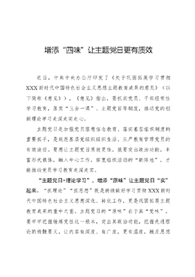 增添四味让主题党日更有质效近日,中共中央办公厅印发了《关于巩固拓展学习贯彻XXX新时代中国特色社会主义思想主题教育成果的意见》(以下简称《意见》),《意见》指出,要抓实党员、干部经常性学习教育,落实三会一课、主题党日等制度,推动党的创新理论学习走深走实走心。主题党日是加强党员理想信念教育、落实基层组织制度的重要抓手,是规范基层党组织组织生活、从严教育管理党员的有效途径。要想让主题党日质效更佳,就要突出政治功能,丰富形式载体,融入中心工作,拓宽组织活动的新阵地,才能推动党员学习教育走深走实。主题党日+理论学习,增添原味让主题党日实起来。抓理论抓思想既是持续做好学习贯彻XXX新时代中国特色社会主义思想深化、转化工作,更是巩固拓展主题教育成果的重中之重。主题党日的原味在于其党味,要牢牢把握锤炼党性这一根本,突出其政治功能,把握先进理论的精髓要义,让内容有深度、有广度,更有温度,触及思想和灵魂,形成思想上的碰撞和交流。要把握好思想政治建设总开关,以主题党日补钙铸魂,深化理论武装,把握思想之舵,补足精神之钙。将讲政治、讲规矩放在首要位置,经常开展以政治学习为内容的主题党日活动,采取学习研讨、讲专题党课、政策理论宣讲等方式,持续强化党的创新理论武装。要突出主题、明确内容,找准理论学习与中心工作的连接点,把握理论与实践的结合面,引导党员干部自觉学理论、用理论,提高政治站位,争创优良业绩,让理论学习回归原味。主题党日+组织生活,增添辣味让主题党日严起来。实践证明,党内组织生活质量决定着党支部的凝聚力战斗力。主题党日既是开展组织生活的基本形式,也是组织生活的重要载体。通过主题党日过组织生活,要不仅限于每年一次的组织生活会、民主评议党员,可根据党员教育实际、政治形势、重大工作任务等,因地制宜开展参观红色教育基地、党员过政治生日、现场承诺践诺等组织生活。要加强对形式内容、过程评价、总结落实等环节的研究策划,发扬党的优良传统,通过组织党员谈认识体会、比成长进步、开展批评与自我批评,帮助党员提神醒脑,保证思想在线,使组织生活充满辣味。文可居文库——海量学习资料,手机电脑均可下载www.wenkeju.com主题党日+民主议事,增添甜味让主题党日亮起来。基层工作千头万绪,除贯彻落实三重一大决策制度外,所有涉及基层党员群众利益、影响党群干群关系的事项,都需提交支委会会议、党员大会,严格按照民主集中制原则依法依规研究决定。要充分发挥党员干部示范效应,坚持党的一切工作到支部的鲜明导向,把民主议事作为优化基层治理结构的重要一环,引领党员干部争当执行落实、服务群众的模范。要把发展党员、职务晋升、扶危助困、推优评先等事项列入民主议事议题,既要实行党内民主,更要注重吸收群众意见,做到一事一议、事事落实,让党员群众在广泛参与民主议事中尝到甜味。主题党日+志愿服务,增添鲜味让主题党日活起来。党员志愿者服务活动是密切党群干群关系的重要服务载体。基层党组织要根据党员的工作岗位、兴趣专长、能力水平,通过养老服务、环境卫生改善、社会治安治理、大型活动等志愿服务活动,将服务人民的初心落细落小,用实际行动赢得群众好评。要将主题党日活动与我为群众办实事实践活动有机结合,引导党员干部参与文明创建党员进社区慰问老党员等各类志愿服务活动,切实解决群众关心的热点难点问题。要充分发挥党员先锋模范作用,引导广大党员承文可居文库——海量学习资料,手机电脑均可下载www.wenkeju.com诺践诺、服务一线,大力开展植树添新绿、环境大整治、情系留守儿童等主题党日活动,促进党建工作与群众工作同频共振、互促共进,让主题党日活动保持鲜味。文可居文库——海量学习资料,手机电脑均可下载www.wenkeju.com