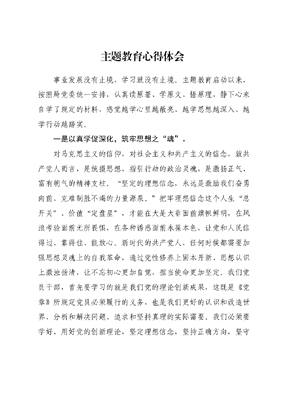 主题教育心得体会事业发展没有止境,学习就没有止境。主题教育启动以来,按照局党委统一安排,认真读原著、学原文、悟原理,静下心来自学了规定的材料,感觉越学心里越敞亮、越学思想越深入、越学行动越踏实。一是以真学促深化,筑牢思想之魂。对马克思主义的信仰,对社会主义和共产主义的信念,就共产党人而言,是统摄思想、指引行动的政治灵魂,是激扬正气、富有朝气的精神支柱。坚定的理想信念,永远是激励我们奋勇向前、克难制胜不竭的力量源泉。把牢理想信念这个人生总开关、价值定盘星,才能在大是大非面前旗帜鲜明,在风浪考验面前无所畏惧,在各种诱惑面前永葆本色,让党和人民信得过、靠得住、能放心。新时代的共产党人,任何时候都需要加强思想灵魂上的自我革命,通过党性修养上固本开新、思想认识上激浊扬清,让不忘初心更加自觉,担当使命更加坚定。我们党员干部,首先要学习的就是我们党的理论创新成果,这既是《党章》所规定党员必须履行的义务,也是我们更好的认识和改造世界、分析和解决问题、追求和坚持真理的实际需要。我们必须要学好、用好党的创新理论,坚定理想信念,坚持正确方向,坚守初心使命,补足信仰之钙,打好信念之铁,炼出意志之钢。在思想和行动上与党中央保持高度一致,始终沿着正确的方向前行。二是以真信促融化,搭好进步之梯。知识就是力量,是人类文明进步的阶梯。习XXX强调,干部要认真学习各方面知识,丰富知识储备,完善知识结构,打牢履职尽责的知识基础。2018年5月,他在北京大学师生座谈会上指出:知识是每个人成才的基石,在学习阶段一定要把基石打深、打牢要通过学习知识,掌握事物发展规律,通晓天下道理,丰富学识增长见识。我们党员干部,特别是领导干部,在打好理论功底的基础上,不能偏安一隅,更不能做井底之蛙,必须要扩大知识面,成为多面手,不要求在所有领域都成为专家,但至少要对XXX提出的各方面知识有基础的认识和了解。我们每个人随着成长进步,或者按照组织安排,都可能调整工作岗位,甚至可能调整到其他部门、其他地区,提升知识储备的全面性既是我们个人成长进步的客观需要,也是新时期对领导干部提出的新要求。三是以真用促转化,夯实事业之基。有了扎实的理论基础和深厚的知识功底,接下来就是要钻研业务,成为各自领域里的行家里手。我们工作是专业性极强的工作,无论是安全生产、防灾减灾,还是应急救援,如果在专业性上过不了关,往小了说是影响工作、影响形象,往大了说就是对党和国家的事业不负责、对人民群众的生命财产安全不负责。要提高专业能力,就是要加强学习,首要的就是加强对XXX重要讲话重要论述、重要指示批示精神的学习。党的十八大以来,党中央高度重视重大风险防范化解工作。习XXX在不同场合多次XX工作作出重要讲话、重要指示和批示,形成了一系列重要论述,特别是提出了人民至上、生命至上的理念,为我们做好工作提出了总体要求、指明了总体方向、提供了根本遵循,只有持续深入学习、及时跟进学习,才能确保我们工作信心不减、工作方向不偏工作目标不变、工作干劲不松。在此基础上,我们还要加强对法律法规和政策文件的学习。法律法规和政策文件是我们开展工作的依据和抓手,只有对这些方面的知识了然于胸,才能明确我们的工作职责和定位是什么、我们的工作边界和重心在哪里、我们的工作方法和措施有哪些,才能对上级决策部署进行有效落实、对本级工作进行科学分解、对下级落实进行有效指导。与此同时我们还要加强对各自行业领域专业知识的学习。我们虽然建立了专家库,但只有我们首先成为各自行业领域的专家,才能对专家给出的意见进行科学分析,才能为领导决策提供科学的意见建议,才能真正发挥我们政府部门的专业作用。