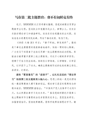 写在第二批主题教育:靡不有初鲜克有终近日,XXXXXX在江西考察时强调,要把实的要求贯穿主题教育全过程,坚决防止和克服形式主义、官僚主义,实实在在抓好理论学习和调查研究,实实在在检视整改突出问题,实实在在办好惠民利民实事,用实干推动发展、取信于民。《诗经·大雅·荡》有言:靡不有初,鲜克有终,指的是干事创业最重要的是能够善始善终,保持一贯的初心热情。广大党员干部要善于总结运用第一批主题教育的成功经验,承前启后高质量开展第二批主题教育,内化于心做到真学真信,躬耕于行奋力创出实绩,持续在以学铸魂、以学增智、以学正风、以学促干上下功夫,确保主题教育形成的长效机制立得住、落得实、行得远。避免雾里看花的虚架子,以扎扎实实的理论学习助推第二批主题教育入脑入心。思想上的统一是党的团结统一最深厚最持久最可靠的保证,理论学习是坚定理想信念的根本途径,XXXXXX曾指出,中国共产党人依靠学习走到今天,也必然要依靠学习走向未来。基层党组织要把开展第二批主题教育作为重要政治任务紧紧抓在手上,层层压实责任,加强督促指导,坚持统筹兼顾,要科学统筹安排理论学习,精心组织扎实推动,合理制定计划表、精细谋划线路图,依托三会一课、主题党日等灵活多样的方式开展学习,促使基层党员夯实理论功底,筑牢思想根基。第二批主题教育在基层开展,如何沉下去是关键,要积极推动党的创新理论进机关、进学校、进企业,积极探索交流研讨、宣讲阐释、案例教学等方法,不拘泥于形式、不拘泥于书本,引导党员干部职工在学懂弄通做实上下功夫,力争在理论学习上有进步、有收获。避免眼花缭乱的虚招式,以踏踏实实的调查研究助推第二批主题教育走深走实。今年以来,XXXXXX不断用脚步丈量基层的冷暖,从祖国大陆最南端的广东徐闻港到神州北极黑龙江漠河,从东部长三角地区的江苏到西部边陲新疆,深入基层开展调研,虚心听取群众意见,谋划推动了一系列重大战略决策,为全党树立了光辉典范。第二批主题教育开展单位和人员范围广、类型多、数量大,同群众的联系更直接,群众期待解决的问题更具体,如何把主题教育的成果转化为实际行动,是回应群众需求、推动解决问题的关键。广大党员干部要立足主责主业,拿出挤和钻的精神,提升本领能力、强化担当作为,深入基层一线听真话、察真情,要坚持以人民群众满不满意作为检验工作成效的标尺,做到真正发现和解决一批实际问题,真正办成一批民生实事,真正解决人民群众最关心最直接最现实的利益问题,让为民服务步履不停。避免昙花一现的虚功绩,以老老实实的检视整改助推第二批主题教育见行见效。抓好检视整改,前提是要精准查摆问题,明确改什么。《中共中央关于在全党深入开展学习贯彻XXX新时代中国特色社会主义思想主题教育的意见》列举了要着力解决的理论学习、政治素质、能力本领、担当作为、工作作风、廉洁自律等6个方面突出问题,广大党员干部要自觉对标对表,敢于直面问题、正视问题,不掩盖、不回避、不推脱,就问题论问题,做到真找问题、找真问题。对于查摆出来的问题,要明确怎么整改有效如何改出成效,当然也不能急于求成一锅端,盲目地追求整改时效,而忽略整改质量,要将问题分门别类厘清先后,对于能马上改的问题坚决不拖,对于一时解决不了的问题坚决不松,对于长期存在的问题坚决不放,要制定专项整治方案,采取台账式管理、项目化推进,完成一个、销号一个。只要敢于动真碰硬、攻坚克难、一抓到底,就能够真正做到取信于民,真正推动主题教育走深走实。
