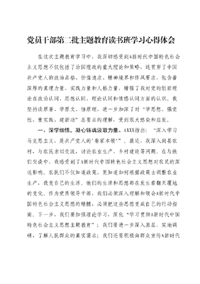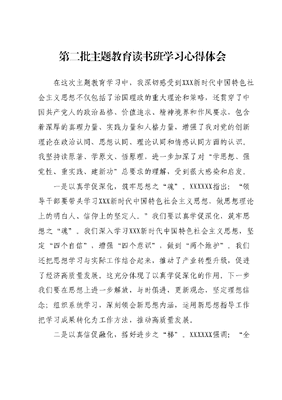 第二批主题教育读书班学习心得体会在这次主题教育学习中,我深切感受到XXX新时代中国特色社会主义思想不仅包括了治国理政的重大理论和策略,还贯穿了中国共产党人的政治品格、价值追求、精神境界和作风要求,包含着深厚的真理力量、实践力量和人格力量,增强了我对党的创新理论在政治认同、思想认同、理论认同和情感认同方面的认识。我坚持读原著、学原文、悟原理,进一步加深了对学思想、强党性、重实践、建新功总要求的理解,受到很大感染和启发。一是以真学促深化,筑牢思想之魂。XXXXXX指出:领导干部要带头学习XXX新时代中国特色社会主义思想,做思想理论上的明白人、信仰上的坚定人。我们要以真学促深化,筑牢思想之魂。我们深入学习XXX新时代中国特色社会主义思想,坚定四个自信,增强四个意识,做到两个维护。我们还把思想学习与实际工作结合起来,推动了产业转型升级,促进了经济高质量发展。这充分体现了以真学促深化的作用。下一步我们要在思想上进一步解放,与时俱进,更新观念,坚定理想信念;组织系统学习,深刻领会新思想内涵,运用新思想指导工作把学习成果转化为工作方法,推动高质量发展。二是以真信促融化,搭好进步之梯。XXXXXX强调:全党同志要增强四个意识、坚定四个自信、做到两个维护,自觉在思想上政治上行动上同以XXX同志为核心的党中央保持高度一致。我们要以真信促融化,搭好进步之梯。我们坚决维护以XXX同志为核心的党中央权威,在思想上政治上行动上同党中央保持高度一致,取得了各项工作新的进步。这充分体现了以真信促融化的正能量。下一步,我们要坚定信仰新思想,增强四个意识、坚定四个自信、做到两个维护;在思想上政治上行动上同党中央保持高度一致;坚决维护党中央权威确保决策部署贯彻落实。三是以真用促转化,夯实事业之基。XXXXXX强调:各级领导干部要将学习成果转化为推动工作的实际行动。我们要以真用促转化,夯实事业之基。我们把学习XXX新时代中国特色社会主义思想的成果转化为推动经济工作的实际行动,推动了产业结构优化升级,促进了高质量发展。这充分体现了以真用促转化的作用。下一步,我们要把XXX新时代中国特色社会主义思想作为指导经济工作的根本遵循;转化思想成果为产业发展、营商环境优化等方面的实际举措;推动高质量发展。