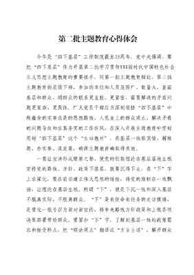 第二批主题教育心得体会今年是四下基层工作制度提出35周年。党中央强调,要把四下基层作为开展第二批学习贯彻XXX新时代中国特色社会主义思想主题教育的重要抓手。同第一批主题教育相比,第二批主题教育的层级下移,参加的单位和人员范围广、数量大,直面基层和群众,同群众的联系更直接、更紧密,需要解决的矛盾问题更复杂、更具体。广大党员干部应当深刻领悟四下基层中所蕴含的实事求是的思想路线、人民至上的群众观点、解决矛盾的问题导向和求真务实的工作作风,在深入开展主题教育中学好用好四下基层这个生动教材,在基层一线察实情、解难题、办实事、谋发展,确保主题教育确取得实效。一要让宣讲形成燎原之势,使党的创新理论在基层落地生根宣传党的路线、方针、政策下基层,就要沉得下去,在下字上求深化,要在前沿建立伟大思想的链接,将党的旗帜在一线飘扬,让理论在基层生根。所谓下,就是下沉一线和深入基层不脱离实际,不脱离群众。下是有使命有任务的走访摸排,是要化一般号召为面对面宣传,将中央路线方针政策和上级各项决策部署带给群众。要紧扣下字,了解到基层一线的政策需求和接受特点,把理论观点翻译成方言土话,解开群众思想上的疑虑,团结带领群众奋力开创发展新局面。作为新时代的青年干部,我们更应当保持坚定的党性原则,深刻认识到四下基层是推动XXX新时代中国特色社会主义思想直达基层、直达群众的有效途径。我想,脚下沾满泥土、心中装满群众、身上充满力量,这才是青年干部最好的状态。我们要聚焦乡村振兴等老百姓关心关注的利民惠民政策,在自己弄懂弄通的基础上,当好群众与党和政府之间的桥梁,通过小切口,做好大宣传真正让党的创新理论飞向寻常百姓家,向时代、向人民写好中国故事、传递中国声音。二要让调研变为务实之举,使党的难题堵点在基层找到答案调查研究下基层,就要拿得起来,在解字上下功夫,要在前沿寻找守正创新的答案,将社情民意在一线掌握,让难题在基层破解。所谓解,就是问需于民和问计于民,拜人民为师,向人民学习。解是有目标有导向的务实笃行,是要从机关大院到基层一线,走出单位、走向基层、走进群众,近的远的都要去,好的差的都要看,真正把情况摸实摸透,更好地从细处入手,向实处着力。要紧扣解字,迈开步子走、俯下身子问,收集到第一手资料、倾听到第一线声音,通过调研着力从人民群众中汲取智慧和力量。同时,要在做好调查研究工作的基础上,上门为群众们答需解困,解决问题。作为新时代的青年干部,我们更应当保持强烈的问题意识,深刻认识到调查研究是谋事之基成事之道。不仅要身入,还要心至,从办公桌前走进田间地头,和群众齐坐板凳、围坐炕头,同群众交心谈心真正让群众打开话匣子,边听边看边思考,听懂群众的言外之意弦外之音,听出基层的难言之隐、话中之味,把群众们的小呼声当做我们工作的大抓手,真正将调查研究工作做到群众家门口,做到心坎上。三要让信访解决迫切之需,使党的民主实践在基层充分发挥信访接待下基层,就要帮得上忙,在促字上谋实招,要在前沿解决矛盾纠纷的源头,将问题症结在一线化解,让能力在基层提升。所谓促,就是促进干群关系融洽、促进基层发展稳定促是有责任有担当的攻坚克难,是要变群众上访为领导下访真正将信访工作看作党和政府联系群众的桥梁,让信访工作成为直接了解民情、体察民意、化解矛盾的窗口。XXXXXX说过:与其群众跋山涉水上访,不如我们干部直接下访,几个干部下去,总比那么多群众上来要强一些。要紧扣促字,时刻不忘自己是人民中的一员,带着感情、带着责任、带着担当,让群众打开心结,第一时间将群众诉求解决在萌芽状态。作为新时代的青年干部,我们更应当保持深厚的人民情怀,深刻认识到信访是送上门来的群众工作,解决信访问题的过程就是践行党的群众路线做好群众工作的过程。广大党员干部要多走走,多听听,让老百姓遇到问题能有地方找个说法。加强自身学习,善于运用法治思维和法治方式解决涉及群众切身利益的矛盾和问题,将群众的小事情当做大事情,确保群众们的合理诉求事事有回音、件件有落实,真正将矛盾纠纷解决在萌芽、化解在基层四要让理论生出有效之策,使党的干部队伍在基层淬炼成钢现场办公下基层,就要干得成事,在实字上出成果,要在前沿传递党情党恩的温暖,将难点堵点在一线打通,让工作在基层落实。所谓实,就是坚守为民初心、永葆服务本色。实是有情怀有抱负的为民造福,是化被动服务为主动服务,让办公桌进基层、下一线,让群众们的特事能够特办,急事能够急办,让现场办公,服务群众切实成为党和政府承接地气、聚集人气的窗口。社会的发展,使得群众们扛锄头的少了,拿鼠标的多了,自主意识、平等意识、参与公共事务的意识强了。要紧扣实字,转变工作思维、创新工作