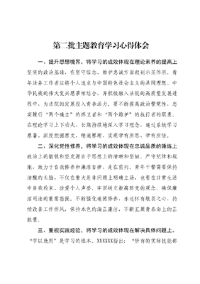 第二批主题教育学习心得体会一、提升思想境界,将学习的成效体现在理论素养的提高上坚实的政治基础,在坚守信念、维护忠诚方面起到示范作用。青年法务工作者应将个人追求与中国特色社会主义的共同理想、中华民族的伟大复兴愿景相结合,并积极融入法院的高质量发展进程中,为法院的发展投入青春活力。要不断提高政治警觉性,忠实履行两个确立的捍卫者和两个维护的执行者的职责。在理论学习上下功夫,长期持续地深入学习理念,通过系统学习原著、深度挖掘原文、精通原理,实现学有所思、学有所悟。二、深化党性修养,将学习的成效体现在忠诚品质的锤炼上政治上的敏锐和坚定源自于思想上的清晰和坚韧。严守纪律和规矩,致力于自我修养和廉洁自律,走在前列。青年干警需要保持清醒的头脑,不仅在重大是非问题上明确立场,也要在日常生活中自我约束、珍爱个人声誉。牢固树立拒腐防变的观念,确保廉洁司法的重要前提。不断强化道德修养,永远怀有敬畏之心,持续改善工作作风,保持本色的清正廉洁,不断汇聚青春向上的正能量。三、重视实践经验,将学习的成效体现在解决具体问题上。学以致用是学习的根本。XXXXXX指出:所有的实际技能都源于实践。必须坚持理论与实践的结合,在实际工作中学习真知、领悟真理,增强本领。坚持正确的事业观,讲实话、办实事求实效,具体工作要从细微处着手,从日常小事抓起,承担起每项任务的责任,避免只重表象不注重实效的行为。办公室工作千头万绪,既要与多方协调,也要注重在工作中找准问题的关键,立足于综合调度,不断创新工作方法,细致入微地开展工作,重点抓好文书处理、宣传推广、事务处理等关键环节,进一步总结新经验,探索工作的新思路。四、树立新功绩,将学习的成效体现在推动法院宣传工作的高质量发展上。作为新时代的法务工作者,应在充满挑战的任务中谋划新局面、建立新成就,尤其要在工作中培养理想追求、敢于担当、能吃苦、愿奋斗的新时代优秀青年形象。不仅要完成个人工作,更要协同团队,珍视工作平台,将个人价值融入集体发展之中。在工作中恪守功成不必在我、功成必有我的信念,敢于负责,勇于奉献。