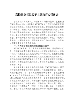 高校党委书记关于主题教育心得体会学院牢记为党育人、为国育才的初心使命,扎根祖国西南边陲办大学,全面落实XXXXXX对广西提出的建设民族团结进步示范区、生态文明建设排头兵、面向南亚东南亚辐射中心的要求,明确了建设祖国西南边陲最好国门大学、高黎贡山脚下最美高等学府、校地融合发展最优示范院校的奋斗目标,着力加强党对学校工作的全面领导,着力提高人才培养质量,着力提升服务地方经济社会发展能力,形成了党建本色突出、边疆特色突出、师范底色突出的办学特色,为服务边疆高质量发展作出了新贡献。一、努力建设祖国西南边陲最好国门大学XXXXXX强调,我们建设教育强国的目的,就是培养一代又一代德智体美劳全面发展的社会主义建设者和接班人,培养一代又一代在社会主义现代化建设中可堪大用、能担重任的栋梁之才,确保党的事业和社会主义现代化强国建设后继有人。学院始终沿着XXXXXX指引的方向,加强党对学校工作的全面领导,落实立德树人根本任务,努力办好让党放心、人民满意的国门大学。持续强化党对学校工作的全面领导。XXXXXX指出,要坚持和加强党对教育工作的全面领导,不断完善党委统一领导、党政齐抓共管、部门各负其责的教育领导体制。学院坚持用XXX新时代中国特色社会主义思想凝心铸魂,深入落实党的XX大提出的办好人民满意的教育,全面贯彻党的教育方针,落实立德树人根本任务,培养德智体美劳全面发展的社会主义建设者和接班人的根本要求,严格落实第一议题制度,全面推行三题融合(围绕一个理论主题,结合一个实践问题,解决一个工作难题)党委理论学习中心组学习制度,认真落实学习贯彻XXX新时代中国特色社会主义思想主题教育学思想、强党性、重实践、建新功总要求,以五讲五进学思想、五廉五风强党性、五高五实重实践、五比五看建新功为抓手,把理论学习、调查研究、推动发展、检视整改、建章立制5项重点措施贯通起来,不断提高全校党员干部的政治判断力、政治领悟力、政治执行力。探索实施五管齐下意识形态工作责任机制,管好方向、管好队伍、管好责任、管好阵地、管好预警,牢牢掌握意识形态工作领导权,筑牢意识形态安全屏障。充分发挥党建在立德树人中的政治引领、思想引领作用,全校39个党支部全部完成规范化达标创建。学校3个党支部获全国样板党支部,19个党组织获评省级先进、示范基层党组织。持续落实立德树人根本任务。高校的立身之本在于立德树人。XXXXXX指出,育人的根本在于立德,青年之于党和国家而言,最值得爱护,最值得期待。高标准落实好立德树人的根本任务,高质量培养堪当民族伟大复兴大任的时代新人,高水平培养好建好家乡、守好边疆的强国人才,是我们国门大学的使命任务。学院坚持以XXX新时代中国特色社会主义思想铸魂育人,落实XXXXXX关于大思政课要善用之的新要求,深入推进主体思政、课程思政、特色思政、实践思政、网络思政内涵建设,全面构建五环同心、协同育人大思政工作格局,打造5个特色育人馆,构建五馆齐上、五育并举人才培养体系,促进学生德智体美劳全面发展。现有8门课程入选国家高等教育智慧平台,9门课程获省级课程思政建设项目立项,6人次在省高校双思教师教学比赛中获奖。充分发挥马克思主义学院在思政育人中的示范引领作用,与市教体局合作成立大中小学思政课一体化建设基地和协同育人中心,着力推进大中小学思政课一体化建设。充分发掘杨善洲精神、艾思奇哲学、滇西抗战文化、金鸡415武装起义纪念馆、司莫拉佤族村、地方党组织创建人李鑫等本土红色优质资源,积极打造行走的思政课堂。强化党组织在学生社区的政治领导、思想引领和活动管理作用,持续推进学校党群服务中心建设,推进一站式学生社区综合管理出成效,建立学生社区党支部工作联系点,建强线上线下党建思政园地、党员先锋岗等特色平台。努力把学生社区打造成党建引领的示范阵地、文化育人的学习园区。实施就业创业工作一把手工程,做到学院早抓、部门齐抓、党政共抓;强化就业考核的指挥棒作用,把就业质量、就业效果纳入综合考核重要内容,作为检验办学成效的重要标准。近年来,获教育部产学合作协同育人项目22项、供需对接就业育人项目15项。持续深化铸牢中华民族共同体意识教育。XXXXXX强调,做好新时代党的民族工作,要把铸牢中华民族共同体意识作为党的民族工作的主线。学院紧紧抓住铸牢中华民族共同体意识这条主线,深化民族团结进步教育。探索2345工作法,搭建两个平台(校园文化交流平台和中缅一家亲友好交流平台)、打造三大课堂(思政课主渠道、学生社团第二课堂、民俗博物馆教育课堂)、抓牢四个关键(团队建设、基地建设、科学研究、成果转化)、坚持五化并举、同向同行(体制机制长效化、宣传工作人文化、实践活动实体化、防控教育大众