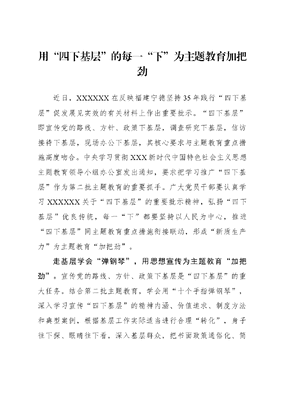 用四下基层的每一下为主题教育加把劲近日,XXXXXX在反映福建宁德坚持35年践行四下基层促发展见实效的有关材料上作出重要批示。四下基层即宣传党的路线、方针、政策下基层,调查研究下基层,信访接待下基层,现场办公下基层,其核心要求与主题教育重点措施高度吻合。中央学习贯彻XXX新时代中国特色社会主义思想主题教育领导小组办公室发出通知,要求把学习推广四下基层作为第二批主题教育的重要抓手。广大党员干部要认真学习XXXXXX关于四下基层的重要批示精神,弘扬四下基层优良传统,每一下都要坚持以人民为中心,推进四下基层同主题教育重点措施衔接联动,形成新质生产力为主题教育加把劲。走基层学会弹钢琴,用思想宣传为主题教育加把劲。宣传党的路线、方针、政策下基层是四下基层的重大任务。结合第二批主题教育,学会用十个手指弹钢琴,深入学习宣传四下基层的精神内涵、价值追求、制度方法和典型案例,根据基层工作实际适当进行合理转化,身子往下探、眼睛往下看,深入基层群众,把书面政策通俗化、简单化。牢记国之大者,捕捉党和人民群众之间的共振点,坚持在守正中创新、在创新中守正,用方言式宣讲XXX新时代中国特色社会主义思想、普及党的路线方针政策,用小切口反映大内涵,用身边事讲大变化,推动党的创新理论飞入寻常百姓家。走基层下好先手棋,用调查研究为主题教育加把劲。一切正确的决策都在调查研究之后。XXXXXX强调,要大兴调查研究之风,多到基层一线去,多到困难多、群众意见集中、工作打不开局面的地方去。要下好主题教育先手棋,要增强问题意识,敢于正视问题,善于发现问题,始终把群众的急难愁盼作为调查研究的方向标,直奔基层、直面群众、直接解决问题,做根于基层的调研。调以务实,研以致用。要用好调查研究传家宝,对标实字再落实,绝不坐着汽车转、隔着玻璃看,学习千万工程浦江经验等典型,坚持调、研、用并重,问题一个一个梳理、一条一条研究、一项一项解决。着力下字做文章,深入矛盾集中的地方察实情,走到乡村振兴最前沿去感受,真正把情况摸清、把对策提实,通过调查研究找到存在感,让人民群众深切感受到主题教育成效。走基层读懂无字书,用信访接待为主题教育加把劲。当前我国社会主要矛盾已经转化为人民日益增长的美好生活需要和不平衡不充分的发展之间的矛盾。检视整改是此次主题教育的一项重点措施,要把群众信访和诉求作为发现问题的重要途径,构建四面八方的群众诉求感知体系,对碎片化群众诉求进行整合分析,画准问题像。进一步精准查摆问题,形成一张清晰且动态更新的问题清单,推动群众合理诉求及时解决,把问题清单变为成果清单。坚持学查改贯通,深挖问题的根源,推进问题的再梳理、再督促、再深化,让矛盾在萌芽阶段就得到有效解决。力求当下改牵手长久立,深入细致查不足、找差距,围绕信访接待,及时总结有效做法和成功经验,把群众上来访转为干部下沉接,推动主题教育深入人心。走基层绘就工笔画,用现场办公为主题教育加把劲。XXXXXX曾以工笔画为喻,描绘共建一带一路的美好未来。正在进行的主题教育,像如椽画笔,勾画美好未来。要深入农村社区、企业车间、田间地头,扎实服务科技创新、产业发展、乡村振兴等领域,通过现场研究、现场指导、现场协调,面对面问情况、听意见、解难题、办实事。坚持以人民为中心,自觉把狠抓发展的问题摆在更为突出的位置,紧盯发展所需、改革所急、基层所盼、民心所向的问题,变会场为现场,以实干求实绩,不断满足群众个性化、多样化的需求,扎实推动共同富裕。把心思用在工作上、用在为人民服务上,走好新时代党的群众路线,真抓实干、埋头苦干,把问题解决在一线、矛盾化解在一线、工作落实在一线,在实干担当促进发展中再建新功,推动主题教育走深走实。