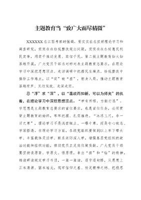 主题教育当致广大而尽精微XXXXXX在江西考察时强调,要实实在在抓好理论学习和调查研究,实实在在检视整改突出问题,实实在在办好惠民利民实事,用实干推动发展、取信于民。第二批主题教育如火如荼地开展,广大党员干部当对标对表主题教育总要求,在理论学习中深挖思想顶点、走访调研中把握民生痛点、检视整改中排除工作难点,以实破虚,躬身入局,推动主题教育落地有声、见行见效、走深走实。忌浮求深,以温故而知新,可以为师矣的执着,在理论学习中深挖思想顶点。学有所悟,方能行远。学思想是主题教育总要求的首位要求,也是首位任务,必须贯穿主题教育的始终,牢牢把握、扎实推进。冰冻三尺,非一日之寒,理论学习不是浅尝辄止、一曝十寒,而是专心致志、学深悟透。在理论学习方面,各级党组织要做到以上率下带头学、丰富载体灵活学、联系实际深入学,增强基层党组织的政治功能和组织功能,推动党员立足岗位做贡献。广大党员干部要坚持读原著、学原文、悟原理,拿出挤和钻的精神,精读研读规定学习书目,一篇一篇读,逐字逐句悟,从思想上正本清源、固本培元,筑牢信仰之基、补足精神之钙、把稳思想之舵,从党的科学理论中悟规律、明方向、学方法、增智慧,把看家本领、兴党本领、强国本领学到手,不断提升思想境界、加强党性锻炼、丰富内心灵魂。弃惰用勤,以知屋漏者在宇下,知政失者在草野的清醒,在走访调研中把握民生痛点。不明察,不能烛私,调查研究是谋事之基、成事之道,没有调查就没有发言权,没有调查就没有决策权。广大党员干部要把镜头对准基层、问题瞄准民生,深入进行调查研究,积极钻入矛盾窝,主动走向群众最需要的地方,真实了解发展的需求、基层期盼、民心所向,与群众共同探索解决问题的有效策略。要把调查研究作为作决策、解难题、强落实的重要抓手,俯下身子、甩开膀子、干出样子,不搞作秀式盆景式蜻蜓点水式调研,牢记让人民生活幸福是国之大者,当好群众意见的收音机、政策解读的翻译器,做沾满泥土的民间高手。脱虚向实,以咬定青山不放松,立根原在破岩中的坚决,在检视整改中排除工作难点。XXXXXX在学习贯彻XXX新时代中国特色社会主义思想主题教育工作会议上指出,要坚持边学习、边对照、边检视、边整改,把问题整改贯穿主题教育始终。为学之实,固在践履。只有科学认知、准确把握、有效解决主题教育中的短板和问题,才能把人民事业不断推向前进。广大党员干部要坚持问题导向,深挖存在的突出问题,深刻剖析问题的成因,制定切实有效的整改举措,严格遵循主题教育的整改要求,发扬自我革命精神,坚持刀刃向内,奔着问题去、带着问题学、对着问题改。自觉接受政治体检,认真打扫政治灰尘,切实纠正政治偏差,敢于揭短亮丑,与自己的老毛病和坏习惯作斗争,立行立改、即知即改,确保问题清仓见底,以实实在在的整改成效取信于民。