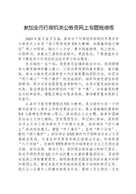 参加全市行政机关公务员网上专题班感悟2024年X月X日至X,我参加了市委组织部组织开展全市行政机关公务员学习贯彻党的XX大精神,加强履职能力建设网上专题班。通过个人自学、集中网络授课、线上选学、专题研讨,使我自己感到收获颇丰,受益匪浅。下面我就结合学习情况和工作实际谈谈此次学习体会感受。作为局的一名干部,我要坚定正确的政治方向,深刻领悟伟大建党精神的重大意义,以坚决贯彻党的基本理论、基本路线、基本方略和坚决落实党中央决策部署的实际行动,体现对两个确立两个维护的忠诚拥护,始终保持先进性和昂扬精神,更加自觉地紧跟党奋进新时代,永葆对党忠诚的政治本色。政治建设是党的建设的根和魂,决定着党的建设方向和效果,增强正确应对复杂局面、推动高质量发展的工作能力。认真学习宣传贯彻党的XX大精神,是当前和今后一个时期市投促中心青年工作的首要政治任务。要全面准确把握党的XX大精神实质和核心要义,深刻领会大会主题,高举中国特色社会主义伟大旗帜,坚定理想信念,牢记初心使命,深刻领会过去五年工作和新时代十年伟大变革,深刻领会两个确立的决定性意义,增强四个意识、坚定四个自信、做到两个维护;深刻领会XXX新时代中国特色社会主义思想的世界观、方法论和贯穿其中的立场观点方法,学深悟透六个坚持,坚持用XXX新时代中国特色社会主义思想武装头脑、指导实践、推动工作;深刻领会团结奋斗的时代要求,坚定不移把党的XX大作出的重大决策部署落到实处,深刻领会医保工作的重要要求,继续推进落实国家组织药品集中采购和使用工作,督促各医疗机构做好药品集中采购和使用工作,践行全心全意为人民服务的根本宗旨。要把人民立场这一马克思主义的根本立场更加鲜明、坚决、全面地贯彻落实到各项工作中去,想民之所想、急民之所急,切实让更多群众享受药品集中采购的政策福利,感受到党的关怀和温暖。激发干事创业的火热激情。打铁还需自身硬,强化责任意识,知责于心、担责于身、履责于行,敢于直面问题,不回避矛盾,不掩盖问题,出了问题要敢于承担责任,敢啃硬骨头,勇于闯难关,在攻克一个又一个问题堡垒中不断创造新的业绩。下大气力苦炼内功,提升履职尽责能力,自觉加强学习,不断积蓄力量,做到厚积薄发,从做好手头工作开始,把完成好每一项任务作为提升能力、锻炼意志的阶梯,只有练就了一身本领,才能在平常时候看得出来、关键时刻站得出来、危急关头豁得出来。担当需要信念,担当需要勇气,担当更需要能力。要做到爱岗敬业,立足本职工作,恪尽职守、拼搏进取,不断提高自身综合能力和专业技能。我们要在发展中保障和改善民生,既要办好群众牵肠挂肚的民生大事、又要做好百姓天天有感的身边小事,努力让老百姓的生活更幸福、日子更红火,通过我们久久为功、薪火相传的不懈努力,把老百姓对美好生活的向往一步步变成现实。我们要坚持把工作当事业、把事业当追求,以小学生的心态学习业务,以拓荒牛的作风推动工作,以时时放心不下的责任感和一日无为、三日难安的紧迫感,在推动我县高质量发展中担使命,在解决群众急难愁盼问题中践诺言,以使命必达的信念、久久为功的韧劲抓好各项工作落实。在今后的工作中,我要迅速掀起学习宣传贯彻热潮,持续营造学习贯彻党的XX大精神的浓厚氛围,切实在学深悟透做实上下功夫。要持续加强医保组织的建设,不断保持和增强政治性、先进性和群众性,把自身建设得更加坚强有力、更加充满活力。要弘扬伟大建党精神,坚定历史自信,增强历史主动,发扬斗争精神。