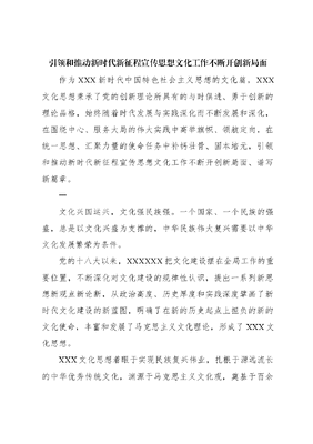 引领和推动新时代新征程宣传思想文化工作不断开创新局面作为XXX新时代中国特色社会主义思想的文化篇,XXX文化思想秉承了党的创新理论所具有的与时俱进、勇于创新的理论品格,始终随着时代发展与实践深化而不断发展和深化,在围绕中心、服务大局的伟大实践中高举旗帜、领航定向,在统一思想、汇聚力量的使命任务中补钙壮骨、固本培元,引领和推动新时代新征程宣传思想文化工作不断开创新局面、谱写新篇章。一文化兴国运兴,文化强民族强。一个国家、一个民族的强盛,总是以文化兴盛为支撑的,中华民族伟大复兴需要以中华文化发展繁荣为条件。党的十八大以来,XXXXXX把文化建设摆在全局工作的重要位置,不断深化对文化建设的规律性认识,提出一系列新思想新观点新论断,从政治高度、历史厚度和实践深度擘画了新时代文化建设的新蓝图,明确了在新的历史起点上担负的新的文化使命,丰富和发展了马克思主义文化理论,形成了XXX文化思想。XXX文化思想着眼于实现民族复兴伟业,扎根于源远流长的中华优秀传统文化,渊源于马克思主义文化观,奠基于百余年来我们党领导文化建设的辉煌历史,形成于推进新时代文化建设的伟大实践,具有深厚的文化底蕴、理论基础、历史渊源和实践支撑。从2013年XXXXXX在全国宣传思想工作会议上提出两个巩固到2018年XXXXXX在全国宣传思想工作会议上提出九个坚持,从2023年文化传承发展座谈会明确文化建设方面的十四个强调到全国宣传思想文化工作会议强调的七个着力要求,从提出XXXXXX关于宣传思想工作的重要思想到XXX文化思想的形成,我们可以直观而深刻地领会到新时代党的宣传思想文化工作的守正创新、不断发展,领会到XXX文化思想理论体系的开放性和实践性。XXX文化思想集中体现了马克思主义文化理论的创新发展,标志着我们党对中国特色社会主义文化建设规律的认识达到了新高度,表明我们党的历史自信、文化自信达到了新高度。二不同国家、民族有不同历史积累、文明积淀,由此决定了不同的发展道路。回望历史,我们党之所以能够领导广大人民群众在一次次求索、一次次挫折、一次次开拓中完成中国其他各种政治力量不可能完成的艰巨任务,根本在于坚持解放思想、实事求是、与时俱进、求真务实,坚持把马克思主义基本文可居文库——海量学习资料,手机电脑均可下载www.wenkeju.com原理同中国具体实际相结合、同中华优秀传统文化相结合,坚持实践是检验真理的唯一标准,坚持一切从实际出发,及时回答时代之问、人民之问,不断推进马克思主义中国化时代化。坚持和发展马克思主义,必须同中国具体实际相结合,这是我们党的宝贵历史经验。早在1938年,毛泽东同志在党的六届六中全会上就鲜明指出马克思列宁主义的伟大力量,就在于它是和各个国家具体的革命实践相联系的,强调马克思主义必须和我国的具体特点相结合并通过一定的民族形式才能实现,如果离开中国特点来谈马克思主义,只是抽象的空洞的马克思主义,向全党提出了马克思主义中国化的重大命题。党的十八大以来,以XXX同志为核心的党中央,高度重视传承和弘扬中华优秀传统文化,开辟了马克思主义基本原理同中华优秀传统文化相结合的新境界。XXXXXX在庆祝中国共产党成立100周年大会上首次提出两个结合重大论断;党的XXX报告中进一步阐述两个结合的深刻内涵;在文化传承发展座谈会上,XXXXXX从五个方面阐明两个结合的重大意义,指出在五千多年中华文明深厚基础上开辟和发展中国特色社会主义,把马克思主义基本原理同中国具体实际、同中华优秀传统文化相结合是必由之路。这是我们在探索中国特色社会主义道路中得出的规律性的认识,是我们取得成功的最大文可居文库——海量学习资料,手机电脑均可下载www.wenkeju.com法宝。XXXXXX关于两个结合的一系列重要论述,将两个结合从马克思主义中国化时代化的方法,升华为开辟和发展中国特色社会主义的必由之路,赋予两个结合更高地位和更大作用空间。马克思主义基本原理同中华优秀传统文化相结合,造就了一个有机统一的新的文化生命体,让马克思主义成为中国的、中华优秀传统文化成为现代的,让中国特色社会主义道路有了更加宏阔深远的历史纵深,拓展了中国特色社会主义道路的文化根基。两个结合特别是第二个结合诠释了新时代文化建设的路径方法,充分彰显了我们党高度的文化自信和强烈的文化担当,为马克思主义中国化时代化奠定了坚实的文化基础。当前,世界百年未有之大变局加速演进,不同文明相互激荡,文化软实力竞争越来越激烈。只有牢牢把握住意识形态工作领导权、管理权、话语权,我们才能在大国较量中把握主动、赢得先机。一百多年来,我们党在革命、建设和改革过程中,积极推进马克思主义中国化时代化,通过对中华优秀传统文化精髓的发掘、继承、弘扬,用马克