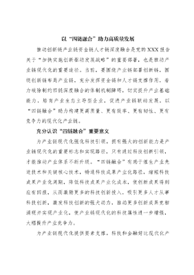 以四链融合助力高质量发展推动创新链产业链资金链人才链深度融合是党的XXX报告关于加快实施创新驱动发展战略的重要部署,也是推动产业链现代化的重要途径。当前,要围绕产业链部署创新链,围绕创新链布局产业链,充分发挥资金链和人才链支撑作用,着力破除制约四链深度融合的体制机制障碍,切实提升产业基础能力,培育产业生态主导型企业,促进产业链联动发展,以四链融合助力构建更高质量、更有效率、更有韧性、更有竞争力的现代化产业链。 充分认识四链融合重要意义为产业链现代化强化科技引领。拥有强大的创新能力是产业链现代化的重要标志和实现路径,只有通过科技创新引领,才能推动产业体系不断升级。四链融合有助于催生产业先进技术和关键核心技术,畅通科技成果产业化路径,缩短科技成果产业化周期,降低科技成果产业化成本,使创新成果得到应有回报,从而激励更多的科技创新投入,吸引更多人才从事科技创新,激发科技创新的强大动力,推动更多创新成果竞相涌现并实现产业化,使产业链现代化的科技属性进一步增强,大幅提升产业竞争力。为产业链现代化提供要素支撑。科技和金融好比现代化产业发展的任督二脉,畅通科技—产业—金融循环,推动创新链产业链资金链人才链深度融合,是推动产业链现代化、保持产业体系先进性的重要途径。同时,人力资本是知识积累和技术进步的源泉,技术积累及其外部性引起的规模收益递增是经济长期持续增长的主要动力,也是产业链现代化的关键要素。数据作为关键生产要素,和传统意义上的资本、劳动、土地、企业家才能等要素汇聚成为现代产业的生成源泉。推动四链融合,需要拥有数量庞大、质量优良、结构合理、配置高效的科技、金融、人才、数据等优质要素,并且建立起要素之间的协同机制,优化要素配置,提升要素效率,如此才能为产业链现代化提供关键要素支撑。为产业链现代化构筑良好生态。通过四链融合,构筑包含政、产、学、研、金、服、用各环节的创新创业共同体和产业集群公共服务综合体,打造政府、企业、高校、科研院所、创新服务机构等主体高效协同,知识、技术、资金、人才、数据等要素集聚融通的产业创新生态,促进各类主体协同创新、融合发展,形成高效运转的科创产业加速器孵化器倍增器,有助于促进产业基础能力强化、运行模式优化、产业链控制力增强和治理能力提升。 找准四链融合推动产业链现代化的重要抓手文可居文库——海量学习资料,手机电脑均可下载www.wenkeju.com以四链融合构筑现代化产业链新基座。当前,我国产业链水平和欧美国家的差距主要集中在产业基础能力方面,具体包括底层工业数据和设计软件、研发设备、测试仪器、关键零部件和材料等。为此,应通过四链融合,重点加大对基础零部件、关键材料、工业软件、检验检测平台、新型基础设施等领域的投入力度,加快完善新型举国体制,强化协同,组织实施产业基础能力攻关工程,推动实施重大示范工程,加快补齐产业基础短板。适应5G、人工智能、量子通信等产业发展需求,加快建设信息网络基础设施、智能应用场景、工业互联网平台、大数据中心等基础设施,加快构建以新一代信息技术和数字化为核心的新型基础设施,支撑制造业数字化、网络化、智能化、绿色化发展。以四链融合培育现代化产业链新主体。在一个行业中产业生态主导型企业是劳动生产率、经济总量、技术水平、发展态势、社会影响力等方面均具有领先地位的企业,是行业发展的标杆。推动产业链现代化,产业生态主导型企业不可或缺。要加强符合产业需求的创新成果供给,增加促进创新成果应用的场景和市场供给,强化支撑产业创新的人才供给,打造具有战略性和全局性的产业链,推动优势企业以核心技术、知识产权、自主知名品牌、优质独特产品、标准制定、营销网络为依文可居文库——海量学习资料,手机电脑均可下载www.wenkeju.com托,增强对产业链供应链上下游的资源整合能力,加快成为在全球产业分工体系中具有主导能力的产业生态主导型企业。以四链融合拓展现代化产业链新空间。要从时空两方面统筹抓好产业链现代化建设。一方面,要结合短板产业、优势产业、传统产业、新兴产业和未来产业在发展不同环节、不同阶段的科技、金融和人才需求,建立完善相应的科技创新体制、金融服务体制和人力资源供给机制。推动建立适应短板产业补链、优势产业延链、传统产业升链、新兴产业建链等不同产业链发展需求的针对性创新研发机制。加强教育、科技、人才一体化推进机制,结合国家发展战略需求和产业升级发展特点定制高校人才培养体系和课程体系,建设智慧教室等硬件平台,促进人才培养与科技研发、产业发展需求相衔接。另一方面,要统筹推进产业国内有序转移、现代产业集群建设和国际产业合作。推动产业在国内有序转移,在中西部地区建设现代化产业基地,拓展新型工业化的战略腹地。支持产业准入地与转