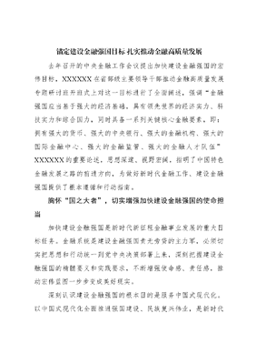 锚定建设金融强国目标 扎实推动金融高质量发展去年召开的中央金融工作会议提出加快建设金融强国的宏伟目标,XXXXXX在省部级主要领导干部推动金融高质量发展专题研讨班开班式上对这一目标进行了全面阐述,强调金融强国应当基于强大的经济基础,具有领先世界的经济实力、科技实力和综合国力,同时具备一系列关键核心金融要素,即:拥有强大的货币、强大的中央银行、强大的金融机构、强大的国际金融中心、强大的金融监管、强大的金融人才队伍XXXXXX的重要论述,思想深邃、视野宏阔,指明了中国特色金融发展之路的前进方向,为做好新时代金融工作、建设金融强国提供了根本遵循和行动指南。胸怀国之大者,切实增强加快建设金融强国的使命担当加快建设金融强国是新时代新征程金融事业发展的重大目标任务。金融系统是建设金融强国责无旁贷的主力军,必须切实把思想和行动统一到党中央决策部署上来,深刻把握建设金融强国的精髓要义和实践要求,不断增强使命感、责任感,推动宏伟蓝图一步步变成美好现实。深刻认识建设金融强国的根本目的是服务中国式现代化。以中国式现代化全面推进强国建设、民族复兴伟业,是新时代最大的政治。金融强国建设与社会主义现代化强国建设密不可分,并且服从服务于中国式现代化,二者是局部服从整体、具体目标服务于总目标的关系。现代化强国必然是金融强国,全面建成社会主义现代化强国离不开强大金融体系的关键支撑,金融强国建设也只有在推进中国式现代化的伟大进程中才能实现。金融系统必须强化使命担当,把建设金融强国作为投身强国建设、民族复兴伟业的具体方式和直接体现,把服务中国式现代化作为根本目的,坚决以实际行动把党中央决策部署落到实处。深刻认识建设金融强国的战略背景是统筹国内国际两个大局。当前,世界之变、时代之变、历史之变正以前所未有的方式展开。从国际看,世界百年未有之大变局加速演进,全球经济复苏之路曲折漫长,国际金融环境更加复杂,不稳定不确定因素明显增加。从国内看,我国经济回升向好、长期向好基本趋势没有改变,金融稳定健康发展具有坚实基础,同时信息技术革命、人口结构变化、产业转型升级、区域结构调整和城镇化发展对金融结构、服务、效率等提出新要求。建设金融强国必须立足两个大局,准确识变、科学应变、主动求变,着力提高国家竞争力,维护国家金融安全。深刻认识建设金融强国的必由路径是坚定不移走中国特色文可居文库——海量学习资料,手机电脑均可下载www.wenkeju.com金融发展之路。我们要建设的金融强国,是中国共产党领导的社会主义金融强国。这决定了我们必须走中国特色金融发展之路。中国特色金融发展之路的基本要义,即八个坚持,是我们党坚持把马克思主义基本原理同中国具体实际相结合、同中华优秀传统文化相结合,不断推进金融实践创新、理论创新、制度创新而取得的重大成果。中国特色金融发展之路是一条前无古人的创新之路,既遵循现代金融发展的客观规律,更具有适合我国国情的鲜明特色,是具有科学理论指导、已经被实践证明并将继续被实践证明的正确道路。我们要在实践中不断探索、守正创新,使这条路越走越宽广。奋力攻坚克难,以金融高质量发展推进金融强国建设建设金融强国是一个复杂的系统工程,必须保持战略定力和历史耐心,按照分阶段目标持续推进,稳扎稳打,久久为功。当前,加快建设金融强国要坚持目标导向和问题导向相结合,一步一个脚印解决前进道路上的各种问题,以推动金融高质量发展夯实金融强国建设基础。以稳妥有效风险防控守护金融安全。坚持稳定大局、统筹协调、分类施策、精准拆弹的方针,妥处存量、严防增量,有力有序有效防范化解重点领域金融风险。加强中央和地方协同,完善风险处置策略方法,强化风险处置资源保障,健全权文可居文库——海量学习资料,手机电脑均可下载www.wenkeju.com责一致、激励约束相容的风险处置责任机制。强化风险源头防控和监测预警,健全具有硬约束的金融风险早期纠正机制,对风险早识别、早预警、早暴露、早处置,防止小事拖大、大事拖炸。以严密过硬监管保障金融稳定发展。落实金融监管全覆盖依法将所有金融活动全部纳入监管。按照管合法更要管非法、管行业必须管风险、建立兜底监管机制的要求,建立健全横向到边、纵向到底的严密监管机制。提升监管能力水平,及时调适监管理念、改进监管方法。推动监管长牙带刺、有棱有角,严格执法、敢于亮剑,确保监管姓监。建立健全监管问责机制,强化对监管的监管。以优质高效服务夯实金融发展根基。坚持以人民为中心的价值取向,坚持把金融服务实体经济作为根本宗旨,不断提升金融服务民生福祉和经济社会发展的能力水平。重点做好五篇大文章。科技金融迎难而上,支持以科技创新引领现代化产业体系建设,促进发展新质生产力。绿色金融乘势而上,完善政策、标准和产品体系,深入推进生态文明建设和绿色低