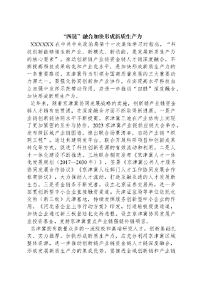 四链融合加快形成新质生产力XXXXXX在中共中央政治局第十一次集体学习时指出,科技创新能够催生新产业、新模式、新动能,是发展新质生产力的核心要素。推动创新链产业链资金链人才链深度融合,不断提高科技成果转化和产业化水平,是加快形成新质生产力的一条重要路径。京津冀作为引领全国高质量发展的三大重要动力源之一,要强化协同创新和产业协作,在实现高水平科技自立自强中发挥示范带动作用,应进一步推动四链深度融合,加快形成新质生产力。近年来,随着京津冀协同发展战略的实施,创新链产业链资金链人才链有效贯通,在深度融合方面不断取得新进展。一是产业链创新链协同水平不断提高。京津冀三地在产业结构上实现了更加紧密的互补与协作。2023京津冀产业链供应链大会举办,发布跨区域产业链图谱,推出联合场景清单,启动产业链织网工程。通过共建研发平台、联合开展科研项目和创新成果转化等方式,促进了科技创新资源的有效流动和利用。二是人才一体化建设不断推进。三地联合制定发布《京津冀人才一体化发展规划(2017—2030年)》,签署《京津冀公共人才服务协同发展合作协议》《京津冀人社部门人才工作协同发展合作框架协议》,大力推动人才流动,打造互融互通的人才发展新生态。三是资金链条不断完善。设立北京证券交易所,进一步拓宽创新型中小企业直接融资渠道。天津证监局等单位依托北交所(新三板)天津基地,持续发挥服务创新型中小企业的作用。《河北省企业上市行动方案》印发,打通转板便捷通道,加快企业通过新三板登陆北交所进程。设立京津冀协同发展产业投资基金,支持京津冀重点产业链强链补链项目。京津冀拥有数量众多的一流院校和高端研究人才,创新基础扎实、实力雄厚。加快形成新质生产力,应充分利用京津冀区域整体资源,进一步推动创新链产业链资金链人才链深度融合,形成发展新质生产力的集成优势。要推进全域创新链和产业链深度融合,以科技创新推动产业转型升级,培育新产业、新模式、新动能,促进生产力的跃升;充分发挥京津冀区域内高水平创新型人才集群的优势,推动人才高效流动,促进人才链与产业链、创新链相衔接,为新质生产力注入持续动能;充分发挥资本赋能作用,用全域贯通的资金链有效服务于全域协同的产业链、创新链、人才链,为加快形成新质生产力提供资金保障。推动创新链产业链资金链人才链深度融合,及时将科技创新成果应用到具体产业和产业链,促进京津冀地区新质生产力加速发展,应从以下几方面重点发力。一是强化制度创新。不断探索和完善地区间利益共享、利益冲突解决机制,推动区域要素市场一体化。健全重点领域、标准以及相关制度的沟通衔接机制,积极推进利益诉求、管理服务等方面的全面对接。加快区域协同立法步伐,逐步构建完备的制度框架和法规体系,打造促进四链深度融合、加快发展新质生产力的良好环境。二是强化顶层设计。加强创新链产业链资金链人才链深度融合的整体规划,完善京津冀地区新质生产力的全域布局,分类精准设计支持措施。明确四链融合的重点领域和薄弱环节,精准布局一批战略性新兴产业、未来产业。支持全域创新主体围绕产业发展的核心技术到高校科研院所合作建设实验室和中试基地,灵活采用共建合建等多种方式打造中试平台,为中小企业提供中试服务,统筹完善各类人才服务,引导和撬动社会资本依托项目在区域内流动,加快全域资金链有效融入创新链、产业链的步伐。三是强化政策协同。围绕创新链产业链资金链人才链深度融合,做好全域对接,加强重点指导,出台配套细则,构筑多维度、多链条的政策矩阵,凝聚推动四链融合的强大合力。以推动产业创新发展为目标,以精准推出科技成果转化、科研基金设置等方面的举措为抓手,完善一揽子政策体系,围绕重文可居文库——海量学习资料,手机电脑均可下载www.wenkeju.com点产业链抓好关键核心技术攻关,解决创新链中的瓶颈制约,加快科技成果产业化进程。建立人才链资金链深度嵌入产业链创新链的政策体系,疏通各环节人才、资金进入产业链和创新链的渠道,促进人才和资金的集聚整合、顺畅流动和高效配置,引导人才、资金等要素服务于产业链和创新链深度融合。文可居文库——海量学习资料,手机电脑均可下载www.wenkeju.com