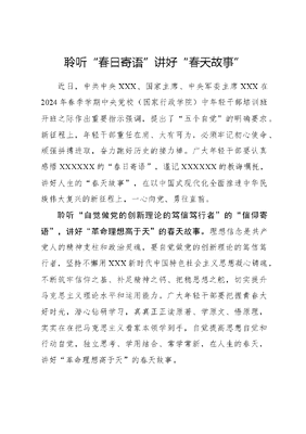 聆听春日寄语讲好春天故事近日,中共中央XXX、国家主席、中央军委主席XXX在2024年春季学期中央党校(国家行政学院)中年轻干部培训班开班之际作出重要指示强调,提出了五个自觉的明确要求。新征程上,年轻干部重任在肩、大有可为,必须牢记初心使命、顽强拼搏进取,奋力跑好历史的接力棒。广大年轻干部要认真感悟XXXXXX的春日寄语,谨记XXXXXX的教诲嘱托,讲好人生的春天故事,在以中国式现代化全面推进中华民族伟大复兴的新征程上,一心向党、勇往直前。聆听自觉做党的创新理论的笃信笃行者的信仰寄语,讲好革命理想高于天的春天故事。理想信念是共产党人的精神支柱和政治灵魂,要自觉做党的创新理论的笃信笃行者,坚持不懈用XXX新时代中国特色社会主义思想凝心铸魂,不断筑牢信仰之基、补足精神之钙、把稳思想之舵,切实提升马克思主义理论水平和运用能力。广大年轻干部要把握青春大好时光,潜心钻研学习,真真正正读原著、学原文、悟原理,实实在在把马克思主义看家本领学到手,自觉提高思想自觉和行动自觉,独立思考、学用结合、常学常新,在人生的春天,讲好革命理想高于天的春天故事。聆听自觉做对党忠诚老实的模范践行者的忠诚寄语,讲好臣心一片磁针石的春天故事。对党忠诚是中国共产党人的为政之魂,也是为政的前提。XXXXXX强调,要自觉做对党忠诚老实的模范践行者,旗帜鲜明讲政治,着力提高政治判断力、政治领悟力、政治执行力,严守党的政治纪律和政治规矩,说老实话、办老实事、做老实人,始终同党中央保持高度一致。广大年轻干部要加强党史学习教育,从百年党史中不断汲取奋进力量、涵养家国情怀、提升党性修养,时刻谨记在党言党、在党为党的原则立场,时刻将忠诚二字铭记在心,坚持爱国、爱党和爱社会主义高度统一,在人生的春天,讲好臣心一片磁针石的春天故事。聆听自觉做矢志为民造福的无私奉献者的初心寄语,讲好一枝一叶总关情的春天故事。党的根基在人民、血脉在人民、力量在人民。XXXXXX强调,要自觉做矢志为民造福的无私奉献者,始终把人民放在心中最高位置,树立和践行正确政绩观,走好新时代党的群众路线,提高做群众工作的本领,用心用情用力解决群众急难愁盼问题,不断增强人民群众的获得感、幸福感、安全感。广大年轻干部要始终牢记为人民服务的宗旨,默默奉献、无悔付出,坚持一切为了人民、一切依靠人民,始终把人民放在心中最高位置,不忘初心、牢文可居文库——海量学习资料,手机电脑均可下载www.wenkeju.com记使命,永葆奉献精神,主动深入基层群众,以看得见的行动自觉走好群众路线,在人生的春天,讲好一枝一叶总关情的春天故事。聆听自觉做良好政治生态的有力促进者的廉洁寄语,讲好清风两袖朝天去的春天故事。勇于自我革命,是我们党最鲜明的品格,也是我们党最大的优势。XXXXXX强调,要自觉做良好政治生态的有力促进者,发扬彻底的自我革命精神,节俭朴素、谦逊低调,坚决反对形式主义、官僚主义,坚决反对特权思想和特权行为,永葆共产党人清正廉洁的政治本色。广大年轻干部要坚守底线,拿出刀刃向内、刮骨疗毒的勇气,敢于自我揭短、勇于自我革新,继承和发扬自我革命精神,勤掸思想尘、多思贪欲害、常破心中贼,扣好廉洁从政的第一粒扣子,时刻保持清醒,心有所畏、言有所戒、行有所止,在人生的春天,讲好清风两袖朝天去的春天故事。聆听自觉做勇于担当作为的不懈奋斗者的担当寄语,讲好越是艰险越向前的春天故事。年轻干部生逢盛世,作为党和国家事业发展的生力军,要勇于担当、善于作为。XXXXXX强调,要自觉做勇于担当作为的不懈奋斗者,锐意改革创新,敢于善于斗争,愿挑最重的担子、能啃最硬的骨头、文可居文库——海量学习资料,手机电脑均可下载www.wenkeju.com善接烫手的山芋,在直面问题、破解难题中不断打开工作新局面。广大年轻干部要永葆偏向虎山行的闯劲,发挥干事创业的积极性和创造性,入山问樵、入水问渔、勇敢前行,始终怀揣一颗责任心,不断强化责任意识,身先士卒、敢于担当、善于作为,牢固树立责任意识,面对困难不退缩、面对挑战不逃避、面对风险不胆怯,锐意进取、迎难而上,在人生的春天,讲好越是艰险越向前的春天故事。文可居文库——海量学习资料,手机电脑均可下载www.wenkeju.com