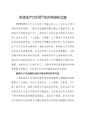 新质生产力引领下的共同富裕之路XXXXXX3月5日在参加十四届全国人大二次会议江苏代表团审议时强调,要牢牢把握高质量发展这个首要任务,因地制宜发展新质生产力。新质生产力标志着中国经济发展正迈入由信息技术、人工智能、大数据、云计算等为代表的前沿科技驱动的新阶段。以原创性和颠覆性创新为核心推力的新质生产力不仅体现出高效率、智能化的特性,更拥有几乎为零的边际成本的独特优势。这些技术的广泛应用和深度融合,为经济增长模式带来根本性变革,将持续促进产业结构转型升级,推动劳动技能结构优化,引导劳动收入分布朝更加合理的方向调整。在新质生产力的引领下,中国经济增长的质量和效率将实现根本性提升,为实现全社会共同富裕提供坚实基础。新质生产力加速驱动经济增长模式转型升级一是新质生产力为经济增长模式转型提供了颠覆性新动能新质生产力指向一系列以信息技术、人工智能、大数据、云计算、量子科学、基因工程等为代表的前沿科技,其共性在于促进研发生产过程中的高效率与智能化,且呈现出边际成本趋近于零和规模收益递增的显著特点,其新生产要素、新技术和新生产组织形态的深度交叉融合都展现出原创性与颠覆性创新在深入推动经济转型升级中的核心作用。在新质生产力的引领下,经济增长不仅仅是倚重普通的智能化、自动化技术在边际上的改进和应用,更关键在于提供了进一步转型升级要求的颠覆性新动能:一是要求原创性的基础科学发现以推动人类对世界和自身客观规律的新认知和掌握,从而在未来产业国际竞争中牢牢占领从0到1的科学话语权;二是要求可在技术和经济效益上能替代现有生产路径的全新制造技术和工艺,这将既确保国家在国际分工中占据产业链、价值链高位,持续分享国际贸易中的丰厚科技红利,也确保着国家科技安全。二是新质生产力为经济增长模式转型升级孕育产业新生态新增长模式还体现在新产业体系的成熟上。在目前技术进步和科技创新驱动的经济增长模式基础上,新质生产力更加强调在全社会范围内实现产业结构和生产组织体系的根本性变革:在消费侧,依托互联网和借势数字化进程,通过新技术的应用,从消费终端接受并编码消费者个性化偏好;在生产侧,以产业互联网(物联网的早期阶段)聚合大批量的生产性服务企业和制造企业,贯通协作形成产业集群与生产矩阵,响应市场需求,诞生出全新的产业形态和商业模式,这是未来经济增长的新生态,亦将极大提升社会全要素生产率和生产网络韧性。因此,在目前的经济增长转型模式基础上,新质生产力将从基础科学文可居文库——海量学习资料,手机电脑均可下载www.wenkeju.com新发现、新技术路径替代、全球分工、产业新生态、社会全要素生产率、经济韧性和国家安全等维度加速驱动经济增长模式转型升级。新质生产力多维提升全社会福利水平新质生产力正在全球范围内重塑经济增长的模式、就业结构、公共服务体系以及环境保护和可持续发展策略。它通过整合人工智能、大数据、云计算等前沿技术,不仅推动了经济的高质量增长,也对社会福利的整体提升产生了深远影响。一是提升消费水平,促进经济良性循环,增加高技能劳动者收入水平。新质生产力通过促进技术革新和应用,直接加速了经济增长的动力,提高了国民经济的整体收入水平。这一过程中,高技术产业如智能制造、生物科技、新能源等领域的快速发展,不仅吸引了大量资本投入,也为高技能劳动者提供了高薪的就业机会。这些高薪就业机会在提升个人收入的同时,也促进了消费能力的提升,形成了经济良性循环的动力源泉。二是持续调节就业结构,增加低技能非编码型劳动者收入随着新兴技术的广泛应用,新质生产力对劳动市场的需求结构产生了根本性影响。技术进步不仅增加了传统和新兴行业对高技术劳动需求,促使就业结构向高技能领域转移。高薪高技能群体迸发出的消费需求还将增加市场对传统非编码型人工劳动文可居文库——海量学习资料,手机电脑均可下载www.wenkeju.com的需要,这在牵引劳动力市场结构转移的同时,也提高了相应劳动力群体的收入。三是提高公共服务的普及率与共享质量。新质生产力通过信息技术的应用,显著改进了公共服务的提供方式,提高了服务的效率和覆盖面。比如,在线教育和远程医疗等新模式的发展,不仅打破了地域和时间的限制,使得高质量的教育资源和医疗服务能够惠及更广泛的人群,还极大提升了基本公共服务的普及率和质量,有效缩小了城乡和区域间的发展差距。四是促进环境保护和可持续发展。通过推广新能源技术和应用,如太阳能、风能等,减少了对化石能源的依赖,有效节能减排,改善生态质量。同时,循环经济和绿色消费的推广,提高了资源的循环利用率,减少了资源的浪费,促进了经济的绿色可持续发展。实现共同富裕战略目标的建议新质生产力发展的同时将对劳动市场和收入分布格局带来了显著影响。比如,劳资比重的变化、劳动市场的结构性摩擦、劳动收入差距的演变、区域发展差