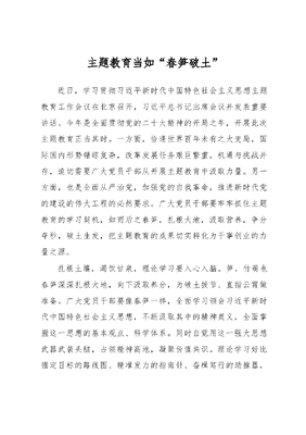 主题教育当如春笋破土近日,学习贯彻习近平新时代中国特色社会主义思想主题教育工作会议在北京召开,习近平总书记出席会议并发表重要讲话。今年是全面贯彻党的二十大精神的开局之年,开展此次主题教育正当其时。一方面,恰逢世界百年未有之大变局,国际国内形势错综复杂,改革发展任务艰巨繁重,机遇与挑战并存,迫切需要广大党员干部从开展主题教育中汲取力量。另一方面,也是全面从严治党,加强党的自我革命,推进新时代党的建设的伟大工程的必然要求。广大党员干部要牢牢抓住主题教育的学习契机,如雨后之春笋,扎根大地,汲取营养,争分夺秒,破土生发,把主题教育的成果切实转化为干事创业的力量之源。扎根土壤,渴饮甘泉,理论学习要入心入脑。笋,竹萌也春笋深深扎根大地,向下汲取养分,为破土拔节、直指云霄做准备。广大党员干部要像春笋一样,全面学习领会习近平新时代中国特色社会主义思想,不断汲取其中的精神奥义,全面掌握这一思想的基本观点、科学体系。同时自觉用这一强大思想武器武装头脑,占领精神高地,凝聚价值共识。理论学习好比锚定目标的路线图、精准发力的指南针、奋楫笃行的助推器,是广大党员干部的人格底色、干事创业的制胜法宝。理论知识浓缩实践的精华、汇聚经验的总结、预示发展的方向,要精读细度,切忌走马观花,要苦读深读,不能浅尝辄止,要持之以恒,否则就会半途而废。春雨一夜,生长一寸,实践调研要见行见效。春雨过后,山间竹笋破土而出,从而萌发新竹。习近平总书记指出,此次主题教育根本任务是学思用贯通,知信行合一,以实际成效检验学习效果。时代是思想之母,实践是理论之源。要不断将原著、原理、原文内化为理想信念,外化为实践行动,将人民群众满不满意、问题困难解没解决、生活条件提没提高作为日常工作的出发点、落脚点。调查研究不能浮于表面、流于形式,要深入基层一线,多从现场发现问题,回应民之关切。要善于拜民为师,甘做小学生,真正走进群众心中,感同身受老百姓的酸甜苦辣、喜怒哀乐。清淡质朴,有节有格,廉洁作风要走深走实。文人雅士喜爱竹笋清新淡雅的味道,视其为修身养性之物。习近平总书记强调要推动形成清清爽爽的同志关系、规规矩矩的上下级关系、亲清统一的新型政商关系。君子检身,常若有过。党员干部要三省吾生,守住底线,不越红线,筑牢防线,擦亮党员廉洁底色,自觉维护好、引领好政治生态和社会风气。要把法字贯穿始终,心中长悬正义之剑,自觉守法、依法用权、依法办事,培养法治思维,维护法律权威。要把公字坚持到底,把稳公与私的天平,严守公与私的界限,防止视公权为私器,养成以权谋私、为所欲为的行事作风,最终害人害己,后悔不已。要把廉字烂熟于心,深入骨髓,主动净化朋友圈,做好情与法的选择题,面对不正风气敢于亮剑。