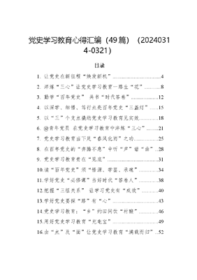党史学习教育心得汇编(49篇)(20240314-0321)目录1.让党史在新征程焕发新机42.淬炼三心让党史学习教育一路生花83.勤学百年党史 共书时代答卷..124.以深学、细悟、笃行点亮百年党史三盏灯155.以三个支点撬动党史学习教育见实效..186.@青年党员 在党史学习教育中淬炼三心..217.党史学习教育当下足春风化雨之功258.在百年党史的奔腾不息中听声谱曲..289.党史学习教育贵在见底..3110.读百年党史须悟源、学鉴、承魂..3411.学好党史必修课当好时代答卷人..3812.把握三组关系 让学习党史有成效4013.学好党史要探路有心.4314.党史学习教育:乡约田间饮村酿..4615.用好党史学习教育充电宝.4916.由点及面让党史学习教育满载而归..5217.学好党史这门必修课常修课.5518.用好党史大先生的三样法宝.5819.在常学常新中对话百年风华6120.笔墨纸砚书党史 丹青不渝铸忠诚6421.常尝百年党史的特别味道6722.在百年党史中一路生花..7023.四个维度在党史学习教育中一个不能少..7324.汲党史清泉润四心 用心答好时代考卷.7625.让党史学习教育硬盘存满干货8026.大道之行:感悟百年党史背后的精神力量8227.三下功夫让党史学习教育之花硕果累累..8528.党史裁出向阳花..8729.常学常新让党史铸魂润心..9030.学好用活党史学习教育这本教科书9331.赓续百年薪火蹚出共富新路.9632.以入为径让党史学习教育始终在线.9933.重温延安整风培树党史教育优良学风.10234.循迹党史经验读懂何以传承.10535.从心出发探寻党史新得.10836.深挖党史富矿以温故知心111文可居文库——海量学习资料,手机电脑均可下载www.wenkeju.com37.追逐党史高光时刻 铸就党员红色风骨..11338.学习往日党史 开辟来日新篇11639.用好党史量身镜 谱写时代新华章.11940.溯源百年党史 书写高分答卷12141.党史学习要时习、时思、时践..12442.在党史学习中厚植家国情怀12743.三大视角探寻百年党史奥秘.12944.三把钥匙解锁党史学习组合密码13245.@党员干部 常听党史回响 共奏奋进强音13446.从百年党史中读懂何以为民.13647.让党史学习教育更鲜活、有声势、见实效13948.读懂百年党史的巾帼花语..