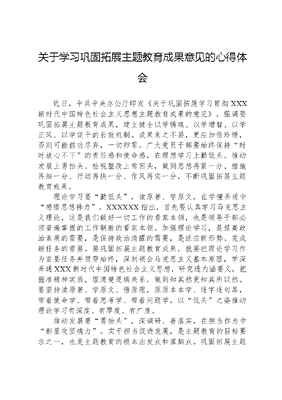 关于学习巩固拓展主题教育成果意见的心得体会近日,中共中央办公厅印发《关于巩固拓展学习贯彻XXX新时代中国特色社会主义思想主题教育成果的意见》,强调要巩固拓展主题教育成果,建立健全以学铸魂、以学增智、以学正风、以学促干的长效机制。成果来之不易,更应加倍珍惜,否则可能前功尽弃,一切归零。广大党员干部要始终保持时时放心不下的责任感和使命感,在理想学习上勤低头、推动发展上勇抬头、检视整改上常回头,做到思想再紧一分、措施再细一分、行动再快一分、作风再实一分,不断巩固拓展主题教育成果。理论学习要勤低头,读原著、学原文,在学懂弄通中感悟思想伟力。XXXXXX指出,首先要认真学习马克思主义理论,这是我们做好一切工作的看家本领,也是领导干部必须普遍掌握的工作制胜的看家本领。加强理论学习,是提高政治素质的需要,是保持政治清醒的需要,是适应新形势、完成新任务的需要。要巩固拓展主题教育成果,就要把理论学习作为首要任务并贯穿始终,深刻领会马克思主义基本原理,学深弄通XXX新时代中国特色社会主义思想,研究透内涵要义,把握准精神实质,理清楚逻辑关系,做到知其然更知其所以然。要坚持读原著、学原文、悟原理,原原本本学、逐字逐句品,带着使命学、带着思考学、带着问题学,以低头之姿推动理论学习有深度、有厚度、有广度。推动发展要勇抬头,深调研、善落实,在担当作为中彰显攻坚魄力。实干担当促进发展,是主题教育的目标要求之一,也是主题教育的根本出发点和落脚点。巩固拓展主题教育成果,就必须要把增进民生福祉、保障和改善民生作为发展的根本目的和首要任务,引导教育广大党员干部重实干、敢担当、善作为,攻坚克难、锐意进取,全心全意为人民群众做好事、办实事、解难事。要推动发展,必须要用好调查研究这个传家宝,深入基层、深入群众、深入一线,走进群众家里,走到田间地头,既看门面窗口,也看后院角落,既到先进的、工作成效突出的地方总结经验,也到落后的、工作打不开局面的地方发现问题,听取第一线声音,掌握第一手资料,把实情捞起来、问题找上来、对策提出来,把群众事办在点子上、谋在关键处,真正做到为民造福、为民谋利。检视整改要常回头,动真格、求实效,在刀刃向内中保持革命定力。回头看,就是对前期工作开展情况进行复盘,找出不足和问题,指明方向和目标,以达到推动发展、解决难题、增进福祉的目的。XXXXXX曾指出,无论什么时候,问题总是客观存在的,怕就怕对问题熟视无睹、视而不见,结果小问题变成大问题,小管涌演变为大塌方。要想巩固拓展主题教育成果,必须坚持问题导向,发扬刀刃向内的自我革命精神,把检视整改融入日常、抓在经常、形成自觉。要坚持严字当头、实字托底、改字落脚,对查摆出来的问题,紧盯不放,持续整改,出实招、下实功,真正做到动真碰硬、触及要害、取得实效。既要解决好当下问题,也要避免类似问题的出现,多开展回头看,跟踪整改进度、确保整改成效,持续巩固拓展主题教育成果。文可居文库——海量学习资料,手机电脑均可下载www.wenkeju.com