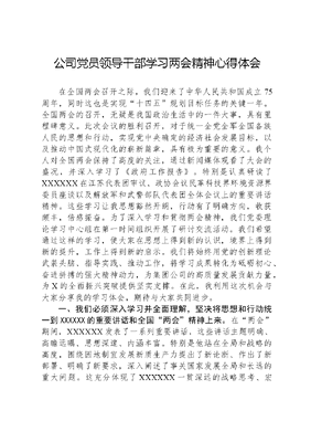 公司党员领导干部学习两会精神心得体会在全国两会召开之际,我们迎来了中华人民共和国成立75周年,同时这也是实现十四五规划目标任务的关键一年。全国两会的召开,无疑是我国政治生活中的一件大事,具有里程碑意义。此次会议的胜利召开,对于统一全党全军全国各族人民的思想和行动,实现党中央确定的经济社会发展目标,以及推动中国式现代化的崭新篇章,具有极为重要的意义。我个人对全国两会保持了高度的关注,通过新闻媒体观看了大会的盛况,并深入学习了《政府工作报告》。特别是认真研读了XXXXXX在江苏代表团审议、政协会议民革科技界环境资源界委员座谈以及解放军和武警部队代表团全体会议上的重要讲话精神。这些学习让我思想豁然开朗,行动有了明确方向,收获颇丰,倍感振奋。为了深入学习和贯彻两会精神,我们党委理论学习中心组在第一时间组织开展了研讨交流活动。我们希望通过这样的学习,使大家在思想上得到新的认识,境界上得到新的提升,工作上得到新的启示。我们将始终用党的创新理论武装头脑、指导实践、推动工作,将学习成果转化为砥砺初心、奋进拼搏的强大精神动力,为集团公司的高质量发展贡献力量,为X的全面振兴突破提供坚实支撑。在此,我利用这次机会与大家分享我的学习体会,期待与大家共同进步。一、我们必须深入学习并全面理解,坚决将思想和行动统一到XXXXXX的重要讲话和全国两会精神上来。在两会期间,XXXXXX发表了一系列重要讲话,这些讲话主题明确、高瞻远瞩、思想深邃、内涵丰富。特别是他站在全局和战略的高度,围绕因地制宜发展新质生产力提出了新论断、作出了新部署、明确了新要求,深入阐述了事关国家发展全局和长远的重大问题。这充分体现了XXXXXX一贯深远的战略思考、宏阔的理论视野、高超的政治智慧和深沉的忧患意识。这些讲话进一步创新发展了马克思主义生产力理论,是XXX经济思想的最新成果,也是两会精神最核心、最集中、最重要的内容。这些讲话具有极强的思想性、针对性和指导性,对全面建设社会主义现代化国家、全面推进中华民族伟大复兴具有重大而深远的意义。它们为我们开启现代化建设新征程指明了方向,也为我们做好新时代X事业注入了强大信心,提供了强劲动力。我们必须深刻领会XXXXXX重要讲话的精髓和核心要义,坚定拥护两个确立、坚决做到两个维护,增强看齐意识,始终在思想上、政治上、行动上同以XXX同志为核心的党中央保持高度一致。我们要知责于心、担责于身、履职于行,满怀信心地创新工作,奋发有为地建设新功业。二、我们必须牢记高质量发展的核心理念,它是新时代的核心任务,致力于推动中国式现代化的新实践,并为此贡献我们的力量。XXXXXX在全国人大十四届二次会议江苏代表团的审议中指出,我们必须深刻把握高质量发展的内涵,坚持以中国式现代化推动国家建设和民族复兴的伟大事业。我们必须深入理解和实践因地制宜,加快发展新质生产力的核心理念,坚持从实际出发,结合我们集团公司的资源优势、产业基础和科研条件,把握机遇,以敢闯敢干的精神推动各项工作的落实。我们必须重点推进传统产业的转型升级,新兴产业的发展壮大,以及科技人才队伍的建设,为培育发展新质生产力提供持续的动力。首先,我们必须加快传统产业的转型升级,聚焦供水主业,强化基础,提升数字化、信息化、智能化管理水平,优化水费营收系统,完善GIS管网信息系统,加快建设无水泵站,论证黑灯水厂和数字孪生水厂的建设,以持续强化主业链条。其次,我们必须加快数字X产业的发展,积极适应行业智慧化发展趋势,聚焦集团数字化转型的迫切需求,以产学研联盟为技术支撑,全力推动智慧X公司的建设,提高集团公司的营收水平和自主创新能力,开拓X地区的广阔项目市场,引领集团文可居文库——海量学习资料,手机电脑均可下载www.wenkeju.com的高质量发展。最后,我们必须加快科技人才队伍的建设,将其作为重中之重,大力引进、培养和利用人才,为优秀人才提供必要的支持和良好的环境,营造崇尚创新、鼓励探索、追求卓越、宽容失败的文化氛围,让人才能够全身心投入研究,努力打造一批符合集团公司科技发展战略的一流创新团队,培养一支具有规模的青年科技人才队伍。三、迅速行动,确保贯彻落实,切实运用XXXXXX的重要讲话精神和全国两会精神形成奋进合力。根据市委对全国两会精神传达学习的部署要求,我们必须将学习和贯彻XXXXXX的重要讲话精神和全国两会精神作为当前和未来一个时期的首要政治任务,不断加强党的创新理论武装,进一步坚定拥护两个确立、坚决做到两个维护的思想基础,汇聚全体成员沿着XXXXXX指引的方向前进的强大动力。强化示范带头作用,发挥领导班子的引领效应。在座的领导班子成员作为公司的关键少数,应始终以身作则,树立标杆,展现示范效应。展现挤和钻的精神,先行一步,深入学习,深刻领悟,