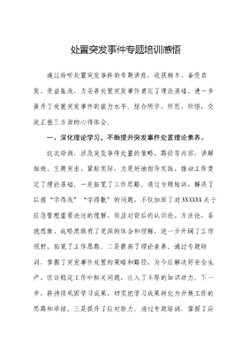 处置突发事件专题培训感悟通过聆听处置突发事件的专题讲座,收获颇丰、备受启发、受益匪浅,为妥善处置突发事件奠定了理论基础,进一步提升了处置突发事件的能力水平。结合所学、所思、所悟,交流汇报三方面的心得体会。一、深化理论学习,不断提升突发事件处置理论素养。这次培训,涉及突发事件处置的策略、路径等内容,讲解细致、主题突出、紧贴实际,为更好地指导实践、推动工作奠定了理论基础。一是拓宽了工作思路。通过专题培训,解决了以前学得浅学得散的问题,不仅加深了对XXXXXX关于应急管理重要论述的理解,而且对背后的认识论、方法论、系统思维、战略思维有了更深的体会和理解,进一步开阔了工作视野、拓宽了工作思路。二是提高了理论素养。通过专题培训,掌握了突发事件处置的策略和路径,为今后解决好安全生产、信访稳定工作中相关问题,注入了丰厚的知识动力。下一步,将持续巩固学习成果,切实把学习成果转化为开展工作的思路和举措。三是提升了应对能力。通过专题培训,掌握了应对突发事件的方式方法,为今后做好工作提供了遵循。下一步,将定期深入包联乡镇、分管领域,加强调查研究,解决好突发事件应急处置方面存在的问题,破解制约工作开展的瓶颈问题。同时,还要站位全县,为县委提出建设性意见建议。二、提高政治站位,切实增强处置突发事件的责任感。坚决贯彻落实XXXXXX重要批示精神,全面防范化解各类风险隐患,提升应对风险能力能力,以实际行动捍卫两个确立、做到两个维护。一要强化责任担当。树固以人民为中心的理念,切实增强时时放心不下的责任感,将统筹发展和安全落实到本职工作始终,严格落实安全生产一岗双责,强化系统思维,抓好源头防范,扛稳扛牢安全生产、防范化解风险、维护稳定各项责任,定期到包联乡镇督导,建章立制、完善设施、压实责任,严防安全生产事故发生。二要强化作风建设。树立和践行正确政绩观,以雷厉风行、不折不扣、求真务实的过硬作风防风险、保安全、护稳定、促发展,增强自觉执行、主动执行、严格执行的意识,确保上级和县委各项决策部署要求正确、迅速、有效地贯彻落实。三要狠抓落文可居文库——海量学习资料,手机电脑均可下载www.wenkeju.com实提升。坚持凡事皆有解、问题止于我的斗争精神,围绕突发事件应急处置,做到问题大起底、末端真落实。同时,细致研究,主动作为,全力做好突发事件危机研判、预警、处置等机制建设,确保应急处置各项工作高效有序。三、认真履职尽责,不断提高维护社会安全稳定工作质效。围绕县委、县政府中心工作,谋划实施好政法信访各项工作举措,狠抓末端落实,为全县经济社会发展创造安全稳定的社会环境。一是坚决维护社会稳定。坚持问题导向,对涉稳隐患进行一次大起底、大排查、大化解,把情况摸透、把问题找准,对哪里有短板、哪里有问题、哪里是薄弱环节,做到心中有数、彻底整改。坚持每周研判涉稳形势,及时防范化解涉稳风险隐患。围绕重大节点,落实好治安防控各项措施,确保社会安全稳定。二是不断夯实基层基础。完善矛盾纠纷多元化解机制,确保矛盾纠纷解决在当地、化解在萌芽。深入推进信访工作预防、受理、办理、追责问责、维护秩序法治化,依法开展信访各项工作,严防信访事件处置不当演变次生问题。开展文可居文库——海量学习资料,手机电脑均可下载www.wenkeju.com星级平安村居、枫桥式派出所司法所、民主法治示范村居创建活动,提升基层治理效能。三是全力提供法治保障。树牢法治理念,落实好重大决策重大项目社会稳定风险评估工作,做到应评尽评,源头防范重大风险隐患。坚持和发展新时代枫桥经验,推动矛盾问题预防在前、调解优先、运用法治、就地解决。深入开展八五普法,引导广大干部群众自觉守法、遇事找法、解决问题靠法。加强县法学会建设,强化法律咨询工作保障,为党委政府依法决策提供法律服务。文可居文库——海量学习资料,手机电脑均可下载www.wenkeju.com