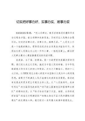切实把好事办好、实事办实、难事办妥 XXXXXX强调:把心系群众、情系百姓体现到履职尽责全过程各方面,着力保障和改善民生,及时回应人民群众合理诉求,切实把好事办好、实事办实、难事办妥。人民至上不是一个抽象的概念,要体现在经济社会发展各方面各环节,体现在办好人民群众关心的一件件小事、一桩桩实事上,解决好人民群众最关心最直接最现实的利益问题。我是谁、为了谁、依靠谁,是一个政党首先要解决好的问题。我们党从成立之日起,就把为中国人民谋幸福、为中华民族谋复兴作为自己的初心和使命,并为之不懈奋斗。党的十八大以来,以XXX同志为核心的党中央坚持以人民为中心的发展思想,着眼于不断满足人民日益增长的美好生活需要,推动改革发展成果更多更公平惠及全体人民。从人民有所呼、改革有所应的全面深化改革到决不能让困难地区和困难群众掉队的精准扶贫,从给子孙后代留下天蓝、地绿、水净的美好家园的生态文明建设到向群众身边不正之风和腐败问题亮剑的反腐败斗争,我们党以一系列重大政策举措惠民生、纾民困、解民忧,人民群众的获得感、幸福感、安全感不断增强。民生无小事,一点一滴、一桩一件都连着民心民意。切实把好事办好、实事办实、难事办妥,需要增进群众感情、讲求方式方法。党员干部要始终把人民放在心中最高位置,用心用情用力办利民之事,努力为人民群众谋福祉。用心就是要坚持以百姓心为心,把事关人民群众利益的事情看在眼里、记在心里、落在行动上。党员干部要深入群众,从群众切身需要来谋划工作,而不是坐在办公室主观臆断,拍脑袋、想当然。迈开双腿走下去,敞开身心沉下去,才能看得真切、感受深切,真正把工作做到群众心坎上。要用心观察群众的生活境况,用心倾听群众的所思所想、所愿所盼,聚焦解决就业、教育、医疗、托育、住房、养老等突出问题,建立民生项目清单,把每一件事落到实处,不断提高人民生活品质。用情就是要带着对人民群众的深厚感情来做事。对群众有没有感情,是不是带着深厚感情做工作,对工作实际成效有着重要影响。有些地方和部门做了不少工作,但没有取得应有效果,一个重要原因就是在推进工作时习惯于站在管理者的角度,对群众感情淡漠,工作中态度生硬,导致工作得不到群众的理解和支持。党员干部要增强群众观念和群众感情,对于群众生产生活中遇到的烦心事、揪心事,都应站在群众的角度换位思文可居文库——海量学习资料,手机电脑均可下载www.wenkeju.com考,用真情拉近与群众的距离,从而使各项工作更好得到群众的理解和支持。用力就是要竭尽全力做好事,千方百计做成事。群众的烦心事、揪心事往往牵涉各种利益和矛盾,不是轻而易举就能解决好的。为群众做好事、办实事、解难事,要善于运用科学的方式方法,聚焦急难愁盼问题,根据实际情况下一番真功夫、苦功夫,通过解剖一个问题推动解决一类问题,让群众看到实实在在的变化。要勇于涉险滩、破难题,对于当下能解决的及时解决,一时解决不了的要列出时间表、路线图,久久为功、持续用力,用实干推动发展、取信于民。强国梦、中国梦,归根到底是老百姓的幸福梦。新征程上,广大党员干部要诚心诚意为民解忧,尽心尽力为民谋福,切实把好事办好、实事办实、难事办妥,真正让人民群众看到变化、得到实惠,不断把人民对美好生活的向往变为现实。文可居文库——海量学习资料,手机电脑均可下载www.wenkeju.com