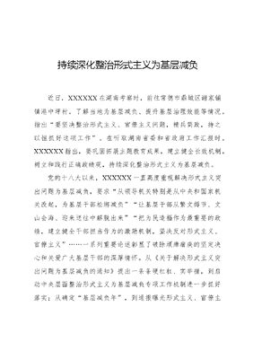 持续深化整治形式主义为基层减负近日,XXXXXX在湖南考察时,前往常德市鼎城区谢家铺镇港中坪村,了解当地为基层减负、提升基层治理效能等情况,指出要坚决整治形式主义、官僚主义问题,精兵简政,持之以恒抓好这项工作。在听取湖南省委和省政府工作汇报时,XXXXXX指出,要巩固拓展主题教育成果,建立健全长效机制,树立和践行正确政绩观,持续深化整治形式主义为基层减负。党的十八大以来,XXXXXX一直高度重视解决形式主义突出问题为基层减负,要求从领导机关特别是从中央和国家机关改起,为基层干部松绑减负让基层干部从繁文缛节、文山会海、迎来送往中解脱出来把为民造福作为最重要的政绩,建立健全干部担当作为的激励机制,坚决反对形式主义、官僚主义……一系列重要论述彰显了破除顽瘴痼疾的坚定决心和关爱广大基层干部的深厚情怀。从《关于解决形式主义突出问题为基层减负的通知》提出一条条硬杠杠、实举措,到启动中央层面整治形式主义为基层减负专项工作机制进一步抓好落实;从确定基层减负年,到通报曝光形式主义、官僚主义典型案例,等等,在党中央有力推动下,一系列为基层减负的举措落地见效。形式主义官僚主义之弊非一日之寒,从根子上减轻基层负担也非一日之功。当前一些形式主义、官僚主义问题依然顽固多发,既有反弹回潮的老问题,也有隐形变异的新马甲。要聚焦突出问题打好攻坚战,强化建章立制打好持久战,实实在在为基层减真负、真减负,让基层干部群众在真抓实干中推动高质量发展取得新成效。坚持上下联动为基层干部松绑减负。下之所以为,惟上是视。加重基层负担的形式主义问题表现在下面,源头往往在上级机关和部门。一些上级领导干部作风不实,对基层情况不掌握,做决策脱离实际,上面拍脑袋、下面跑断腿。一些基层干部政绩观错位、责任心缺失,看上不看下只唯上不唯实,只求领导欢心不对人民负责。为此,要坚持上下联动,抓住关键少数,督促从领导机关和领导干部改起,经常性深入基层听真话、察实情,对自身存在的形式主义、官僚主义问题,主动查摆、带头整改。上下贯通一体纠治,该哪一级整改就推动哪一级整改,涉及多个部门的还要同题共答,确保问题真改、实改、改到位。健全基层减负常态化机制。持续发力,方能久久为功,以文可居文库——海量学习资料,手机电脑均可下载www.wenkeju.com常态求长效。要保持严的基调,锚定小马拉大车等突出问题,持续向不正之风亮剑,既着力根治老毛病,也时刻关注新情况,以钉钉子精神一抓到底。要对普遍发生的问题深化专项整治,强化以案促改促治,着力堵塞制度漏洞,健全责任清单,进一步明晰应尽之责和应减之负。要注重源头治理,找准党性觉悟上的深层原因,坚决纠正政绩观异化、权力观扭曲、事业观偏差等问题,从思想和利益根源上着力破解。用好正反典型,以反面案例强化警示教育,以先进典型强化示范引领,加大案例指导、通报曝光力度,以一个个鲜活案例教育引导党员干部自觉力戒形式主义、官僚主义。把为基层减负与激励担当作为更好结合起来。既要为干部减负,也要为实干赋能。要树立大抓基层的鲜明导向,真正重视基层、关心基层、支持基层,推动基层党组织建设全面规范、全面过硬,推动基层党员干部重实干、重实绩、重担当。进一步完善干部考核评价机制,树立正确用人导向,把愿作为、能作为、善作为的干部选出来、用起来。推动三个区分开来具体化、规范化,严肃查处诬告陷害行为,及时做好澄清正名工作,为担当者担当、为实干者撑腰。减负担、增效能、聚合力,让干部有更多时间和精力抓落实,恪尽职守、担当作为,更好为群众办实事、解难题,不断干出让群众认可的实绩。文可居文库——海量学习资料,手机电脑均可下载www.wenkeju.com纪检监察机关要深入贯彻落实XXXXXX重要讲话精神,按照中央纪委三次全会部署,重拳纠治干部群众反映强烈的形式主义、官僚主义,紧盯加重基层负担现象,持续纠治文山会海、督查检查调研扎堆、工作过度留痕、任务层层加码、指尖上的形式主义等问题,完善细化对形式主义、官僚主义的惩戒机制,推动党员干部多在实效上用真功夫、少在形式上动歪脑筋,真抓实干奋进新征程、建功新时代。文可居文库——海量学习资料,手机电脑均可下载www.wenkeju.com