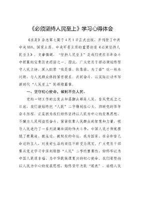 《必须坚持人民至上》学习心得体会《求是》杂志第七期于4月1日正式出版,并刊登了中共中央XXX、国家主席、中央军委主席的重要论述《必须坚持人民至上》。文章强调,坚持人民至上是我们党在百年奋斗中积累的宝贵历史经验之一。因此,广大党员干部必须始终坚守人民立场,深入回答我是谁、依靠谁、为了谁这一根本问题,与人民群众保持紧密联系,共同奋斗,以实际行动书写新时代人民至上的辉煌篇章。一、坚守初心使命,做到不负人民。党的一切工作的出发点和落脚点都是人民,自从党成立之日起,我们就始终把人民二字镌刻在心头。回顾党的百年奋斗历程,正是因为我们始终坚持以人民为中心的发展思想,不懈为人民利益而奋斗,紧紧依靠人民群众的智慧和力量,领导人民进行了一系列波澜壮阔的伟大斗争,中国人民才彻底摆脱了被欺凌、被压迫、被奴役的命运,成为国家、社会和自己命运的主人,对美好生活的向往不断变为现实。广大党员干部要从党史学习中深刻领悟人民二字的重要性,始终牢记为中国人民谋幸福、为中华民族谋复兴的初心使命。我们要坚持以人民为中心的发展思想,始终坚守为民底色,站稳人民立场,时刻把人民群众的安危冷暖、安居乐业放在心上,把人民对美好生活的向往作为我们的奋斗目标。我们要以我将无我,不负人民的情怀和境界,切实做好为民服务各项工作,不断满足人民群众对美好生活的向往。二、贯彻群众路线,做到服务人民。回顾我们党百年的光辉历程,其历史就是一部紧密联系群众、与人民心连心的史诗:是广大人民用小推车助力了淮海战役的伟大胜利,用小木船助力了渡江战役的辉煌胜利,用小铁锹挖掘出了丰富的石油资源,用众志成城的精神筑起了抗击新冠疫情的坚固堡垒。党员干部必须始终弘扬务实担当、求真务实、改革创新的精神,坚守群众路线,深入群众的生产生活,贴近群众的心声。要深入田间地头,亲近群众的生活,倾听群众的心声,关注群众的疾苦,从柴米油盐等细微之处洞察民情,耐心细致地解答群众的疑惑,竭尽全力为群众排忧解难。我们要切实将人民对美好生活的向往转化为具体可行的措施,让群众希望变为我们做到,不断满足人民群众对美好生活的期待。三、坚定信念信仰,做到依靠人民。XXX明确指出,人民是历史的创造者和真正的英雄。他们既是历史的见证者,也是历史的参与者,从毛泽东同志亲自批文可居文库——海量学习资料,手机电脑均可下载www.wenkeju.com示的枫桥经验到小岗村的包干到户,从中国速度到中国高度,这些辉煌的历史成就,都源于广大劳动者的辛勤付出、无私奉献和忘我投入。党员干部要深刻认识到人民群众的首创精神的重要性,深刻理解发展为了人民、发展依靠人民的核心理念。我们要善用民主协商这一有效手段,广泛征求群众的意见和建议,关心他们的需求和感受,真正把实事办好、好事办实。我们要紧密团结村两委、党员、小组长、村民代表、乡贤名士等关键力量,倾听他们的声音,了解他们的需求,汇聚他们的智慧,共同推动各项工作的顺利开展。只有这样,我们才能更好地服务人民,实现人民的根本利益,共同创造更加美好的未来。文可居文库——海量学习资料,手机电脑均可下载www.wenkeju.com