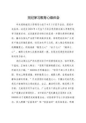党纪学习教育心得体会中央党的建设工作领导小组于4月3日召开会议,经党中央批准,决定自2024年4月至7月在全党范围内深入开展党纪学习教育活动。此次教育活动的目的是进一步强化党的纪律建设,推动全面从严治党不断向纵深发展。各级党组织和广大党员干部必须高度重视,切实加大学习力度,深入领会党规党纪的精髓要义,积极培育敬畏之心赤子之心纯净之心,确保与党和人民保持高度一致,共同为实现党的宏伟目标而努力奋斗。我们必须以庄严的态度对待手中所拥有的权力,恪守职责,不滥权。正如古人所言:畏则不敢肆而德以成,无畏则从其所欲而及于祸。XXXXXX亦明确指出:领导干部工作上要大胆,用权上则要谨慎,常怀敬畏之心、戒惧之意,自觉接受纪律和法律的约束。只有持续怀有敬畏之心,手握法纪的尺度,我们才能确保权力得到依法、公正、廉洁的行使,既实现工作目标,又避免任何不当行为。广大党员干部应深入研读《中国共产党廉洁自律准则》、《中国共产党纪律处分条例》以及XXXXXX关于党规党纪的重要论述,切实将学习与工作实际相结合,深入理解正面清单和负面清单的具体要求,明确自身的职责与权限。同时,通过深入剖析上级通报的典型案例以及身边的反面教材,我们应当从中汲取深刻的教训,增强对党纪国法的敬畏之心,坚定改正错误的决心,找准预防问题的关键,始终在党规党纪的严格约束下,恪尽职守,确保不触碰任何违规违纪的高压线。以坚定的政治立场和深厚的人民情怀,我们党始终站稳人民立场,以全心全意为人民服务为宗旨。在党的大会报告中,主席XXX向全党同志发出号召,务必敢于斗争、善于斗争,这体现了我们党对于发扬斗争精神、增强斗争本领的坚定决心和高度重视。为进一步加强党的纪律建设,确保党的各级组织和全体党员始终坚守党的纪律和规矩,2024年正式施行的《中国共产党纪律处分条例》明确了对工作中不敢斗争、不愿担当的处分规定,彰显了党的严明纪律和坚强决心。广大党员干部要时刻铭记自己的职责使命,勇于自我革命,敢于同自身的缺点和不足作斗争。要充分利用教育、三会一课、民主生活会等契机,对照党规党纪、人民期待、先进模范和身边榜样,不断检视自己,找准思想、作风、廉洁等方面容易出现问题的风险点。同时,要以最短的时间、最严的手段抓好整改落实,坚决消除自身存在的病灶,确保党的肌体健康。广大党员干部还要敢于同消极腐败和歪风邪气作斗争,深刻把文可居文库——海量学习资料,手机电脑均可下载www.wenkeju.com握九个以的实践要求,始终保持迎难而上的斗争志气。面对各种诱惑和陷阱,要坚决做到不理会不商量,永葆对党和人民绝对忠诚的赤子之心。在干事创业的过程中,要始终保持心无旁骛的精神状态,以袍敝衣处其间,略无慕艳缊意的坚韧和执着,为实现中华民族伟大复兴的中国梦而不懈奋斗。以纯洁之心维护党的形象。坚守政治立场必须自我约束。在党的代表大会报告中,主席XXX强调:全面强化党的纪律建设,促使领导干部特别是高级干部自我约束、切实担责、严格管理所辖范围。众多违纪违法案例深刻表明,党员干部职位越高、权力越大,越应自我约束、自我警醒,否则更易失去共产党人的政治本色。广大党员干部应自觉继承清正廉洁的红色传统,严格遵守党的政治纪律和政治规矩,坚定政治立场。无论身处基层一线,还是边疆要地,亦或是在攻坚克难的关键时刻,都应时刻自我约束,积极履行职责,八小时内外都应保持清醒的头脑和严谨的作风。将党纪学习教育作为长期的必修课,时刻保持警醒,常思己过,多防微杜渐,坚决抵制贪欲,筑牢思想道德防线,打造健康向上的社交环境,真正以实际行动践行守纪律、知规矩、明底线的庄严承诺。文可居文库——海量学习资料,手机电脑均可下载www.wenkeju.com