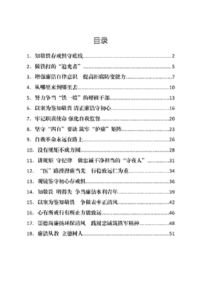 目录1.知敬畏存戒惧守底线..22.做铁打的追光者..53.增强廉洁自律意识 提高拒腐防变能力.74.从哪里来到哪里去.105.努力争当铁一般的硬核干部.136.以案为鉴知敬畏 清正廉洁守初心167.牢记职责使命 强化自我监督..208.坚守四自要诀 筑牢护廉矩阵..239.自我革命永远在路上2610.没有规矩不成方圆..2811.讲规矩 守纪律 做忠诚干净担当的守夜人.3112.医路漫漫廉当先 行稳致远仁为重3413.观镜鉴守初心存戒惧.3614.知敬畏 明得失 争当廉洁水利青年..3915.以案为鉴知敬畏 争做表率正清风..4216.心有所戒行有所止方能致远.4617.崇德尚廉扬环保清风 践履忠诚筑铁军精神.4818.廉洁从教 立德树人5119.锻造过硬自我 用忠诚干净担当书写交通答卷5320.以高度的三个自觉坚定理想信念.56文可居文库——海量学习资料,手机电脑均可下载www.wenkeju.com知敬畏存戒惧守底线近期通过党组理论学习中心组学习会和个人自学等方式,我认真学习了XXXXXX、李希同志在第二十届中央纪律检查委员会第三次全体会议上的讲话和报告、陈忠伟书记在全市领导干部警示教育大会上的讲话精神,观看了央视警示教育片《持续发力纵深推进》以及我市警示教育片《自我革命永不止步》,深刻汲取警示教训,时刻保持赶考的清醒,不断提高政治判断力、政治领悟力、政治执行力,坚定捍卫两个确立、坚决做到两个维护,不断推进自我革命、树好高线、守牢底线,切实做到忠诚干净担当。下面,我结合自己所学所思所悟,浅谈几点心得体会。一是坚定理想信念,强化理论武装。XXXXXX强调,理想信念是主心骨,纪律规矩是顶梁柱,没有了这两样,必然违背党的宗旨,做人做事就会走偏走邪,思想就会百病丛生,人生就会迷失方向。坚定理想信念从哪里来?就是要坚持不懈用XXX新时代中国特色社会主义思想凝心铸魂,严格落实第一议题制度,全年组织开展党组理论学习中心组集中学习不少于12次,深学细悟XXXXXX关于江苏工作重要讲话精神重要指示批示精神、关于科技创新重要讲话重要指示批示精神、关于党的自我革命的文可居文库——海量学习资料,手机电脑均可下载www.wenkeju.com重要思想,贯通学悟XXXXXX重要讲话特别是关于全面从严治党、党风廉政建设和反腐败斗争的重要论述,结合主题教育系统学、反复学、长期学,进一步牢固树立践行正确政绩观,不断提高把握政策、推动改革、促进发展、加强党建的能力,把学习成果转化为坚守初心、勇担使命的实际行动。二是严明政治纪律,提高政治站位。政治纪律和