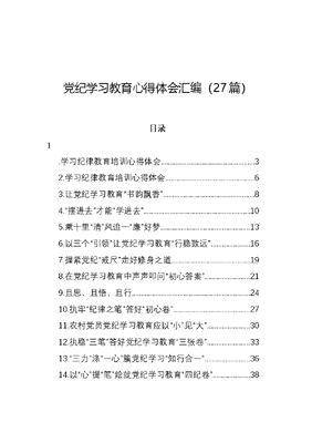 党纪学习教育心得体会汇编(27篇)目录1.学习纪律教育培训心得体会32.学习纪律教育培训心得体会63.让党纪学习教育书韵飘香..84.摆进去才能学进去.105.乘十里清风追一廉好梦136.以三个引领让党纪学习教育行稳致远167.握紧党纪戒尺走好修身之道.198.在党纪学习教育中声声叩问初心答案219.且思、且悟、且行.2410.执牢纪律之笔答好初心卷..2711.农村党员党纪学习教育应以小见大..3012.执稳三笔答好党纪学习教育三张卷..3313.三力涤一心簇党纪学习知行合一3614.以心提笔绘就党纪学习教育四纪卷..3815.用心拨弦让党纪学习教育有度可循..4116.以党纪为规矩画好人生方圆.4417.党纪学习教育当学在前、想在前、走在前.4718.把好三关让党纪学习教育有声有色..5019.执笔答好党纪学习教育三张卷..5320.置顶党纪学习教育点亮三颗红心.5821.三点发力推动党纪学习教育往里走..6122.以常在状态书长效文章.6423.用好尺规笔巧绘党纪学习教育几何图.6624.写好党纪学习教育紧、谨、警文章..6925.党纪学习教育莫忘最后一公里7126.党纪学习教育要修炼三心做好三人..7427.党纪学习教育当注重学思用.77文可居文库——海量学习资料,手机电脑均可下载www.wenkeju.com学习纪律教育培训心得体会近期我认真学习了XXXXXX关于党纪学习教育的重要讲话精神,以及新修订的《中国共产党纪律处分条例》,深刻体会到严守党的纪律是所有党员入党时立下的铮铮誓言,严守政治规矩是每个党员必须坚守的政治操守,深感其对党员行为规范的严谨要求以及对全面从严治党的坚定决心。以下是我的几点学习心得体会。一、与时俱进,彰显时代特色。新修订的《中国共产党纪律处分条例》紧密结合新时代党的建设总要求,充分体现了党中央对全面从严治党、加强纪律建设的最新部署和战略考量。近三年来,XXXXXX对加强新时代党的建设提出了一系列新要求,特别是进一步强调把党的政治建设摆在首位,严肃党内政治生活,净化党内政治生态,防止党内形成利益集团,巩固拓展落实中央八项规定精神成果等。这些在《条例》中得到了贯彻体现,并转化为纪律要求。这使我深刻认识到,作为一名基层党务工作者,必须时刻保持理论学习的敏锐性,紧跟党中央的步伐,以适应不断变化的形势任务,确保党务工作与时代发展同频共振。文可居文库——海量学习资料,手机电脑均可下载www.wenk