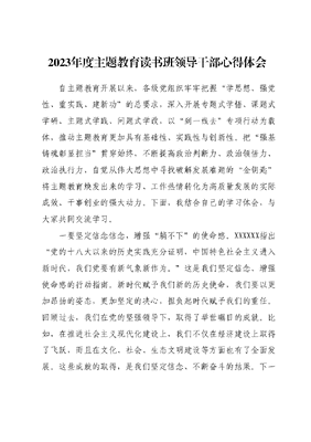 2023年度主题教育读书班领导干部心得体会自主题教育开展以来,各级党组织牢牢把握学思想、强党性、重实践、建新功的总要求,深入开展专题式学悟、课题式学研、主题式学践、问题式学改,以到一线去专项行动为载体,推动主题教育更加具有基础性、实践性与创新性。把强基铸魂彰显担当贯穿始终,不断提高政治判断力、政治领悟力、政治执行力,自觉从伟大思想中寻找破解发展难题的金钥匙将主题教育焕发出来的学习、工作热情转化为高质量发展的实际成效、干事创业的强大动力。下面,我结合自己的学习体会,与大家共同交流学习。一、坚持学深悟透,强化创新理论武装。XXXXXX指出:没有理论的高度,就没有行动的深度。这一论断深刻揭示了理论武装的极端重要性。在当前国内外形势下,我们要更加深入地学习党的创新理论,不断提高政治判断力、政治理解力、政治执行力。在实际工作中,我们始终将理论学习放在首位,以党的创新理论指导实践、推动工作。比如,我们在深化供给侧结构性改革中,坚持新发展理念,推动经济高质量发展,取得了明显成效。作为党员干部,我们要继续加强学习,系统掌握XXX新时代中国特色社会主义思想的理论体系、历史地位、实践要求;要在工作实践中不断检验和丰富理论,不断提高运用理论解决实际问题的能力,确保理论学习和实践紧密结合。二、坚持以学促干,强化成效转化运用。XXXXXX强调:要把学习成果转化为推动工作的强大动力。我们要将学习和工作紧密结合起来,通过学习来指导工作,以工作的成效来检验学习的成果。我们要在学习中提炼思想,转化为工作中解决问题的方案和措施。在各项社会治理创新扶贫攻坚、环境保护等工作中,我们将学习成果转化为具体行动实现了理论与实践的有效对接。作为党员干部,我们要持续用学习成果武装头脑,用以指导工作,特别是要转化为推动高质量发展的实际能力;要通过持续的学习实践,提升解决复杂问题的本领,确保各项任务落到实处,取得实效。三、坚持党建引领,推动全面从严治党。XXXXXX指出:全面从严治党永远在路上。这一论断强调了党建工作在党和国家事业发展中的基础性地位。作为党员领导干部,我们要以身作则发挥示范作用,推动党的建设在新时代展现新气象、实现新作为在党建工作中,我们始终坚持党要管党、全面从严治党。如在推进纪律建设、作风建设等方面,我们坚定不移,确保党建工作取得实效。作为党员干部,我们要坚持把党建工作作为最大的政治持续推进党的政治建设、组织建设、作风建设、纪律建设和制度建设;要加强干部队伍建设,确保党员干部能够严于律己,清正廉洁;要通过党建引领带动工作创新,形成推动发展的强大合力同志们,让我们在XXX新时代中国特色社会主义思想的指引下紧密结合新的历史方位,不断深化学习、转化成效,强化党建引领,为实现党的历史使命和人民对美好生活的向往而不懈奋斗。
