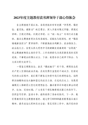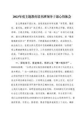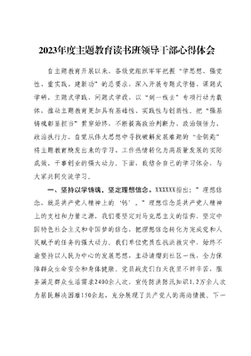 2023年度主题教育读书班领导干部心得体会自主题教育开展以来,各级党组织牢牢把握学思想、强党性、重实践、建新功的总要求,深入开展专题式学悟、课题式学研、主题式学践、问题式学改,以到一线去专项行动为载体,推动主题教育更加具有基础性、实践性与创新性。把强基铸魂彰显担当贯穿始终,不断提高政治判断力、政治领悟力、政治执行力,自觉从伟大思想中寻找破解发展难题的金钥匙将主题教育焕发出来的学习、工作热情转化为高质量发展的实际成效、干事创业的强大动力。下面,我结合自己的学习体会,与大家共同交流学习。一、深化学习、坚定信念,系好人生第一粒扣子。XXXXXX强调:全党必须长期坚持的重要工作是学习马克思主义基本理论。这一论断指出了坚定理想信念的重要性,提醒我们必须始终把学习作为提高政治素养、坚定政治信仰的根本途径。历史和现实都告诉我们,只有理论上清醒、信仰上坚定,我们才能在复杂的国际国内环境中保持正确的方向。我们在推动社会主义现代化建设中,始终坚持理论联系实际,用XXX新时代中国特色社会主义思想武装头脑,指导实践,解决问题。作为党员干部,我们必须继续深化对XXX新时代中国特色社会主义思想的学习,坚持读原著、学原文、悟原理;要在学懂弄通做实上下功夫,确保党的创新理论深入人心;要在工作和生活的每一个细节中体现出坚定的信念,以实际行动证明对党的忠诚。二、实干笃行、恪尽职守,驰而不息走好长征路。XXXXXX指出:空谈误国,实干兴邦。这句话彰显了实干的重要性,提醒我们必须以马克思主义的务实精神,不断推进各项工作的深入发展。在我们党的历史上,无数革命先辈都是用自己的实际行动书写了光辉历史。在当下,我们在促进经济发展、改善民生等方面取得的成绩,都是实干精神的具体体现。作为党员干部,我们要坚持目标导向,注重结果,强化执行力;要在实际工作中展现恪尽职守、埋头苦干的精神状态,把每一项工作都做实做细、做到位;要持续推进作风建设,确保党员干部队伍在新长征路上永远保持奋斗状态。三、心系家国、躬身为民,全心全意为人民服务。XXXXXX强调:人民对美好生活的向往,就是我们的奋斗目标。这句话指明了我们的工作始终要以人民为中心,牢记全心全意为人民服务的根本宗旨。在我们的工作实践中,我们始终坚持以人民为中心的发展思想,无论是在教育、卫生等领域的工作中,都始终坚持以民为本、服务民众。作为党员干部,我们要继续增强为民服务的意识,把群众的利益放在最高位置;要不断提高服务质量和效率,切实解决群众的烦心事、难心事;要在工作中倾听民声、回应民意、集中民智,确保每一项决策和部署都符合人民群众的期待和需要。