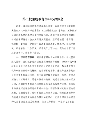 第二批主题教育学习心得体会近期,通过院内组织学习及本人自学,认真学习了《党的XX大报告》《中国共产党章程》《XXX著作选读》等内容,更加深刻认识到新思想的真理力量和实践伟力,理解了聚焦学习贯彻XXX新时代中国特色社会主义思想主题教育,应严格按照学思想、强党性、重实践、建新功的总要求读原著、悟原理,在以学铸魂、以学增智、以学正风、以学促干上下功夫,现结合本职工作及自身实际,谈谈如下感悟。一、筑牢思想防线。阅读是掌握知识的关键手段,经过屡次深入阅读,我们能够对知识有更深的理解与感悟。XXX新时代中国特色社会主义思想是当下时代的马克思主义发展,蕴含着中华文化与中国精神的时代精髓,它在国家的革命、建设与发展中起到了至关重要的指导作用。为了深刻理解并实施这一思想,我们必须持之以恒地学习、思考并领会其精神。通过对经典文献的反复研读,我们能够更加深入地理解其核心理念与精神实质。我们应当细致地探究这些思想的意涵和价值,不断加深对党创新理论的理解。在此过程中,我们不仅能获得更为全面、精准的理论知识还能逐步塑造坚定的信念和强烈的责任心。党员干部作为推动党和人民事业发展的关键力量,应当以身作则,率先学习并贯彻XXX新时代中国特色社会主义思想;应当展现出刻苦钻研的精神,深度学习党的创新理论,以增强思想的力量,深刻理解两个确立的决定性意义,坚定不移地做到两个维护。我们要始终保持对党创新理论的信仰和忠诚,不断提升个人素养与能力,敢于承担责任,主动求新求变。唯有如此,方能更有效地为中华民族伟大复兴的中国梦贡献力量。二、提高履职能力展。书本上的知识终究是有限的,真正的理解和掌握需要我们亲身去实践。新时代的伟大成就是由党和人民共同奋斗、努力赢得的。我们要把握主题教育的契机,学会将所学与实践相结合,真正实现知行合一。只有在实践中不断磨砺才能真正提升我们的能力与素养。XXX新时代中国特色社会主义思想是党的指导原则,也是指导我们工作的行动纲领。这一思想明确了中国特色社会主义的道路、理论体系、制度体系的内在统一并为我们指出了前进的方向。在新的征途上,党员干部要深入学习这一思想,用其指导我们的实际工作。实干是实现目标的必经之路,也是展示责任担当的最佳方式。党员干部要积极培养担当实干的精神,以不断的责任感和使命感投身于重点中心工作。通过实际行动,我们必须不断开辟工作新局面。在此过程中,我们可能会遇到各种挑战与困难,但只有通过实际行动,我们才能克服它们。为了推动工作的更好进行,我们需要将所学与实践紧密结合,通过学习XXX新时代中国特色社会主义思想,更准确地理解党的政策方针,明确工作的目标和方向,将所学的知识和理论应用于实际工作之中,帮助我们更有效地解决问题、推进事业。三要强化作风建设。问题不仅是时代的呼声,也是推动整改的动力。在主题教育过程中,我们决不能采取歪门邪道,不能充当问题的缓和剂,更不能对问题视而不见、掩耳盗铃。否则,问题将会堆积如山,矛盾交织,党和政府的形象受损,人民群众的利益遭受损害。因此,党员干部必须严格按照主题教育的整改要求,直面改革发展中面临的问题。对于群众强烈反映的难题,我们必须勇敢面对。要关注那些可能引发问题的潜在因素和征兆,一旦发现问题,我们必须立刻进行整改,决不允许任何问题演变成无法挽回的遗憾。同时,要敢于与个人的顽固习气和不良行为作斗争。这需要我们勤于净化思想,直面作风问题,树立正面形象。在为人品格上,我们应坚守清正、公正的原则;在实际工作中,我们追求高效、干净的执行;在公职生涯中,我们应保持勤奋、廉洁的形象。对于组织交给的任务,我们应积极承担,不找借口、不逃避责任。对于群众期盼的事务,我们要不遗余力去实现;对于群众反感的事务,我们要坚决整治,干净利落。