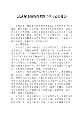 2023年主题教育专题二学习心得体会按照区委、镇党委主题教育安排部署,我牢牢把握以学铸魂、以学增智、以学正风、以学促干的学习要求,坚持以学当先、勤思深悟,通过自学与集体学习相结合的方式,认真学习党的XX大报告,深刻领悟六个必须坚持,对进一步掌握思想体系精髓要义有了更深刻的了解和体会,下面结合近期所学所想,现将学习心得汇报如下:一、学习体会通过学习,我领悟到牢记六个必须坚持,就要永远听党话跟党走,坚持党的领导。旗帜指引方向,方向决定道路。作为党员干部,我们要认真学习宣传贯彻党的XX大精神、学习贯彻XXX新时代中国特色社会主义思想和党的一系列路线方针政策,筑牢信仰之基、补足精神之钙、把稳思想之舵,真正达到以学铸魂、以学增智、以学正风、以学促干的目标要求。始终保持思想更近一步,落实更快一点,让党的暖民心、惠民生、促发展的政策完整、准确、及时落地见效。通过学习,我领悟到牢记六个必须坚持,就要始终坚持人民至上,站稳人民立场。历史是人民书写的。作为党员干部,始终牢记全心全意为人民服务的宗旨,始终牢记中国共产党的伟大历史使命,驰而不息纠治群众身边的不正之风,把好传统带进新征程,将好作风弘扬在新时代。坚持从现实镇情、村情出发,坚持贯彻全过程人民民主,尊重人民群众,遇事和老百姓商量着办,把实事办实,好事办好,实事求是,真心、真意、真情为百姓谋福利。通过学习,我领悟到牢记六个必须坚持,就要使命在肩、责任在胸、冲锋在前。作为党员干部,要深植理论之根,牢筑信仰之基,积极提炼党性修养,永远发挥先锋模范作用。不断适应新形势新任务新命题,常怀为民之心,常做有用之功,常怀若谷之心,常葆奋进之态,以时不我待、只争朝夕的精神投入工作,奋发有为推进党和国家各项事业。要紧密结合镇党委中心工作,求真务实、真抓实干、紧张快干,坚决反对和防止形式主义,务求取得实效。二、存在的突出问题(一)在政治素质方面。一是理论学习不走心不深入,没有做到学干结合、以学促干。没有深刻理解领会精神实质和丰富内涵,总觉着通过集体学习和集中研讨就够用,用什么学什么反而更具针对性。逐步放松了平时的自学和思考,放松了对党性修养的锻炼,平时学习接受新知识比较被动,学习的针对性、实效性不强,导致出现了重抓具体业务、轻理论学习的现象,脱离实际学习理论,不得要领,根源还是在思想上,主要是党性修养不够。比如在专题一学习上,就属于被动学习状态,让学什么就学什么,说到底还是党性修养不够。二是政治站位不高。觉着只要在大是大非面前与党中央保持高度一致就不会有问题,比如在专题一学习中,就对两个确立、XXX新时代中国特色社会主义思想深研细钻不够,学习党的XX大报告精神的力度还不够大,有时不能从政治、从全局角度去思考工作,导致对两个确立的政治意义和深刻内涵把握不准,落实中央重大决策部署和市、区委要求不全面,履行政治责任还不到位。(二)在担当作为方面。一是干事创业的精气神不足,在落实具体工作中,缺乏紧迫感、没有责任感,攻坚克难的冲劲闯劲不足,关键时刻扛不住、危难关头冲不上。二是创新实践不够主动。在大胆实践、勇于探索、攻坚克难的劲头有所欠缺,自己对此虽有认识,但实践的勇气不足,提高素质能力的紧迫感不强,行动还比较缓慢。特别是用好调查研究这项传家宝的意识还不够强烈,研究解决分管工作的新情况、新问题力度不大;贯彻落实上级决策部署不够坚决主动,存在等靠依赖思想。(三)在工作本领方面。一是面对复杂问题时束手无策、无从下手。我是20XX年才到镇工作,之前一直在区直部门历练,农村工作经验明显不足,面对一些历史遗留的矛盾和敏感问题缺少勇气和办法,没有从更高的标准、更深的层次去研究工作、解决问题。工作上对经验丰富的领导和同事有依赖心理,面对困难和问题,总是想着让领导出面解决,挑重担、讲担当的勇气不足。二是在化解信访矛盾、防范化解风险和隐患等本领欠缺。(四)在工作作风方面。一是工作进度缓慢、办事拖拉、人民至上思想树得不牢,遇事明哲保身,斗争精神不强。习惯于走套路、吃老本和用老眼光看新问题,面对工作推进中的困难,信心和勇气不足,缺乏改革创新、锐意进取的精气神。遇到困难,客观因素想的多,主动谋划少,还存在等靠要思想,缺少从高标准抓好信访工作、政法工作的决心和毅力,缺乏瞄准先进的魄力和勇气。二是在开展工作时没有把维护和发展群众利益作为根本出发点和落脚点。比如,有时下村检查调研,仅限于召开座谈会或者跟村干部了解情况,而没有敲开村民家的门,向村民了解实际情况,没有真正做到扑下身子走进村民身边、走进村民心里,没有与群众打成一片,不能主动积极到困难矛盾集中、群众意见多的地方去了解情况、研究问题、思考对策。三、改进工作的措施(一)提升政治素质。始终把学习贯彻XXX新时代中国特色社会主义思想作为首要政治任务,坚持全面系统学