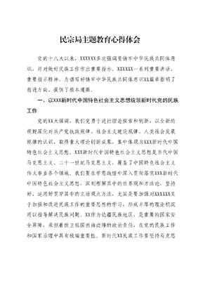 民宗局主题教育心得体会党的十八大以来,XXXXXX多次强调要铸牢中华民族共同体意识,并对做好民族工作作出重要指示。XXXXXX一系列重要讲话、重要指示精神,为谱写好铸牢中华民族共同体意识XX篇章指明了前进方向、提供了根本遵循。一、以XXX新时代中国特色社会主义思想统领新时代党的民族工作党的XX大强调,我们党勇于进行理论探索和创新,以全新的视野深化对共产党执政规律、社会主义建设规律、人类社会发展规律的认识,取得重大理论创新成果,集中体现为XXX新时代中国特色社会主义思想。XXX新时代中国特色社会主义思想是当代中国马克思主义、二十一世纪马克思主义,覆盖了中国特色社会主义伟大事业各个领域。我们要在学思践悟中深入贯彻落实XXX新时代中国特色社会主义思想,深刻理解其中的世界观和方法论,坚持好、运用好贯穿其中的立场观点方法,尤其是要加强对XXXXXX关于加强和改进民族工作的重要思想的学习,形成丰厚的理论积淀用以指导解决民族问题。XX作为边疆民族地区,是重要的国家安全屏障,承担着拱卫祖国西南边陲的政治责任,在党的民族工作和国家治理中具有极端重要性。新时代XX民族工作要坚持马克思主义立场观点方法在XX民族工作中的运用,以边疆民族地区高质量发展的生动实践,彰显XXX新时代中国特色社会主义思想的强大真理力量和实践伟力。二、深刻认识新时代党的民族工作的重要任务XXXXXX指出,必须把推动各民族为全面建设社会主义现代化国家共同奋斗作为新时代党的民族工作的重要任务,这一重要论断,顺应了各族人民对美好生活的向往,体现了民族工作围绕中心、服务大局的根本要求,对动员全国各族人民共同致力于建设社会主义现代化国家,具有重大意义。全面建设社会主义现代化国家是党的重大决策。全面建设社会主义现代化国家是我们党在正确认识和把握社会主义现代化建设规律基础上,综合分析国际国内形势和我国发展,深刻总结和高度概括社会主义建设和改革经验基础上,作出的重大历史决策党的XX大报告指出,要以中国式现代化全面推进中华民族伟大复兴,要支持民族地区加快发展。XXXXXX在视察XX时强调要加强边境地区建设,抓好稳定、发展、生态、强边四件大事,由此可见,在全面建设社会主义现代化国家征程上推进XX民族工作高质量发展,必须要以党的XX大精神为统领,着力推进四个创建,努力做到四个走在前列,奋力谱写雪域高原长治久安和高质量发展新篇章。全面建设社会主义现代化国家必须推动各民族共同走向现代化。我们伟大的祖国是56个民族共同开发的,中华民族的未来也要靠56个民族共同来开创。没有各民族共同团结奋斗就难以实现社会主义现代化,没有各民族共同繁荣发展也不是社会主义现代化。必须突出中国特色、抓住本质要求,立足资源禀赋、发展条件、比较优势等实际,坚持以人民为中心的发展思想,以优化发展格局为切入点,以要素和设施建设为支撑,以制度机制为保障聚焦发展不平衡不充分问题,推动高质量发展,让现代化建设成果更多更公平惠及各族人民,扎实推进共同富裕,不断增强各族群众获得感、幸福感、安全感。全面建设社会主义现代化国家要不断巩固民族团结。一部中国史,就是一部各民族交融汇聚成多元一体中华民族的历史,就是各民族共同缔造、发展、巩固统一的伟大祖国的历史。我国是统一的多民族国家,民族团结是各族人民的生命线,各民族共同团结进步、共同繁荣发展是中华民族的生命所在、力量所在希望所在。中华民族辽阔的疆域是各民族共同开拓的,中华民族悠久的历史是各民族共同书写的,中华民族灿烂的文化是各民族共同创造的,中华民族伟大的精神是各民族共同培育的。全国各族人民要像石榴籽一样紧紧抱在一起,手挽着手、肩并着肩,共同努力奋斗,用汗水共同浇灌出民族团结进步之花,为铸牢中华民族共同体意识积淀深厚的基础,凝聚起全面建设社会主义现代化国家的磅礴伟力。三、准确把握新时代党的民族工作的实践路径党的XX大报告中明确指出:以铸牢中华民族共同体意识为主线,坚定不移走中国特色解决民族问题的正确道路,坚持和完善民族区域自治制度,加强和改进党的民族工作,全面推进民族团结进步事业。科学回答了新时代党的民族工作举什么旗、走什么路、朝着什么样的方向发展这个最重大最根本的问题,为解决民族领域深层次问题提供了强大思想武器,为民族工作取得新的历史性成就提供了根本保证。以铸牢中华民族共同体意识为主线。铸牢中华民族共同体意识的提出与确立,反映了党对民族问题、民族工作规律的认识随时代推移而不断深化和升华的过程。以铸牢中华民族共同体意识为主线是民族工作必须一以贯之的思想纲领和行动指南。长期以来,在党中央的坚强领导下,XX各族人民与全国各族人民休戚与共、荣辱与共、生死与共、命运与共形成了谁也离不开谁的亲密关系,中华民族共同体意识不断巩固和升华。新时代必须把铸牢中华民族共同体意识贯穿XX民族
