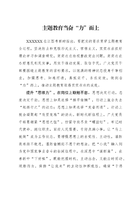 主题教育当奋力而上XXXXXX在江西考察时指出,要把实的要求贯穿主题教育全过程,坚决防止和克服形式主义、官僚主义,实实在在抓好理论学习和调查研究,实实在在检视整改突出问题,实实在在办好惠民利民实事,用实干推动发展、取信于民。广大党员干部要围绕主题教育的目标要求,以饱满的精神状态投身干事创业,加强思考、知难而进,真抓实干、务求实效,做到奋力而上,推动主题教育取得实实在在的成效。提升思维力,在岗位上勤勉不怠。思想决定行动,态度决定干劲。思想上如果选择躺平偷懒,行动上就会失去起而行之的动力;思想上如果选择发奋而进,行动上就会凝聚起攻坚克难的劲头。新时代新征程上,广大党员干部要绷紧思想之弦,拧紧守岗尽责螺丝钉,牢记时代使命、岗位职责,回应人民需要、干好点滴小事,让马上就做成为工作状态。要增强思想上的自觉性、主动性,谨防畏难而不敢进,谨防偷懒而不愿干的想法,把小我融入到为党和国家事业奋斗的壮阔征程中,在深思中谋新篇,在善断中下好棋,既能把握时机、主动出击,又能应时而动、顺势而为,保持让我来的主动性和积极性,确保干得好的质量,争做事业发展的先锋兵。提升攻坚力,在征程上愈战愈勇。前进的道路,会面对巍峨耸立的高峰、蜿蜒曲折的河流、荆棘遍布的草地、冰雪交加的山地,这些挑战,从某种程度上来说,就是党员干部作风的测试卷。面对种种考验,党员干部要以进克难、由进制胜,保持前进更前进、向前再向前的奋斗姿态,在斗争中开拓进取,以上下求索的豪情拓出新路子来,在开展工作的各个方面上多对标,做得不到位的地方多追赶,对于自己不懂的地方多求教,在多多益善中增长知识、丰富经验、锻造本领,成为敢于斗争,更善于斗争的拼搏者。新的赶考之路上,党员干部切不可滋生等靠要的思想,机会等不来,投机取巧靠不住,成功要不来,只有愈战越勇、进而不退,方能赢得最终的胜利。提升实干力,在实践中至情为民。悠悠万事,民生为大。广大党员干部在为民服务中要以久久为功的坚守、一如既往的担当、认真细致的工作干出样子,做人民群众信赖认可的孺子牛。正所谓知屋漏者在宇下,知政失者在草野,广大党员干部不能迈不动步,不能在办公室里翻阅材料打打字、吹着空调不动弹,也不能迈不开步,下基层只到近的地方去,不到远的、难走的地方去。只有深入基层、深入群众,才能通过调查研究把情况摸清楚、摸全面。群众利益无小事。党员干部要勤下基层、勤勉干事,把我将无我的情怀落实在日常的行动中,秉持脚踏实地的工作作风,在行动的坐标上擦亮为民底色。