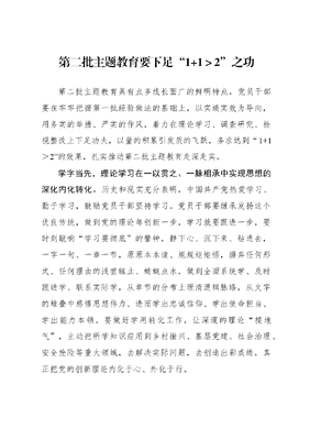 第二批主题教育要下足1+1>2之功第二批主题教育具有点多线长面广的鲜明特点,党员干部要在牢牢把握第一批经验做法的基础上,以实绩实效为导向,用务实的举措、严实的作风,着力在理论学习、调查研究、检视整改上下足功夫,以量的积累引发质的飞跃,务求达到1+1>2的效果,扎实推动第二批主题教育走深走实。学字当先,理论学习在一以贯之、一脉相承中实现思想的深化内化转化。历史和现实充分表明,中国共产党热爱学习、勤于学习,鼓励党员干部坚持学习。党员干部要继承发扬这个优良传统,做到党的理论每创新一步,学习就要跟进一步,要时刻敲响学习要彻底的警钟,静下心、沉下来、钻进去,一字一句、一章一节,原原本本读、规规矩矩悟,摒弃任何形式、任何理由的浅尝辄止、蜻蜓点水,做到全面系统学、及时跟进学、联系实际学,从章节的分布上理清逻辑脉络,从文字的堆叠中感悟思想伟力、进而学出忠诚信仰、学出使命担当、学出能力本领。要做好学用转化工作,让深邃的理论接地气,主动把所学知识应用到乡村振兴、基层党建、社会治理、安全抢险等重大领域,去解决实际问题,去创造出彩成绩,真正把党的创新理论内化于心、外化于行。民字为本,调查研究在一步到位、一探究竟中实现民心的凝聚汇聚集聚。调查研究是开展各项工作的基本功。第二批主题教育更接近基层、更贴近群众,容不得半点的避实就虚、虚与委蛇,必须要用好调查研究这个传家宝。党员干部要把调查研究和常规工作结合起来,真调研、调真研,不走规划路线,一步到位地走向田间地头、邻家大院,拿掉高高在上的架子,屁股端端地坐在群众的炕头上板凳上,跟他们聊家常、唠琐事,善于看脸色、听懂话茬子,从土话方言中把那些欲言又止支支吾吾的事情梳理出来,尤其是就业、医疗、养老、住房等民生领域的突出问题,要刻不容缓、动真碰硬的着手解决,用实干践行承诺,做到不见成效不放手、不听掌声不止步,切实把惠民生、顺民意、暖民心的事办实办好办到位。改字贯穿,检视整改在一气呵成、一严到底中实现问题的即改真改实改。金无足赤,人无完人。发现问题并不可怕,可怕的是不敢面对、不去改正。回看近代以来历史,没有那个政党能够有如此巨大的决心勇气刀刃向内、刮骨疗毒,凭一己之力实现自我完善、自我提高。党员干部要以主题教育为契机,来一场通透的自我革命,全力抓好个人问题整改,以政治、思想、能力、作风、廉洁、纪律等六方面为轴心,向内深挖、向外扩散,真正把问题找准找实找全面。要继续涵养察纳雅言、闻过则喜的胸怀,正视他人批评、接受人民监督,把个人对照和他人反馈结合起来,形成精准详实的问题清单。问题整改不能歇脚松劲,要坚决摒弃嘴上说得天花乱坠、行动上却空空如也的假把式,以严字论英雄,拿出狠招硬招,即知即改、真改实改,最终以问题整改的质效检验主题教育成效。