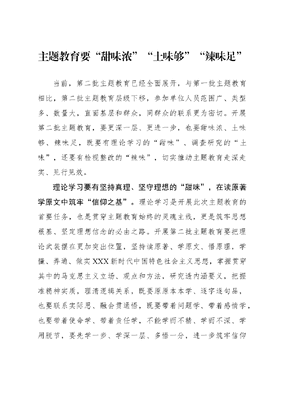 主题教育要甜味浓土味够辣味足当前,第二批主题教育已经全面展开,与第一批主题教育相比,第二批主题教育层级下移,参加单位人员范围广、类型多、数量大,直面基层和群众,同群众的联系更为密切。开展第二批主题教育,要更深一层、更进一步,也要甜味浓、土味够、辣味足,既要有理论学习的甜味、调查研究的土味,还要有检视整改的辣味,切实推动主题教育走深走实、见行见效。理论学习要有坚持真理、坚守理想的甜味,在读原著学原文中筑牢信仰之基。理论学习是开展此次主题教育的首要任务,也是贯穿主题教育始终的灵魂主线,更是筑牢思想根基、坚定理想信念的必由之路。开展第二批主题教育要把理论武装摆在更加突出位置,坚持读原著、学原文、悟原理,学懂、弄通、做实XXX新时代中国特色社会主义思想,掌握贯穿其中的马克思主义立场、观点和方法,研究透内涵要义,把握准精神实质,理清逻辑关系,既要原原本本学、逐字逐句品,也要联系实际思、融会贯通悟,既要带着问题学、带着感情学,也要带着使命学、带着责任学,不能学而不精、学而不深、学用脱节,要先学一步、学深一层、多悟一分,进一步筑牢信仰之基、把稳思想之舵、补足精神之钙。调查研究要有身入一线、心至基层的土味,在察实情访民意中坚守为民之心。调查研究既是当好参谋的奠基石、推动落实的撒手锏,又是服务群众的连心桥、锤炼作风的训练场。第二批主题教育层级下移、直面基层和群众,面对的情况更为复杂、矛盾更为集中,更需要把步子迈下去、身子扑下去、眼睛望过去,到现场看、当面听、直接问,倾听人民的呼声,了解人民的愿望,获取一手资料和鲜活经验,听取一线声音和急难愁盼,真正把民情民意捞上来、把关键问题找出来。要坚持问题导向,善于发现问题,敢于正视问题,主动到偏远的、落后的,矛盾大、纠纷多的地方去,到后院角落走一走、看一看,到群众家里坐一坐、聊一聊,在望闻问切中找准病因、摸准症结。检视整改要有动真碰硬、刀刃向内的辣味,在解难事办好事中展现挺膺之姿。检视整改是一项重要措施,更是确保主题教育取得实在成效的关键环节,检视得是否深刻,整改得是否到位,直接决定了主题教育的成色成效。开展第二批主题教育,要持续加大检视整改的力度,查摆问题不虚晃,分析问题不遮掩,解决问题不手软,哪里问题突出,就聚焦到哪里,哪里矛盾集中,就解决到哪里,从理论学习遇到的、调查研究反映的、推动发展出现的问题抓起,从群众反映最突出、最强烈、最迫切的问题入手,不怕难、不畏险,敢啃硬骨头、敢下深水区,以越是艰险越向前的气魄和不达目的不罢休的决心把问题一个个解决到位,在破解民生难题、增进民生福祉中彰显主题教育成效。