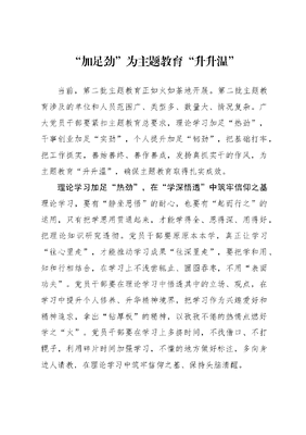 加足劲为主题教育升升温当前,第二批主题教育正如火如荼地开展。第二批主题教育涉及的单位和人员范围广、类型多、数量大、情况复杂。广大党员干部要紧扣主题教育总要求,理论学习加足热劲,干事创业加足实劲,个人提升加足韧劲,把基础打牢,把工作抓实,善始善终、善作善成,发扬真抓实干的作风,为主题教育升升温,确保主题教育取得扎实成效。理论学习加足热劲,在学深悟透中筑牢信仰之基理论学习,要有静坐思悟的耐心,也要有起而行之的运用,只有把学思用贯通起来,才能学得全、思得深、用得好,把理论知识研究透彻。党员干部要原原本本学,真正让学习往心里走,才能推动学习成果往深里走,要把学和用、知和行相结合,在学习上不浅尝辄止、囫囵吞枣,不用表面功夫。党员干部要在理论学习中悟透其中的立场、观点,在学习中提升个人修养、升华精神境界,把学习作为兴趣爱好和精神追求,拿出钻厚板的精神,以孜孜不倦的热情点燃好学之火。党员干部要在学习上多挤时间,不找借口、不打幌子,利用碎片时间加强学习,不懂的地方做好标注,多向身边人请教,在理论学习中筑牢信仰之基、保持头脑清醒。干事创业加足实劲,在勇闯多干中奠定发展之基作风实,发展成果才能实。倘若搭花架子、搞假把式,对应的也只能是注水工程。有多大的担当,就能干成多大的事业。责任意识一旦弱化,在急难险重的任务面前就会撂挑子;党性修养一旦淡化,在工作实践中就会出现懒散拖的现象,这些都不利于事业的发展。党员干部要有闯干上的意识,挑战面前闯出去、事业业绩干出来,新的赛道接续跑,把勇于斗争的豪情拿出来,把热火朝天的劲头干出来,把努力奔跑的姿态亮出来,以锐意进取、开拓创新之姿跑出事业发展加速度,以实干作风铺筑发展之道,多做打基础、利长远的潜功,有担当、有作为,推动事业不断迈上新台阶。个人提升加足韧劲,在奋发有为中提升能力本领室内的盆景经不起风雨,枝干脆弱、花瓣娇嫩。只有生长于广阔天地、常经风霜雨雪的树木才能生长出遒劲之枝,有郁郁葱葱之态。党员干部也如同树木,如果只是躲在室内,贪图舒适圈里的安逸,不愿到基层一线去锻炼自己、开阔眼界,所见的视域是狭小的,所能获取的知识也是有限的,只有多晒太阳、多经风雨,才能够常有所进,实现自我的蜕变。党员干部要做奋发有为的奔跑者,不静坐于办公室的方寸之地,要多到基层、融入群众,自觉走进人民群众生产生活的地方,搭起连心桥,与群众面对面且心连心,用好调查研究传家宝,及时了解群众的急难愁盼,在为群众排忧解难的过程中提升能力本领。