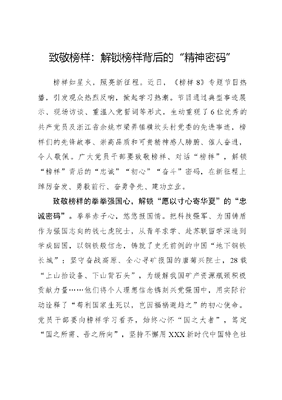 致敬榜样:解锁榜样背后的精神密码榜样如星火,照亮新征程。近日,《榜样8》专题节目热播,引发观众热烈反响,掀起学习热潮。节目通过典型事迹展示、现场访谈、重温入党誓词等形式,生动重现了6位优秀的共产党员及浙江省余姚市梁弄镇横坎头村党委的先进事迹,榜样们的先锋故事、崇高品质和可贵精神感人肺腑、催人奋进,令人敬佩。广大党员干部要致敬榜样、对话榜样,解锁榜样背后的忠诚初心奋斗密码,在新征程上踔厉奋发、勇毅前行、奋勇争先、建功立业。致敬榜样的拳拳强国心,解锁愿以寸心寄华夏的忠诚密码。拳拳赤子心,悠悠报国情。把科技强军、为国铸盾作为强国志向的钱七虎院士,从青年求学、赴苏联留学深造到学成回国,以钢铁般信念,铸就了史无前例的中国地下钢铁长城;坚守奋战高原、全心寻矿报国的唐菊兴院士,28载上山抬设备、下山背石头,为缓解我国矿产资源瓶颈积极贡献力量……他们将个人理想信念镌刻兴党强国中,用实际行动诠释了苟利国家生死以,岂因福祸避趋之的初心使命。党员干部要向榜样学习看齐,始终心怀国之大者,笃定国之所需、吾之所向,坚持不懈用XXX新时代中国特色社会主义思想凝心铸魂,带头弘扬革命先烈精神,汲取榜样臣心一片磁针石的忠诚力量,厚植我以我血荐轩辕的爱国主义精神,把对党忠诚融入血液、刻入骨髓、注入灵魂,将小我融入大我,把个人选择同祖国需要紧密结合一起,心系家国事、肩扛强国责,不忘初心使命,用生命践行党旗下的庄严承诺,争做新时代复兴栋梁强国先锋。致敬榜样的殷殷为民情,解锁一枝一叶总关情的初心密码。民生无小事,枝叶总关情。无论是坚守医者仁心的中国好医生李桂科,为麻风病患者治病、治心、治贫,让麻风院变成幸福村,还是走街串巷、嘘寒问暖的花儿书记热孜万古丽·沙吾提,用心办实事、用情惠民生,赢得百姓称赞,抑或用爱呵护、潜心育人,坚守特教32载的无声世界筑梦人刘玲琍,为折翼天使打开有声世界……他们在平凡的岗位上呕心沥血、甘为人梯、乐于奉献,用一言一行、一点一滴、一举一动生动彰显为民服务的滚烫初心。党员干部要自觉厚植我将无我,不负人民的为民情怀,扎牢为人民服务的根,时刻紧盯群众柴米油盐衣食住行安危冷暖,将民生小事放在心上、抓在手上、扛在肩上,主动深入基层察民情、扑下身子解难题、千方百计纾民困,既要身至更要心至,把群众急难愁盼的小事、微事办好做实,用心用情用力解决群众的烦心事、操心事、揪心事,争做百姓幸福的勤务员孺子牛小棉袄。致敬榜样的笃行实干力,解锁吾将上下而求索的奋斗密码。奋斗是人生底色、成功的阶梯。笃行不怠、潜心探索的刘玲琍,自创舌操教学,帮助聋哑学生走出无声世界;追求卓越、敢为人先的吴惠芳,积极探索乡村四治融合治理模式,带领百姓书写乡村振兴永联样本;抓住机遇、苦干实干的横坎头村党委,大力实施千万工程,实现了乡村完美蝶变,奋力走出一条红色引领绿色发展的康庄大道……他们一步一个脚印,脚踏实地走好每一步,用实际行动诠释了责任与担当。党员干部要以榜样为心标,发扬斗争精神,主动到基层第一线、攻坚克难最前沿的地方去,扎根蹲苗历练,坚决克服畏难怕事、退缩回避、被动应付的消极思想和惯性思维,拿出拼闯精神,以一张蓝图绘到底,一茬接着一茬干的执着真抓实干、埋头苦干、挺膺担当,砥砺滚石上山、爬坡过坎的劲头干事创业、攻坚克难、闯关夺隘,努力成为攻坚克难的奋斗者,起而行之的实干家,争做乡村振兴的领头雁、基层治理的先行者、改革发展急先锋。
