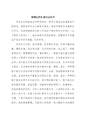 紧绷纪律弦 廉洁过春节甲辰龙年的新春佳节即将到来,党员干部在欢度盛世佳节的同时,要时刻牢记自己的党员身份,避免有损党员形象的言行举止。笔者根据新修订的《中国共产党纪律处分条例》(以下简称《条例》),结合实践中发现的情况,梳理党员干部廉洁平安过节若干提醒,以供参考。言谈举止方面。春节假期,亲友聚会交流,有利于融洽亲情、增进友情,但必须注意,无论何时何地、线上线下、网络里现实中,都要遵纪守法、谨言慎行。一是绝不能在重大原则问题上不同党中央保持一致且有实际言论、行为或者造成不良后果;绝不能公开发表坚持资产阶级自由化立场、反对四项基本原则,反对党的改革开放决策的文章、演说、宣言、声明等;绝不能公开发表违背四项基本原则,违背、歪曲党的改革开放决策,或者其他有严重政治问题的文章、演说、宣言、声明等;绝不能妄议党中央大政方针,破坏党的集中统一;绝不能丑化党和国家形象,或者诋毁、诬蔑党和国家领导人、英雄模范,或者歪曲党的历史、中华人民共和国历史、人民军队历史。如具有上述行为,依据《条例》第四十九条至第五十一条等规定处理。二是严格保守工作秘密。春节期间要遵守保密法律法规规定,保持高度警惕,不能将工作秘密、他人隐私作为炫耀资本和谈资。如泄露、扩散或者打探、窃取党组织关于干部选拔任用、纪律审查、巡视巡察等尚未公开事项或者其他应当保密的内容的,依据《条例》第一百四十四条处理。三是其他失德失范言行。有的春节期间在与他人交往时,颐指气使、口大气粗,甚至酒后失德或者滋事,如损害党员干部形象,视具体情节依据《条例》第一百五十四条处理。有的违背社会公序良俗,在公共场所、网络空间有不当言行,如造成不良影响,依据《条例》第一百五十三条处理。有的生活奢靡,铺张浪费,追求低级趣味,如造成不良影响,依据《条例》第一百五十条处理。礼尚往来方面。人们在春节期间通过礼品、礼金表达祝福礼尚往来是传统习俗。从通报案件看,逢年过节进行利益输送情况时常发生,主要有以下三种情形:一是违规收受礼品、礼金等财物。党员干部不得收受可能影响公正执行公务的礼品、礼金、消费卡(券)和有价证券、股权、其他金融产品等财物,如收受管理和服务对象,包括私营企业主、下级等与职权、职责相关的人员礼品、礼金等财物的,区分情节轻重,可依据《条例》第九十七条第一款处理。即便收受的对象与本人职权、职责没有直接关联,如收受明显超出当地正常礼尚往来的财物的,区分情节轻重,可依据《条例》第九十七条第二款处理。文可居文库——海量学习资料,手机电脑均可下载www.wenkeju.com二是违规赠送礼品、礼金。没有赠送就没有收受。除了收礼者涉嫌违纪外,党员向从事公务的人员及其配偶、子女及其配偶等亲属和其他特定关系人赠送明显超出正常礼尚往来的礼品、礼金、消费卡(券)等财物,如情节较重,依据《条例》第九十八条第一款处理。此外,若以讲课费、课题费、咨询费等名义变相送礼的,如情节较重,可依据该条第二款处理。三是违规用公款购买赠送或者发放礼品、消费卡(券)等。有的慷公家之慨,以办公用品等名义套取公款后购买礼品、消费卡(券)等赠送或作为福利发放,违反中央八项规定精神,区分情节轻重,依据《条例》第一百一十三条规定处理。聚餐娱乐方面。春节期间,亲友聚会往往应接不暇。从查处的案件看,违规聚餐、娱乐等聚会活动主要表现为以下三种情形:一是违规吃喝。春节期间,要严防吃公函吃食堂吃老板吃下级等隐形变异违规吃喝行为。实践中,突出表现为三种类型:1.接受、提供可能影响公正执行公务的宴请。如接受管理和服务对象宴请或者旅游、健身、娱乐等活动安排,视情节严重程度,依据《条例》第一百零一条规定处理。2.违规公款吃喝。有的在没有正当合规的公务接待事由情况下,违反公务接待规定,组织、参加用公款支付的宴请、娱乐等活动,对组织者、参加者等直接责任者和领导责任者,区文可居文库——海量学习资料,手机电脑均可下载www.wenkeju.com分情节轻重,依据《条例》第一百一十三条处理。3.超标准、超范围公务接待或者借机大吃大喝。春节期间,对正常的公务接待活动可按规定安排公务餐。然而,有的假公济私,以过年庆祝为由,违反中共中央办公厅、国务院办公厅《党政机关国内公务接待管理规定》第十条接待对象应当按照规定标准自行用餐。确因工作需要,接待单位可以安排工作餐一次,并严格控制陪餐人数。接待对象在10人以内的,陪餐人数不得超过3人;超过10人的,不得超过接待对象人数的三分之一。工作餐应当供应家常菜,不得提供鱼翅、燕窝等高档菜肴和用野生保护动物制作的菜肴,不得提供香烟和高档酒水,不得使用私人会所、高消费餐饮场所等规定,超过公务接待标准和陪餐人数接待,或者上高档菜肴大吃大喝,根据《条例》第一百一十六条规定,违反接待管理规定,超标准、超范围接待或者借