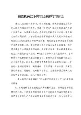 省直机关2024年两会精神学习体会通过几天来的认真学习,我深刻感到,这次全国两会是在中华人民共和国成立75周年、实现十四五规划目标任务的关键之年召开的十分重要的会议,是全国人民政治生活中的一件大事大会的胜利召开,对于动员全党全军全国各族人民更加紧密地团结在以XXX同志为核心的党中央周围,切实把智慧和力量凝聚到党中央决策部署上来,奋力完成今年经济社会发展目标任务,以中国式现代化全面推进强国建设、民族复兴伟业,具有极其重要的意义。特别是在会议期间,XXX先后在参加江苏代表团审议、出席解放军和武警部队代表团全体会议、看望参加全国政协十四届二次会议的民革、科技界、环境资源界委员并参加联组会议时,发表的一系列重要讲话,高屋建瓴、思想深邃、内涵丰富,具有很强的政治性、思想性、战略性和指导性,为推进中国式现代化建设指明了前进方向、注入了强大动力。一要认真学习领会XXX关于因地制宜发展新质生产力的重要指示精神XXX深刻阐释了发展新质生产力的科学方法、行动指南和需要避免的问题,不断拓展和深化新质生产力的理论内涵和实践要求指明了以新质生产力推动高质量发展的前进方向。作为东部发达省份,我们要大力推进自主创新、源头革新,完整、准确、全面贯彻新发展理念,把高质量发展作为经济社会发展方方面面的总要求,自觉全面融入新发展格局,加快转方式调结构,推动形成新的均衡发展的产业结构。同时,要加强科技创新和产业创新深度融合,改造升级传统产业,发展壮大新兴产业,前瞻布局未来产业,致力打造发展新质生产力的模范基地。二要认真学习领会XXX关于提升新兴领域战略能力的重要指示精神XXX深刻洞察世界大势,敏锐把握时代先机,统筹战略性新兴产业和新型作战力量,对新兴领域战略能力建设作出全面布局,对推进新时代强国建设具有重要意义。我们要发挥科研优势,聚焦国家有关规划,承接基础设施布局,加强重点领域需求对接、规划衔接、资源共享,推动新质生产力同新质研发力高效融合、双向拉动,为提升新兴领域战略能力作出应有贡献。三要认真学习领会XXX关于深化关键领域改革的重要指示精神XXX明确指出了需要进一步深化改革的重点领域,部署了一系列重大改革举措,彰显了党中央坚定不移推进全面深化改革的决心。我们要深化科技体制机制改革和工业体制改革,在市场准入要素流动、制度型开放等方面先行先试,打造同新兴领域发展相文可居文库——海量学习资料,手机电脑均可下载www.wenkeju.com适应的创新链、产业链。四要认真学习领会XXX关于加强生态环境保护的重要指示精神XXX再次重申了污染治理的工作方针,明晰了高水平保护和高质量发展的辩证关系,对新时代新征程推进生态文明建设、美丽中国建设提出新的要求。我们要坚持生态优先、绿色发展,促进发展方式绿色低碳转型,推动绿色食品经济全产业链发展,打造生态环境高地。同时,要注重提升生态系统建设质量和稳定性,加快推进绿色低碳发展,为如期实现碳达峰、碳中和作出贡献。五要认真学习领会XXX关于做好新时代政协工作的重要指示精神XXX对人民政协积极建言资政、广泛凝聚共识、助力中国式现代化建设提出了新的更高要求,为做好新时代政协工作提供了根本遵循。我们要深入学习贯彻XXXXXX关于加强和改进人民政协工作的重要思想,全面落实王沪宁主席在全国政协十四届二次会议闭幕会上的讲话要求和全国政协常委会工作报告部署,坚持党的领导、统一战线、协商民主有机结合,发挥人民政协人才荟萃、智力密集、联系广泛的优势,扎实开展调查研究、协商议政、民主监督,完善委员联系界别群众机制,为推进振兴发展汇聚智慧力量。文可居文库——海量学习资料,手机电脑均可下载www.wenkeju.com六要认真学习领会XXX关于做好新时代人大工作的重要指示精神要深入学习贯彻XXXXXX关于坚持和完善人民代表大会制度的重要思想,全面落实赵乐际委员长在十四届全国人大二次会议闭幕会上的讲话要求,按照全国人大常委会报告部署,聚焦中国式现代化中心任务,全面做好立法、监督、代表等工作,推动落实新修订的国务院《组织法》,以高质量人大工作保障高质量发展可持续振兴。要坚持以人民为中心的发展思想,着力补齐民生短板,不断提高公共服务可及性和均等化水平,扎实开展富民行动促进共同富裕,引领各族群众听党话、跟党走。文可居文库——海量学习资料,手机电脑均可下载www.wenkeju.com