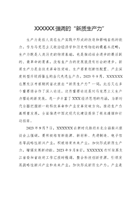 XXXXXX强调的新质生产力生产力是指人类在生产实践中形成的改造和影响自然的能力。作为马克思主义政治经济学和历史唯物论的最基本范畴,生产力既是人类历史的物质基础,也是推动社会进步的最活跃的、最革命的要素,没有生产力的发展就没有社会的进步。新质生产力是由技术革命性突破、生产要素创新性配置、产业深度转型升级而催生的当代先进生产力。2023年9月,XXXXXX在黑龙江考察期间首次提出新质生产力一词,此后又在多个重要场合作了深入论述。这些重要论述是对马克思主义生产力理论的新发展,进一步丰富了XXX经济思想的内涵,为新时代全面把握新一轮科技革命和产业变革突破方向,推动生产力高质量发展,全面推进中国式现代化建设提供了根本遵循和行动指南。2023年9月7日,XXXXXX在新时代推动东北全面振兴座谈会上强调,要积极培育新能源、新材料、先进制造、电子信息等战略性新兴产业,积极培育未来产业,加快形成新质生产力,增强发展新动能。2023年9月8日,XXXXXX在听取黑龙江省委和省政府工作汇报时强调,整合科技创新资源,引领发展战略性新兴产业和未来产业,加快形成新质生产力。产业是生产力变革的具体表现形式。新质生产力是以新产业为主导的生产力,特点是创新,关键在质优,本质是先进生产力。战略性新兴产业与未来产业是形成新质生产力的主阵地,战略性新兴产业对新旧动能转换发挥着引领性作用,未来产业代表着科技创新和产业发展的新方向,二者都是向新而行、向实发力的先进生产力质态。我们要围绕发展新质生产力布局产业链,及时将科技创新成果应用到具体产业和产业链上,加快传统制造业数字化、网络化、智能化改造,培育壮大战略性新兴产业,布局建设未来产业,推动产业链向上下游延伸,形成完善的现代化产业体系,为高质量发展持续注入澎湃动能。2023年12月11日至12日,XXXXXX在中央经济工作会议上强调,深化供给侧结构性改革,核心是以科技创新推动产业创新,特别是以颠覆性技术和前沿技术催生新产业、新模式、新动能,发展新质生产力。新质生产力之新,核心在于以科技创新推动产业创新。发展新质生产力,就是将科学研究的最新发现和技术发明的先进成果应用到具体产业中,不断创造新价值。当前全球新一轮科技革命和产业变革孕育的技术成果已经到了应用转化的临界点,人工智能、生命科学、可控核聚变、量子科技等颠覆性技术和前沿技术进入加快向现实生产力转化的窗口期。培育和发展新质生产力,是把握新科技革命历文可居文库——海量学习资料,手机电脑均可下载www.wenkeju.com史机遇、掌握未来发展主动权、塑造国际竞争新优势、推动经济高质量发展的关键之举。我们要牢牢把握这次新科技和产业变革机遇,整合科技创新资源,优化科技创新体系,强化国家战略科技力量,培育壮大科技领军企业,全面促进科技创新与产业创新协同发展。2024年1月19日,XXXXXX在国家工程师奖首次评选表彰之际作出重要指示强调,希望全国广大工程技术人员坚定科技报国、为民造福理想,勇于突破关键核心技术,锻造精品工程,推动发展新质生产力,加快实现高水平科技自立自强,服务高质量发展,为以中国式现代化全面推进强国建设、民族复兴伟业作出更大贡献。2024年3月6日,XXXXXX在看望参加全国政协十四届二次会议的民革、科技界、环境资源界委员,并参加联组会,听取意见和建议时强调,科技界委员和广大科技工作者要进一步增强科教兴国强国的抱负,担当起科技创新的重任,加强基础研究和应用基础研究,打好关键核心技术攻坚战,培育发展新质生产力的新动能。科技是第一生产力,人才是第一资源,创新是第一动力。人才既是创新的发起者,也是技术应用的实践者,是形成新质生产力最活跃、最具决定意义的能动主体。发展新质生产力,必须不断提高劳动者素质,加快建设国家战略人才力量,努力培养造就更多大师、战略科文可居文库——海量学习资料,手机电脑均可下载www.wenkeju.com学家、一流科技领军人才和创新团队、青年科技人才、卓越工程师、大国工匠、高技能人才。按照发展新质生产力要求,畅通教育、科技、人才的良性循环,完善人才培养、引进、使用、合理流动的工作机制,为发展新质生产力汇聚形成强大的人才支撑。2024年1月31日,XXXXXX在主持二十届中央政治局第十一次集体学习时强调,发展新质生产力是推动高质量发展的内在要求和重要着力点,必须继续做好创新这篇大文章,推动新质生产力加快发展。2024年3月5日,XXXXXX在参加十四届全国人大二次会议江苏代表团审议时强调,要牢牢把握高质量发展这个首要任务,因地制宜发展新质生产力。面对新一轮科技革命和产业变革,我们必须抢抓机遇,加大创新力度,培育壮大新兴产业,超前布局建设未来产业,完善现代化产业体系。高质量发展是全面建设社会主义现代化