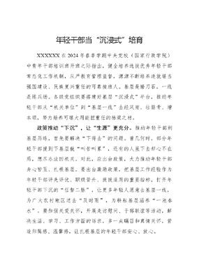 年轻干部当沉浸式培育XXXXXX在2024年春季学期中央党校(国家行政学院)中青年干部培训班开班之际指出,健全培养选拔优秀年轻干部常态化工作机制,从严教育管理监督,源源不断培养造就堪当强国建设、民族复兴重任的可靠接班人。基层是磨刀石,一线是练兵场。各级党组织要搭建好基层沉浸式平台,推动年轻干部从机关单位到基层一线去经风雨、壮筋骨、增本领,努力培养可堪大用能担重任的栋梁之材。政策推动下沉,让生源更充分。推动年轻干部到基层历练,首先要解决下得去的问题。曾几何时,部分年轻干部提到下基层就叫苦叫累,还有的人虽下去却心不在焉,想尽办法回机关。对此,应出台政策,大力推动年轻干部身心皆至、扎根基层。要出台激励政策,把基层工作经验作为年轻干部评先评优、职级晋升、提拔适用的重要指标,打开年轻干部下沉的任督二脉,让更多年轻人愿意去基层一线,为广大农村地区送去及时雨,为耕耘基层涵养一池春水。要加强关爱关怀,开展走访慰问、干部联谊等活动,解决生活、学习、工作方面的诉求,多一点瞩目和真情关怀,营造归属感、温馨感,让扎根基层的年轻干部安心、放心。环境塑造心性,让花朵更茁壮。当代许多年轻干部从小生长在舒适的环境中,很容易被贴上温室花朵的标签。党组织要用有风有雨的基层环境,让年轻干部磨砺心性、造就坚强。坚持下有要求,滴水穿石非一日之功,时限太短会让年轻干部掰着指头过日子,无法一门心思历练,要完善下派、挂职等机制,明确年轻干部到基层工作的年限、达到何种标准等,期满后进行考核,对党员群众、单位同事评价不高的延长时限继续深造。实现下有岗位,多压担子、给任务,让年轻干部在防汛减灾、项目攻坚、森林防灭火等急难险重领域磨练,通过明任务、定目标,使年轻干部负重而行,练就雷厉风行、主动攻坚的决心和意志。实践练就身手,让栋梁更挺立。人需在事上磨,方能立得住。年轻干部需要在实践中反复锻打,才能真正学有所获、学有所值。各级党组织应坚持实干主义,加强对年轻干部的实践教育,推动提升履职能力和工作水平。要注重帮扶培育,通过老党员帮带、手把手示范等方法,把年轻干部带在身边,一起从事产业发展、乡村治理、集体经济等工作,让年轻干部边学边做、学用结合,持续增强干事本领。要推动独立实践,把突发事件、复杂问题处置交给年轻干部,让其大胆干、放心干,在解决当前疑难上立整立改,在破解长远问题文可居文库——海量学习资料,手机电脑均可下载www.wenkeju.com上久久为功,从具体场景中提升实干能力,成长为独当一面、能挑大梁的好苗子。文可居文库——海量学习资料,手机电脑均可下载www.wenkeju.com