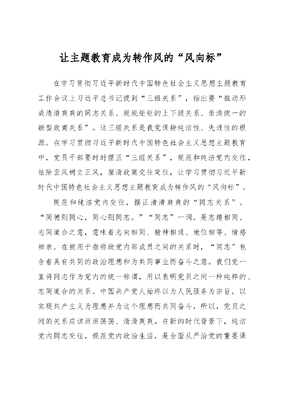 让主题教育成为转作风的风向标在学习贯彻习近平新时代中国特色社会主义思想主题教育工作会议上习近平总书记提到三组关系,指出要推动形成清清爽爽的同志关系、规规矩矩的上下级关系、亲清统一的新型政商关系。这三组关系是我党保持纯洁性、先进性的根源。在学习贯彻习近平新时代中国特色社会主义思想主题教育中,党员干部要时时摆正三组关系,规范和纯洁党内交往,祛除歪风树立正风,厘清政商交往定位,让学习贯彻习近平新时代中国特色社会主义思想主题教育成为转作风的风向标。规范和纯洁党内交往,摆正清清爽爽的同志关系。同德则同心,同心则同志。同志一词,是志趣相同、志同道合之意,意味着志向相同、精神相通、地位相等、情感相亲。在被用于指称政党内部成员之间的关系时,同志包含着具有共同的政治理想和为共同事业而奋斗之意。我们党一直将同志作为党内的统一称谓,用以表明党员之间一种纯粹的、志同道合的关系。中国共产党人始终以为人民服务为宗旨,以实现共产主义为理想并为这个理想而共同奋斗,所以,党员之间的关系应该坦坦荡荡、清清爽爽。在新的时代背景下,纯洁党内同志交往,规范党内政治生活,是全面从严治党的重要课题。倡导清清爽爽的同志关系,也能有效打破各种潜规则意识和小圈子文化,保持共产党人纯洁、坦荡的本色,净化党内政治生态,提高全党的创造力凝聚力战斗力。因此,在奋进新进程中,每一名党员都要有高度的自觉意识,传承弘扬我们党的优良传统,为建立、巩固健康的党内同志关系持续努力。祛除歪风树立正风,摆正规规矩矩的上下级关系。为了顺利推进各项管理职责的运行和顺畅贯彻各项决策决定,做到令行禁止、政令畅通,确立明确的上下级关系是必然的也是必要的。否则,党的政策方针的执行和落实都会陷于无序之状态。但是,党内上下级关系是组织纪律上的约束和服从,也是职务上的隶属和分工,从根本上来说都是为了共同的事业而奋斗,党内的所有同志尽管分工不同、岗位不同、权责不同,但同志关系是平等的,人格上没有高低之别。倘若党员领导干部把自己当成主人,把下级当成仆人,就会把党内关系搞成圈子关系、人脉关系,把上下级之间搞成了拉拉扯扯、吹吹拍拍,党员干部之间就难以对阿谀奉承的歪风说不,就一定会严重损害党的政治生态。领导干部特别是高级干部坚持以身作则、以上率下,以德服人、以能服人,示范引导党员之间相互尊重、关心支持,带头践行规规矩矩的上下级关系,形成头雁效应,带出本单位本部门党内政治生态的山清水秀,让同志情、战友谊回归本真。厘清政商交往定位,摆正亲清统一的新型政商关系。习近平总书记指出,新型政商关系,概括起来说就是亲清两个字。所谓亲,就是党员领导干部要做改革发展的带头人、指挥者、领路人和践行者,就不能不去关心和支持工商业界的创业者和实践者,就不能不与工商界人士保持亲近之关系,任何的疏离、漠然都是不可取也是不允许的;所谓清,就要要在规矩框架之内相处相融,绝不能勾肩搭背、不分彼此,更不能违反法律法规搞权钱交易、利益交换,否则,势必会走上沆瀣一气的泥潭而为人所不齿。摆正亲清统一的新型政商关系,就要始终保持正风反腐高压态势,对政商双方各种违规违纪违法行为零容忍,强化不敢伸手的震慑效应,维护正常的政商交往和市场秩序;要注重制度机制的完善,从制度层面明确政商交往的安全尺度,建立健全防范利益冲突和容错免责的机制,实现政商交往有规有矩、有亲有界;要政企双方相向而行、增进互信,推动形成以清护亲、以亲增清的良性循环。