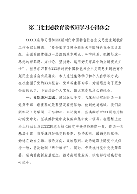 第二批主题教育读书班学习心得体会XXXXXX在学习贯彻XXX新时代中国特色社会主义思想主题教育工作会议上强调,要全面学习领会新时代中国特色社会主义思想,全面系统掌握这一思想的基本观点、科学体系,把握好这一思想的世界观、方法论,坚持好、运用好贯穿其中的立场观点方法。按照学习贯彻XXX新时代中国特色社会主义思想主题教育专题民主生活会有关要求,本人通过集体学习和个人自学等方式,在次重温了党的XX大报告、党章等重要内容,对新思想有了更加全面的认识。下面结合个人实际,跟大家谈几点心得体会。一、做到绝对忠诚。通过这次学习,我深刻认识到作为一名党员干部,最重要的是要坚定理想信念,做到绝对忠诚。我们必须牢记入党誓词,不忘初心,牢记使命,坚决拥护以XXX同志为核心的党中央,坚决维护党中央权威和集中统一领导,在思想上政治上行动上与以XXX同志为核心的党中央保持高度一致。作为一名基层干部,我要继续加强党性修养,坚持原则,增强党性觉悟,始终在政治立场、政治方向、政治原则、政治道路上同党中央保持一致,坚决做到两个维护。同时,带头执行党中央决策部署,坚决贯彻新发展理念,推动高质量发展,以实际行动践行初心使命。二、积极履职尽责。这次学习让我进一步认识到,要坚持全心全意为人民服务的宗旨,积极履行党员领导干部的职责和使命一要坚持人民至上,牢记为民情怀,牢记人民对美好生活的向往努力让人民过上更加美好的生活。二要坚持问题导向,紧紧围绕群众最关心最直接最紧迫的利益问题,努力破解民生难点,让人民群众在发展中有更多获得感、幸福感、安全感。三要坚持目标导向,以打赢脱贫攻坚战、全面建成小康社会为目标,推动工作取得新成效。作为一名基层干部,我要时刻保持谦虚谨慎的工作作风,坚持联系群众,深入基层,倾听群众心声,了解群众所思所盼,努力让人民过上更加美好的生活。我还要不断提高工作能力和执行力,以钉钉子精神抓好各项工作落实,确保党中央决策部署在基层落地生根。三、全力为民服务这次学习让我明确认识到,人民利益高于一切,一切工作都要以是否符合人民意愿、获得人民支持作为最高标准。作为一名基层干部,我要全力为人民服务,坚持以人民为中心的发展思想,努力实现好、维护好、发展好最广大人民的根本利益。首先,要坚持民生导向。着力解决好人民最关心最直接最现实的利益问题,以满足人民日益增长的美好生活需要为出发点和落脚点推动工作,让发展成果更多更公平惠及全体人民。其次,要坚持底线思维。增强忧患意识,始终谨防和克服各种风险挑战,坚决守护人民群众的生命财产安全和其他真正利益。再次,要坚持依法行政。推进依法全面从严治党,坚持法治与德治相结合,依法治国、依法执政、依法行政共同推进,坚持公平正义,保障人民合法权益不受侵害。通过这次学习,我深刻认识到人民利益高于一切,一切工作都要以是否符合人民意愿、获得人民支持作为最高标准。作为一名基层干部,我一定要牢记人民利益至上,坚持人民主体地位,充分调动人民积极性创造性,依靠人民推动工作,努力让人民过上幸福生活。我将进一步提高工作能力和执行力,努力学习贯彻XXX新时代中国特色社会主义思想,坚定理想信念,积极履职尽责,全力为民服务,为全面建成小康社会、实现中华民族伟大复兴的中国梦而不懈奋斗!