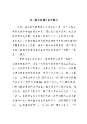 第二批主题教育心得体会当前,第二批主题教育正如火如荼开展,在广大基层干部党员和普通党员中产生了强烈的反响和共鸣,大家纷纷发挥你追我赶、你先我优的学习冲劲,生怕起步太晚、落后太多。为更高标准更高质量推动学习贯彻XXX新时代中国特色社会主义思想,确保主题教育善始善终、善作善成基层干部党员和普通党员必须把握好学习的热度高度强度。一要持续深化理论学习,确保贯穿始终有热度。坚持原原本本学。基层干部党员和普通党员要立足基层实际、岗位职责和工作要求,自觉坐下来、静下心、动脑筋坚持读原著学原文悟原理,坚持干什么学什么,缺什么补什么,主动通读研读《XXX著作选读》《XXX新时代中国特色社会主义思想专题摘编》等学习资料,及时跟进学习XXXXXX最新重要讲话和文章,推动理论学习贯穿全程、持续加温。坚持守正创新学。除了要认真参加党支部三会一课、主题党日活动等组织生活,还要积极投入机关青年理论小组和面向青年的基层宣讲活动,创新利用学习强国、xx党建订阅号、xx讲xx政微信公众号、党课开讲啦、微党课等线上平台,推动党的政策理论入脑入心、走深走实。坚持知行合一学。基层干部党员、普通党员要大力弘扬理论联系实际这一马克思主义优良学风,全面领会运用XXX新时代中国特色社会主义思想的世界观、方法论和贯穿其中的立场观点方法,推动学干结合、以学促干,把学习成效转化为提升政治能力、思维能力、实践能力的强化历练,把学习成效转化为思想大解放、党性大提升、作风大转变、工作大落实的生动实践。二要凝心聚力干事创业,确保发展成果有高度。扎实开展党员志愿服务活动。各基层党员干部要紧扣群众需求,踊跃参与党员亮身份、党群心连心活动,通过主题党日、党员志愿服务队、党员示范岗、践行践诺活动等形式,充分发挥党员先锋模范作用,以实际行动带动引导群众积极投入到志愿服务中,真正实现党旗扬起来、党员动起来、群众笑起来。扎实开展办实事解民忧活动要牢固树立和认真践行以人民为中心的发展思想,深化开展我为群众办实事实践活动,聚焦基层、聚焦群众、聚焦一线,建立完善为民办实事清单,推动解决就业、教育、医疗、育儿、住房、养老等民生领域问题,学习践行新时代枫桥经验浦江经验,扑下身子、沉下一线开展接访下访,用心用情用力解决好群众的烦心事操心事揪心事。扎实开展立岗位作贡献活动。各基层党员干部要着重增强推动高质量发展本领、服务群众本领、防范化解风险本领,进一步提振干事创业精气神,自觉投身经济发展主战场、为民服务一线、攻坚克难最前沿,带头参与党员应急突击队,敢于在抗击自然灾害、应对突发事件等关键时刻冲在前、作表率。三要从严从实检视整改,确保刀刃向内有强度。注重强化政绩观检视。基层干部党员、普通党员要深刻领会正确政绩观的的丰富内涵,深刻理解政绩为谁而树、树什么样的政绩、靠什么树政绩这一重大问题,深刻把握树立和践行正确权力观、政绩观、事业观的实践要求,自觉检视查摆政绩观问题,要胸怀国之大者,厚植为民情怀,不搞脱离实际的盲目攀比、不搞劳民伤财的大干蛮干,真正做到把为民造福作为最重要的政绩。注重强化党性分析。要严格落实真查实改、动真碰硬的要求,坚持边查、边改、边立,主动对照XXX新时代中国特色社会主义思想,对照党章党规党纪,对照人民群众的意见建议,从政治觉悟、党员意识、为民服务、遵规守纪、道德操守、作用发挥等方面找差距、查根源、明举措,切实解决思想不纯、作风不正、意识不强等问题,努力涵养过硬的政治品格,永葆共产党人的政治本色。注重强化批评和自我批评。古人常云,吾日三省吾身。XXXXXX也多次强调,批评和自我批评这个武器要经常用,越用就越灵。基层干部党员、普通党员要坚持问题导向、强化求解思维,认真严肃对待党支部专题组织生活会,把自己摆进去、把职责摆进去、把工作摆进去,精准查摆理论学习、政治素质、能力本领、担当作为、工作作风、廉洁自律等6个方面突出问题,结合实际深挖思想根源,深刻进行自我检视,深入开展批评和自我批评,开诚布公谈心交心,着力从思想上根源上解决问题。