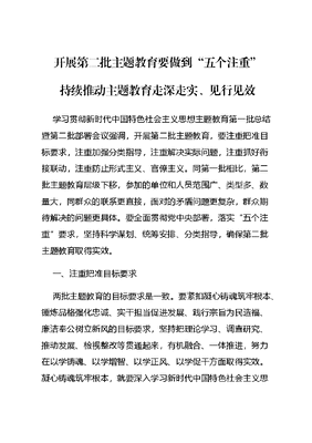开展第二批主题教育要做到五个注重持续推动主题教育走深走实、见行见效学习贯彻新时代中国特色社会主义思想主题教育第一批总结暨第二批部署会议强调,开展第二批主题教育,要注重把准目标要求,注重加强分类指导,注重解决实际问题,注重抓好衔接联动,注重防止形式主义、官僚主义。同第一批相比,第二批主题教育层级下移,参加的单位和人员范围广、类型多、数量大,同群众的联系更直接,面对的矛盾问题更复杂,群众期待解决的问题更具体。要全面贯彻党中央部署,落实五个注重要求,坚持科学谋划、统筹安排、分类指导,确保第二批主题教育取得实效。一、注重把准目标要求两批主题教育的目标要求是一致。要紧扣凝心铸魂筑牢根本、锤炼品格强化忠诚、实干担当促进发展、践行宗旨为民造福、廉洁奉公树立新风的目标要求,坚持把理论学习、调查研究、推动发展、检视整改等贯通起来,有机融合、一体推进,努力在以学铸魂、以学增智、以学正风、以学促干方面取得实效。凝心铸魂筑牢根本,就要深入学习新时代中国特色社会主义思想,完整准确掌握这一思想的主要内容,全面把握这一思想的世界观、方法论和贯穿其中的立场观点方法,深刻理解这一思想的道理学理哲理,推动党员、干部真学真懂真信真用,真正把当代中国马克思主义的看家本领学到手,筑牢信仰之基、补足精神之钙、把稳思想之舵。锤炼品格强化忠诚,就要深刻领悟两个确立的决定性意义,增强忠诚核心、拥戴核心、维护核心、捍卫核心的政治自觉、思想自觉、行动自觉,不断提高政治判断力、政治领悟力、政治执行力,真正做到以党的旗帜为旗帜、以党的意志为意志、以党的使命为使命,真心爱党、时刻忧党、坚定护党、全力兴党。实干担当促进发展,就要突出实践导向,牢固树立和践行正确政绩观,增强责任感和使命感,不断提高推动高质量发展本领、服务群众本领、防范化解风险本领,真抓实干、务求实效,以时时放心不下的责任感、积极担当作为的精气神履好职、尽好责,以新气象新作为推动高质量发展取得新成效。践行宗旨为民造福,就要牢固树立以人民为中心的发展思想,把为民办实事作为重要内容,以群众满意不满意作为根本评判标准,紧紧抓住人民群众最关心最直接最现实的利益问题,把惠民生、暖民心、顺民意的工作做到群众心坎上,让现代化建设成果更多更公平惠及全体人民。廉洁奉公树立新风,就要坚持以党性立身做事,践行三严三实,坚决反对特权思想和特权现象,把纠治形式主义、官僚主义摆在更加突出的位置,做到公正用权、依法用权、为民用权、廉洁用权,始终保持共产党人的政治本色。二、注重加强分类指导层级下移、点多面广,基层单位多、行业差别大,是第二批主题教育的突出特点。第二批主题教育要更加注重分类指导,在抓好理论学习、调查研究、推动发展、检视整改等措施落实的同时,针对不同层级、不同领域、不同对象提出不同工作要求,不搞一刀切。市县党政机关要深入学习关于主题教育系列重要讲话精神、关于树立和践行正确政绩观的重要论述,围绕推动党的XX大精神落地见效,推动中国式现代化建设,全力推动高质量发展,不折不扣贯彻落实党中央重大决策部署特别是关于做好下半年经济工作的部署要求,把主题教育成果体现到高质量发展的成效上、体现到促进中心工作,推动高质量发展有新突破、人民生活品质有新提升。乡镇、街道(村、社区)要深入学习领会领导人有关重要讲话精神,着力解决推动政策落地、强化基层治理、为民办事服务、化解社会矛盾、建强基层组织等方面突出问题,切实在巩固拓展脱贫攻坚成果、加快乡村振兴、提高基层治理能力、提升服务群众质效中主动作为、担当有力。医院要深入学习领导人关于卫生与健康的重要论述,紧扣落实党委领导下的院长负责制度、净化医药行业生态、提高医疗服务水平,深入查找分析医院在发展方式、运行机制、资源配置等方面的问题短板,破解医院高质量发展难题。各级各类学校要深入学习领导人关于教育的重要论述,推动学校领导班子及成员紧紧围绕立德树人根本任务,深入查找并解决深化教育教育改革中的问题以及师生、家长反映强烈、社会关注的热点难点问题,提高教育教学质量,办好人民满意教育。新经济组织、新社会组织、新就业群体要深入学习关于民营经济发展重要论述和关于非公企业和社会组织党建工作重要指示,扩大党的组织和工作覆盖,既要注重有形覆盖,更要注重有效覆盖,充分发挥党的政治优势和组织优势,引导和促进非公企业和社会组织健康发展。三、注重解决实际问题第二批主题教育离群众最近,解决实际问题尤为重要。坚持边学习、边对照、边检视、边整改,把问题整改贯穿主题教育始终,让人民群众切实感受到解决问题的实际成效。发现问题要精准。当前,要聚焦理论学习、政治素质、能力本领、担当作为、工作作风、廉洁自律,主动放下架子、俯下身子、迈开步子,沉到困难大、矛盾问题多的地方去,直达痛点、难点、堵点一线,了解基层真情况、倾听群众真心声,真正掌握第一手沾泥