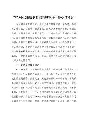 2023年度主题教育读书班领导干部心得体会自主题教育开展以来,各级党组织牢牢把握学思想、强党性、重实践、建新功的总要求,深入开展专题式学悟、课题式学研、主题式学践、问题式学改,以到一线去专项行动为载体,推动主题教育更加具有基础性、实践性与创新性。把强基铸魂彰显担当贯穿始终,不断提高政治判断力、政治领悟力、政治执行力,自觉从伟大思想中寻找破解发展难题的金钥匙将主题教育焕发出来的学习、工作热情转化为高质量发展的实际成效、干事创业的强大动力。下面,我结合自己的学习体会,与大家共同交流学习。一、始终坚定理想信念XXXXXX指出:理想信念是共产党人政治灵魂,是共产党人精神支柱。这句话告诉我们,无论风雨兴衰,我们要始终坚定我们的理想信念。回顾党史,无论是长征中的千难万险,还是改革开放中的坎坷曲折,党员始终坚守初心,信仰党的事业。实际案例中,我们可以看到党员在不同领域取得了骄人成绩,如科技教育、文化等等。下一步,我们要不断强化党员的政治觉悟,加强党性修养,深化对XXXXXX新时代中国特色社会主义思想的学习使理想信念更加坚定。同时,我们要积极践行社会主义核心价值观,传递正能量,引领社会风尚。二、始终勇于担当作为。XXXXXX提出:干部要胸怀全局,善于担当,有担当精神,有担当本领。这句话告诉我们,作为共产党员,我们要勇于担当,为党和人民的事业勇往直前。党史中,我们可以看到一位位杰出的共产党员,不畏困难,勇挑重担最终圆满完成各项任务。下一步,我们要以更大的担当精神,更强的担当本领,积极投身到工作中,为实现党的事业、人民的幸福,竭尽全力,不怕艰难险阻,迎难而上,开创更大的辉煌。三、始终锤炼务实作风。XXXXXX强调:干事创业要有务实作风,解决问题要有务实作风,团结人民要有务实作风。这句话告诉我们,务实作风是我们党的优良传统,是我们党员必备的品质。党史中,我们看到无数共产党员坚守务实,为党的事业默默奉献,默默付出。下一步,我们要更加注重实际行动,注重实际效果,解决问题的方法要更加务实,不空谈套话,不浮夸风格做实事、办实事,为人民群众解决实际问题。四、始终站稳群众立场。XXXXXX强调:我们党要永远同人民群众站在一起,为人民群众办事,一切从人民群众出发,一切依靠人民群众。这句话告诉我们,党员要时刻牢记群众利益,站稳群众立场,心系人民,深入基层,了解群众需求。党史中,我们看到党员深入一线,关心民生,为群众办实事,取得了广泛信任和支持。下一步,我们要更加注重倾听群众声音,解决群众关切的问题,全心全意为人民服务,争取更多人民的拥护和信任做一个有血有肉、贴近人民的共产党员。